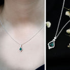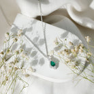Experience the captivating allure of our Lab Grown Emerald Pendant Necklace, crafted from exquisite 14k white gold plated sterling silver. Adorned with dazzling moissanite stones and a beautiful lab grown emerald, this Art Deco Necklace with Chain is designed to make a memorable impact and enhance any ensemble. The pendant features an elegant design, showcasing a prong set 5X7 MM pear cut lab created emerald at its heart, surrounded by petite moissanite gems that also embellish the distinctive bail for extra sparkle. With its understated vintage-inspired elegance, this Emerald Teardrop Necklace perfectly complements your fashion sense. The rich green tone of the emerald exudes sophistication and charm, making it an ideal accessory for any event. This Emerald Statement Necklace is perfect not just as a Wedding Necklace for Brides but also for cocktail gatherings as a chic fashion piece, as a thoughtful gift for birthdays, anniversaries, or Valentines Day for someone dear, or even worn on your special day for a breathtaking contrast.