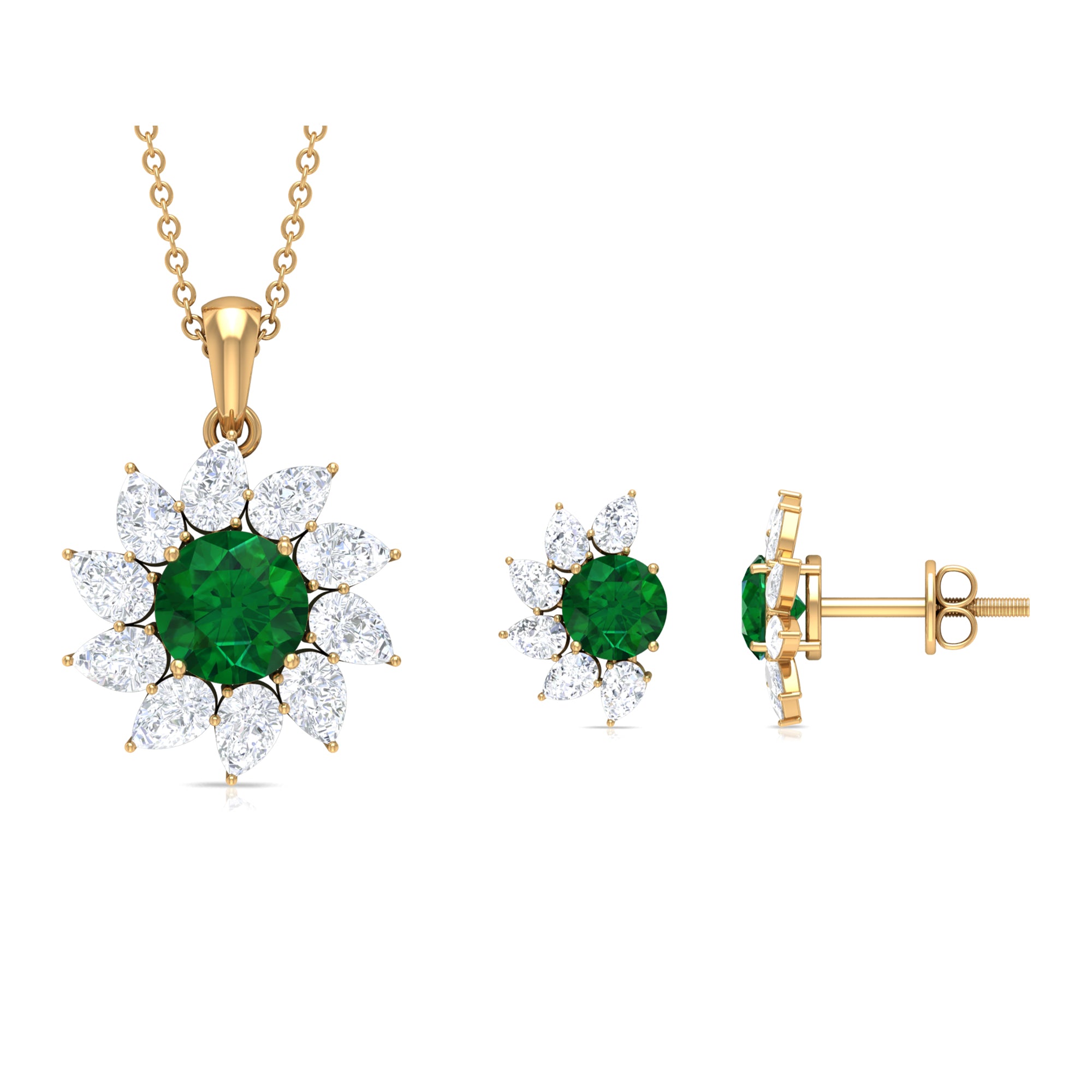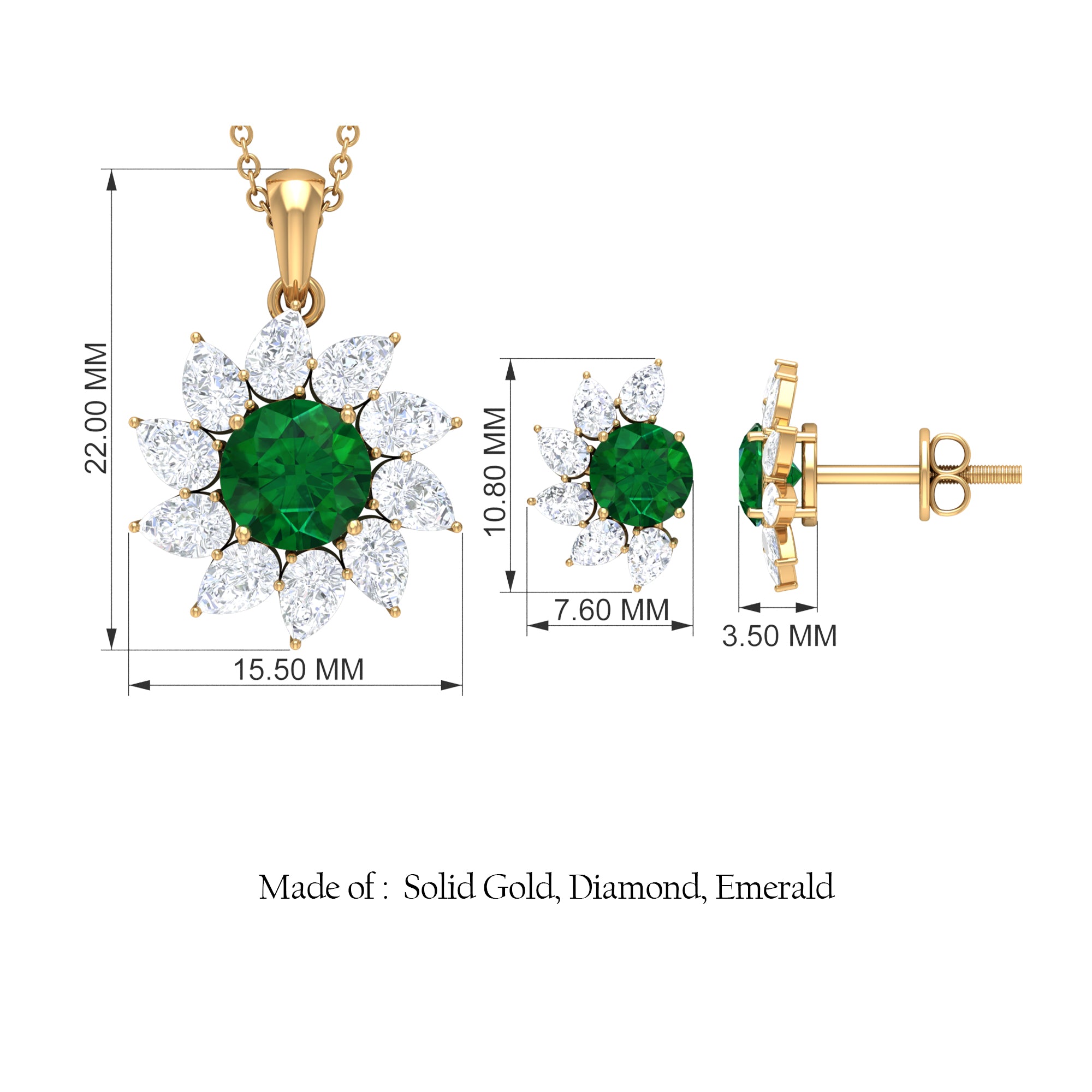 Elevate your style with this mesmerizing Flower Jewelry Set, crafted to add a graceful glow to any look. The Pendant steals the spotlight with its vibrant Round Shape Lab Created Emerald at the center, beautifully framed by a halo of Pear Shaped Lab Grown Diamond stones that create a delicate floral design. Paired with matching Stud Earrings featuring Lab Created Emerald with a charming Half Halo of Pear Shape Lab Grown Diamond stones, this Lab Emerald Jewelry Set brings harmony, sparkle and color together effortlessly. The earrings come with secure Screw Back Closure for all-day comfort, while the pendant includes a sleek Chain. Perfect for special occasions or to elevate your daily outfits, this Pendant and Earring Set pairs beautifully with everything from evening gowns to a wedding ensemble. Presented in a signature jewelry box, it also makes an unforgettable gift for someone who loves timeless beauty with an ethical twist. Whether worn together for a coordinated look or styled separately for subtle sophistication, this Lab Emerald Necklace and Earring Set is designed to shine with every wear, bringing charm and elegance to every moment.