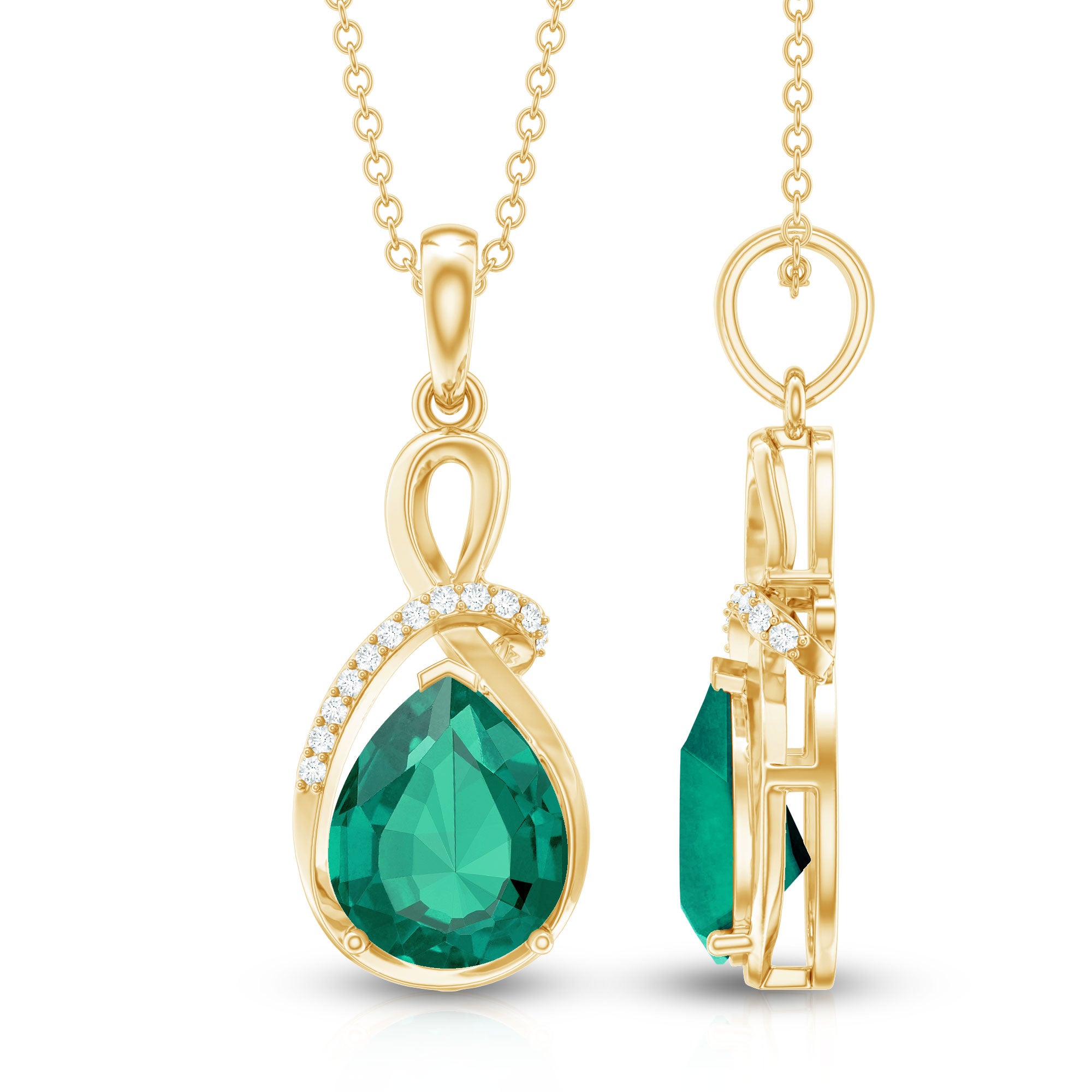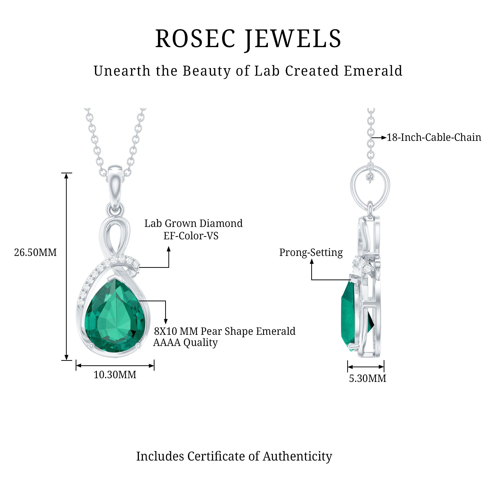 Elevate your gift-giving with our exquisite Minimal Lab Created Emerald Pendant Necklace. This stunning piece is designed to captivate her heart with its timeless elegance. The centerpiece boasts a lustrous 8x10 mm Pear Shaped Lab Created Emerald, encased in a delicate metal frame embellished with Round Lab Grown Diamonds on one side. Each diamond sparkles, echoing the romantic tales whispered by the soul of the Aaaa Quality Emerald. The craftsmanship and attention to detail make this necklace a symbol of enduring love and sophistication. Crafted by Rosec Jewels, a master in creating extraordinary jewelry from lab grown gemstones, this Emerald Diamond Necklace is not just a piece of jewelry but a radiant expression of your feelings.