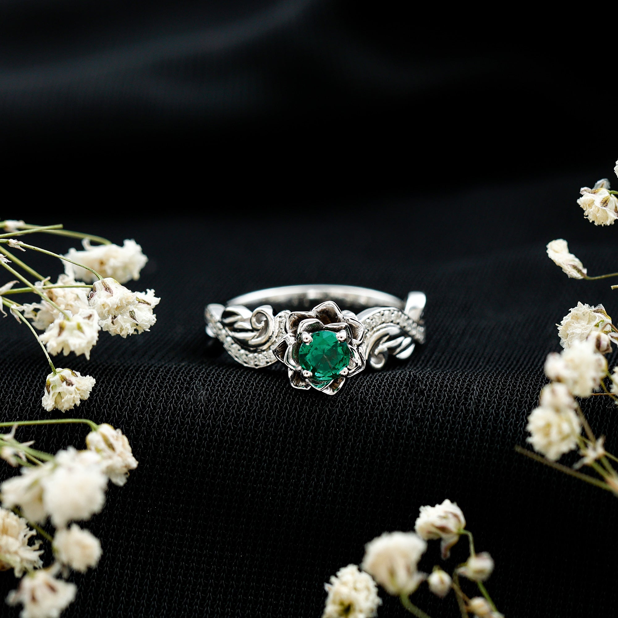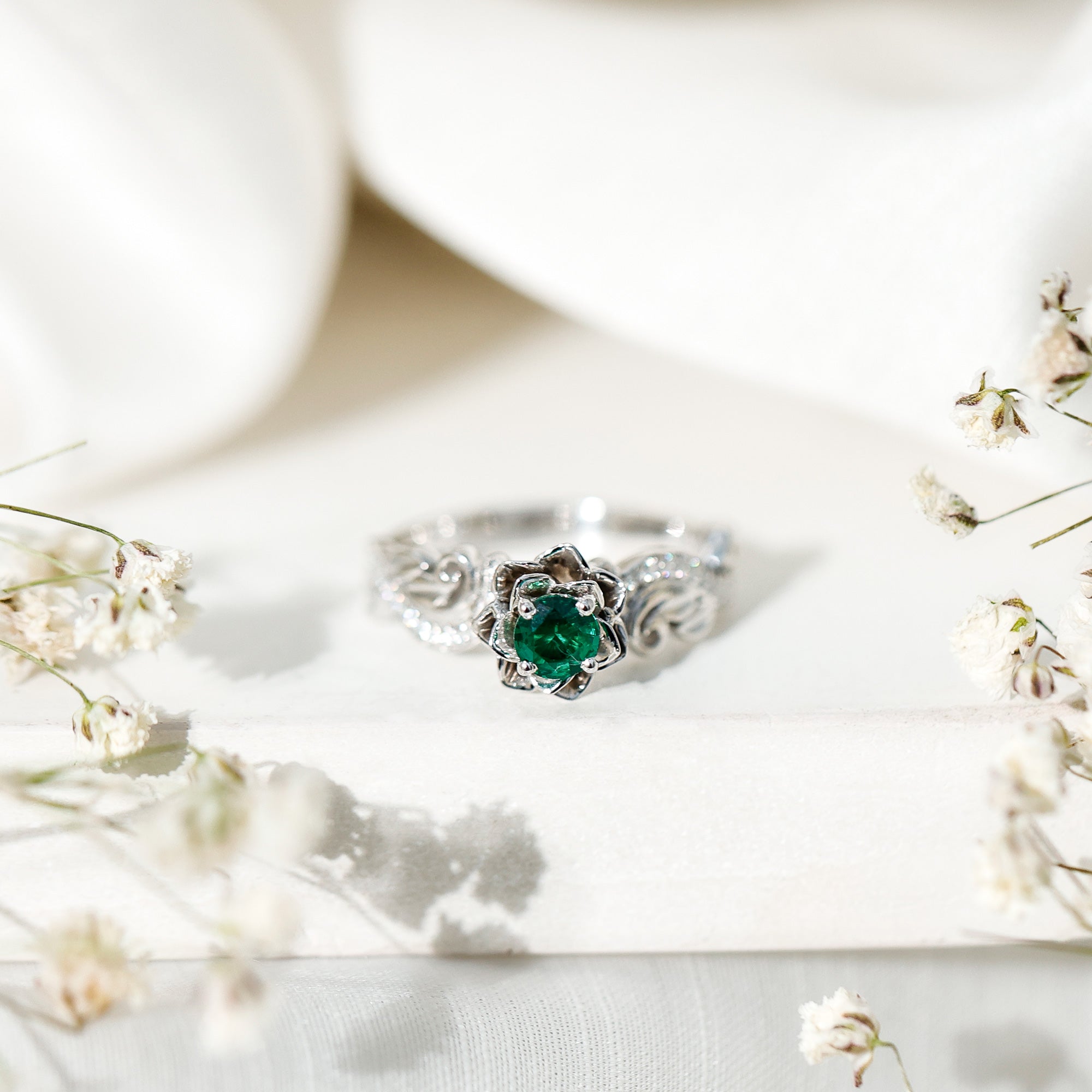 The setting is designed in a flower-inspired style, framing the emerald with petal-like detailing.