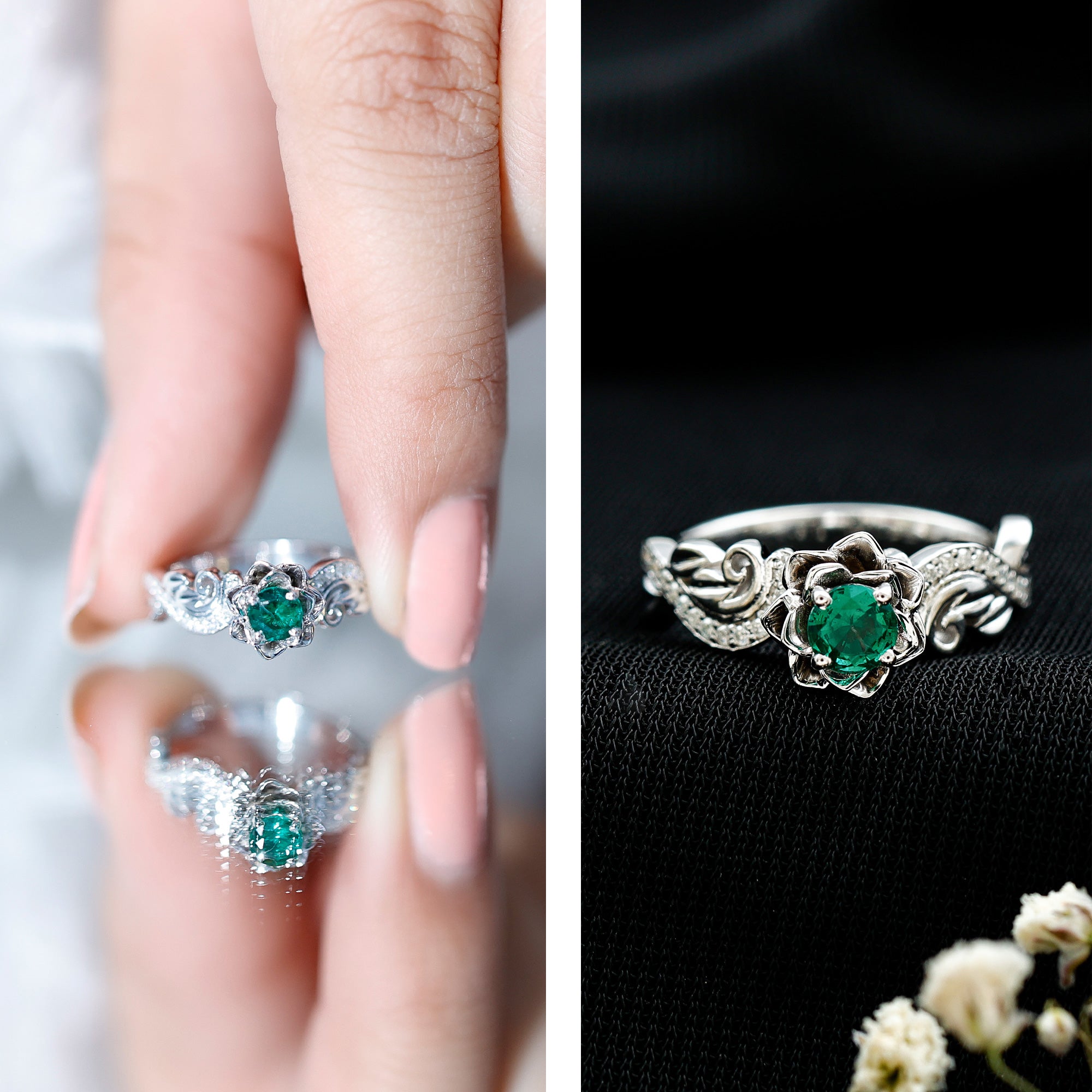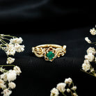 The flower-inspired setting frames the emerald in a petal-like arrangement, adding dimension and visual interest. This design highlights the center stone while maintaining a harmonious overall profile. The structured setting keeps the gemstone secure, while the decorative elements provide a refined, feminine touch without overwhelming the design.