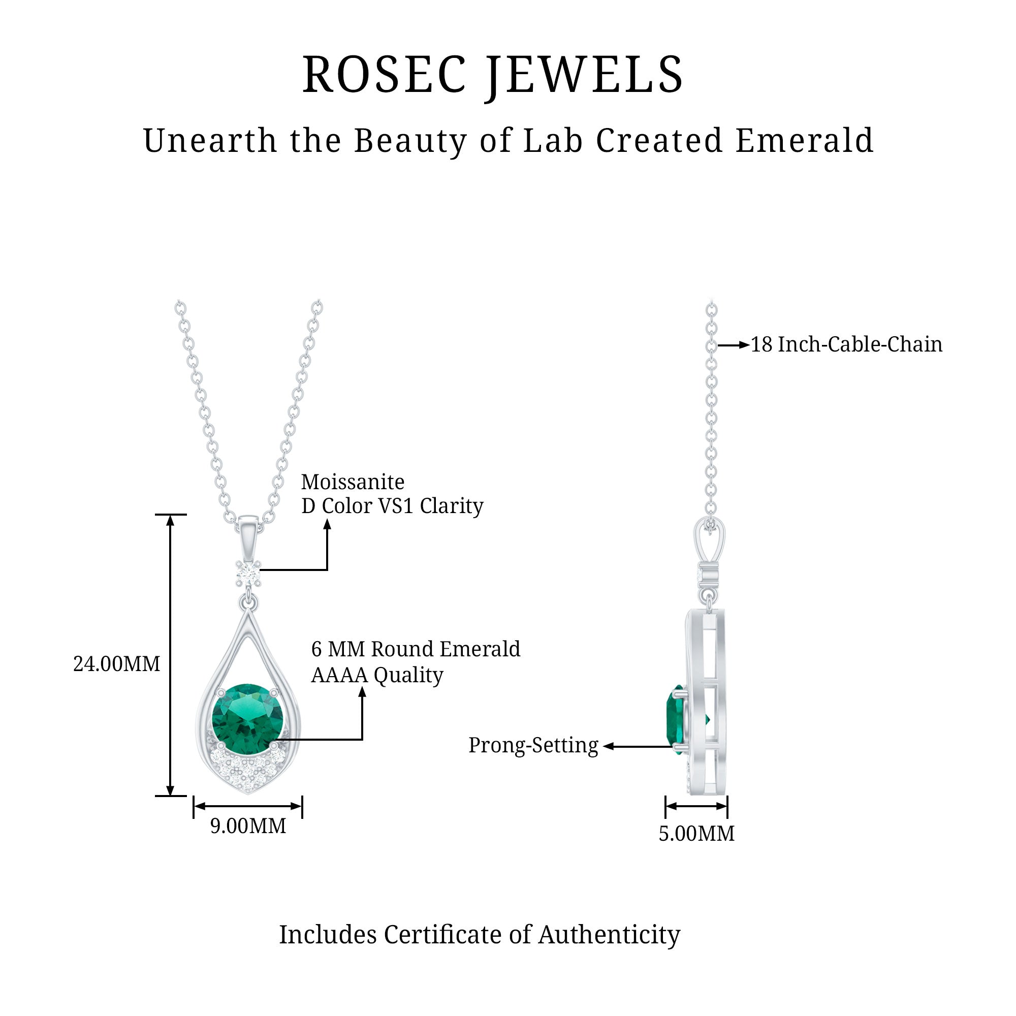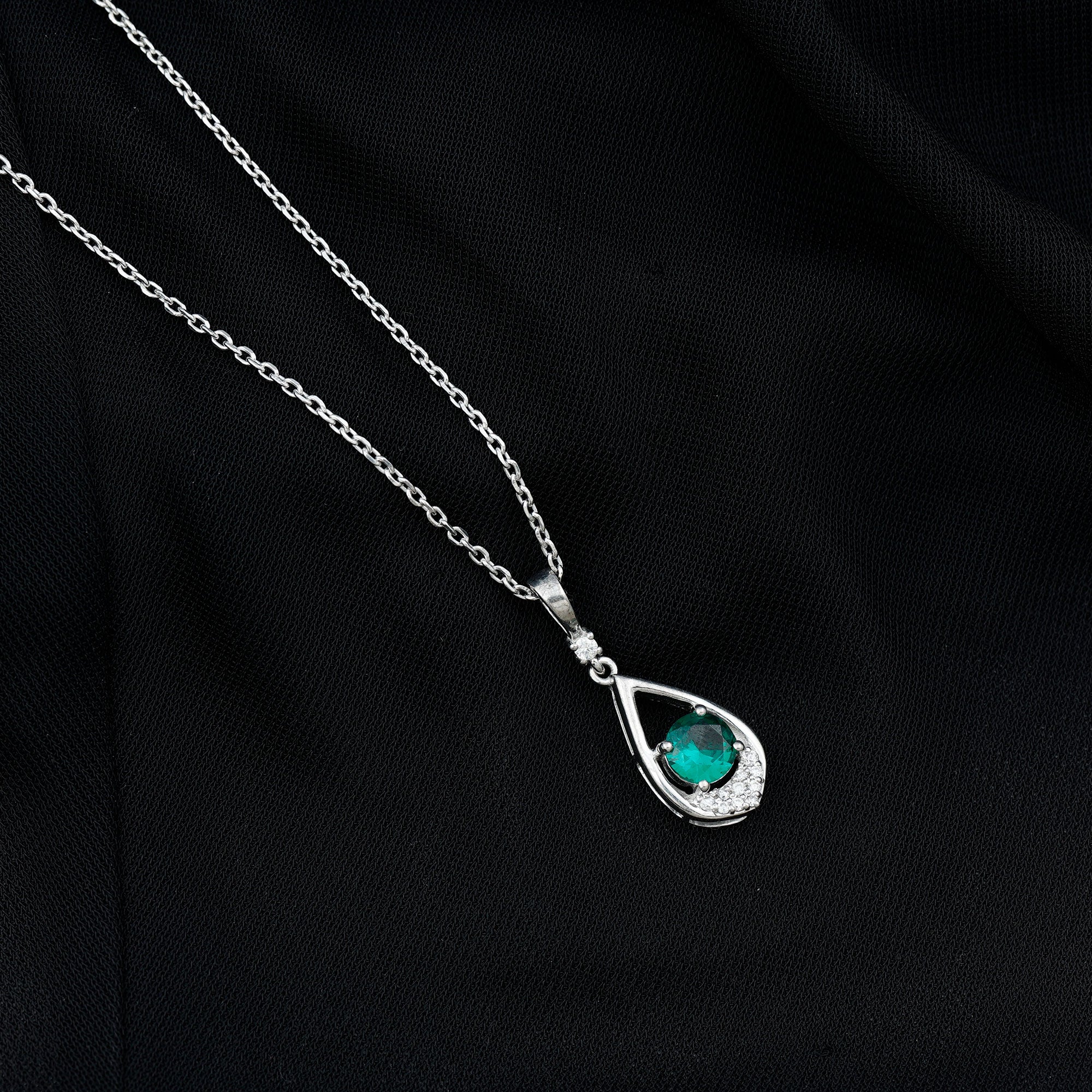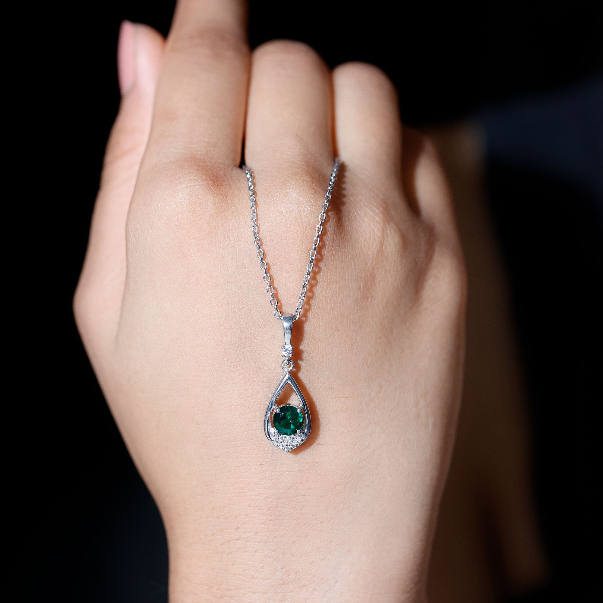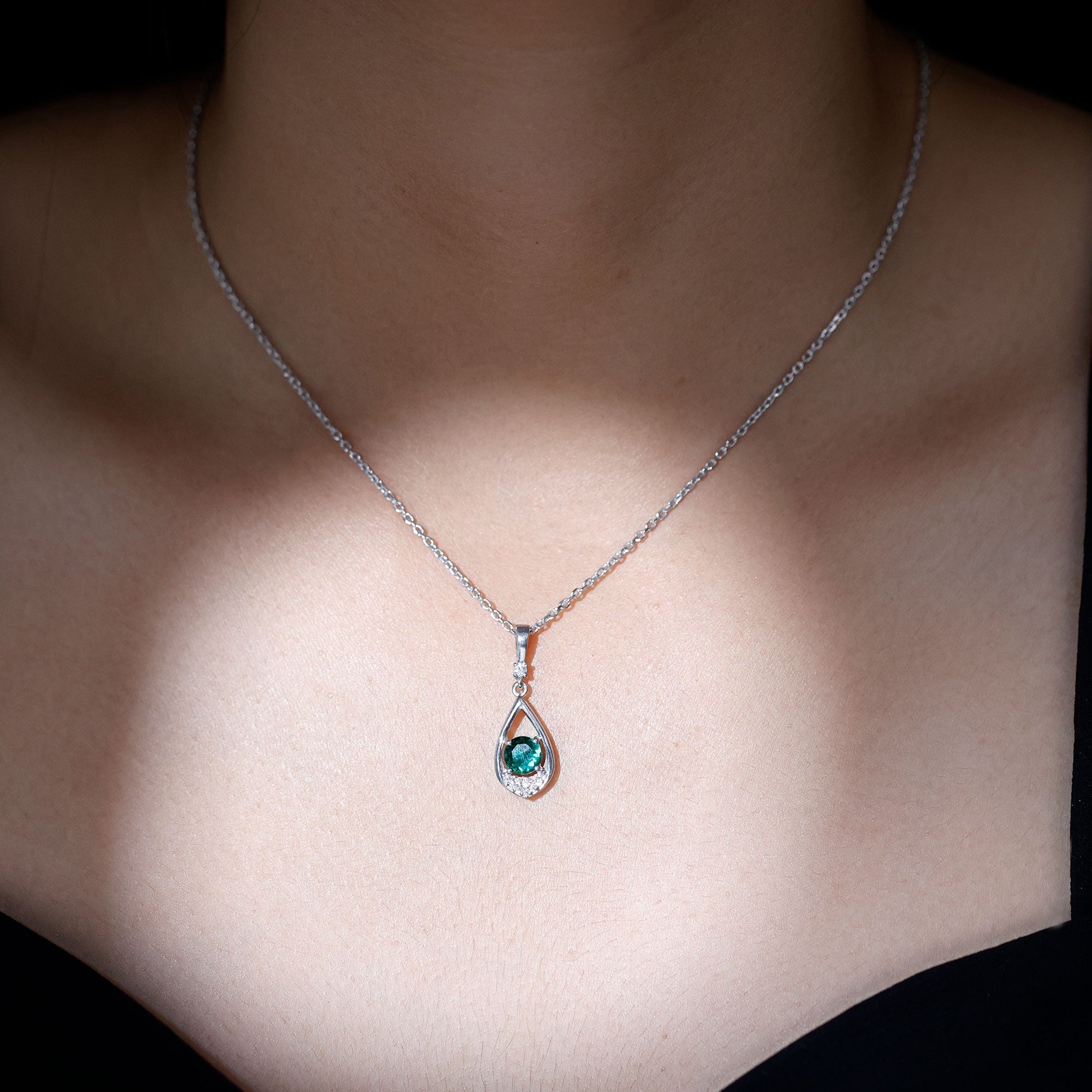 Add a green hue to your overall look with this Lab Grown Emerald Pendant crafted with 14K White Gold Plated Silver. The Teardrop Pendant Necklace is more than just jewelry, it is a symbol of grace, emotion, and mindful luxury. It features a soft, fluid shape which mirrors a teardrop decorated with a 6 MM Round Shape Lab Created Emerald secured in Prong Setting at the center. The bottom of the teardrop frame is encrusted with a cluster of round cut moissanite stones, while a single stone connects the frame with the bail. This Emerald and Moissanite Necklace symbolizes loyalty and wisdom, which makes it a perfect gift for your better half. It feels like a whisper of elegance against your skin, perfect for everyday wear and meaningful enough for special occasions. Our Green Emerald Necklace is a piece of jewelry that connects you to your inner calm while letting the world see you shine. We create this piece with lab grown AAAA quality emerald stone, so it makes a conscious choice for your big day. The pendant will be delivered to you in premium-quality packaging with a certificate of authenticity.