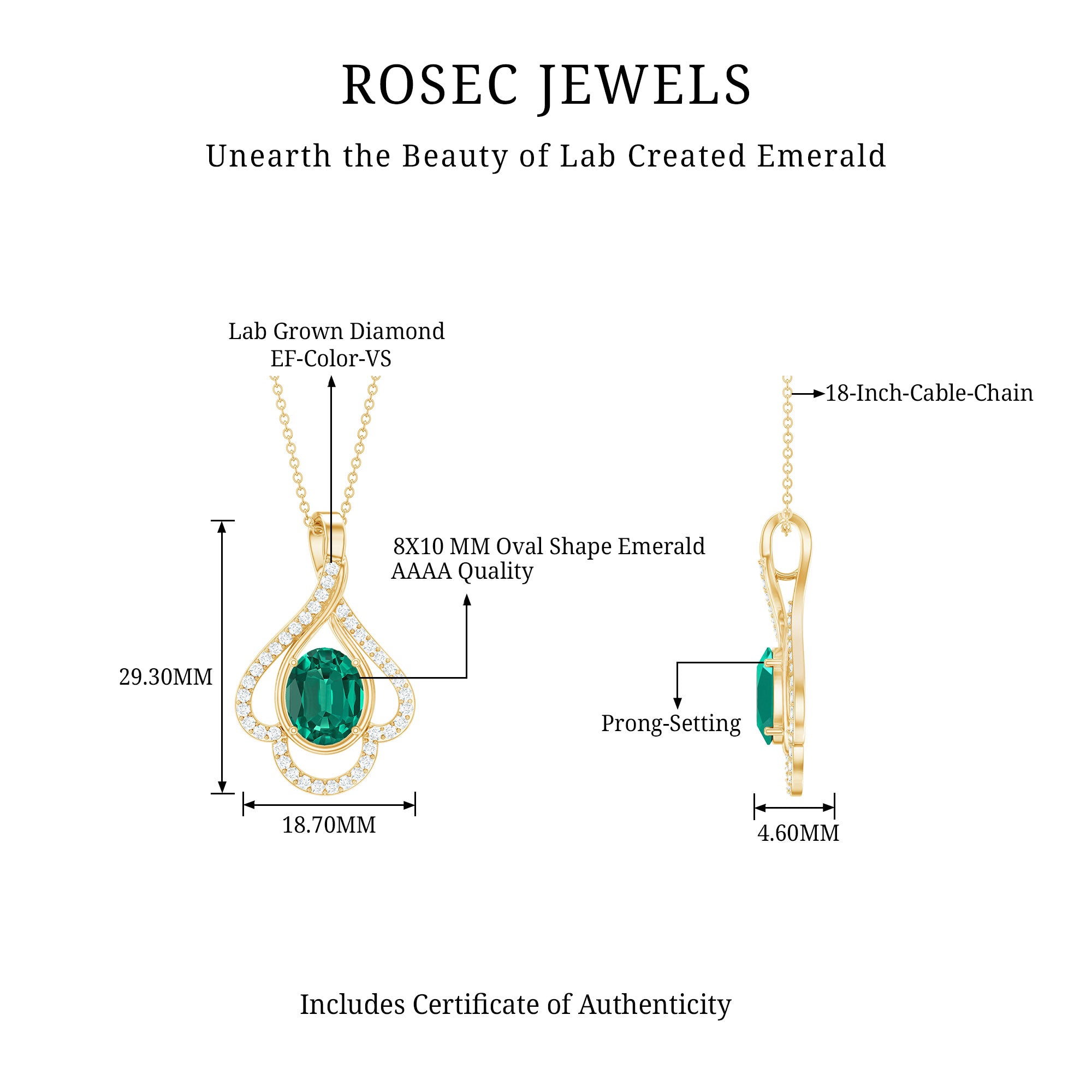 Introducing our timeless Minimal Lab Created Emerald Pendant Necklace adorned with radiant Simulated Diamond to ignite your style. The central placement of 8X10 MM Oval Shaped Lab Created Emerald is the heart of this piece and Round Diamonds (Lab Created) studded on Floral Petal Frame. Take a chance to adorn your neckline with unparalleled grace and beauty through this Designer Pendant. Green hue of AAAA Quality Emerald and shining radiance of EF-VS Quality Diamonds in this pendant will make your day, try it!