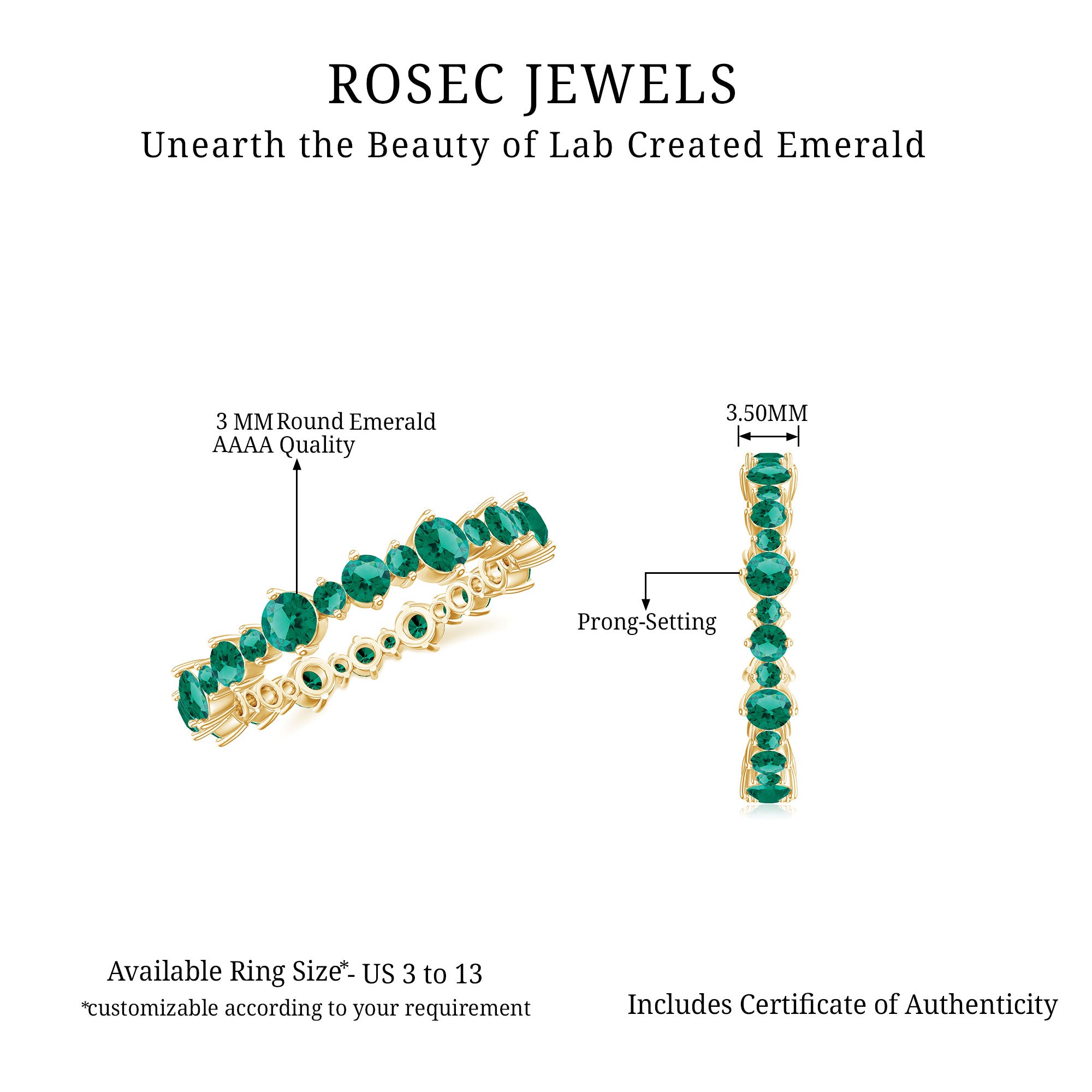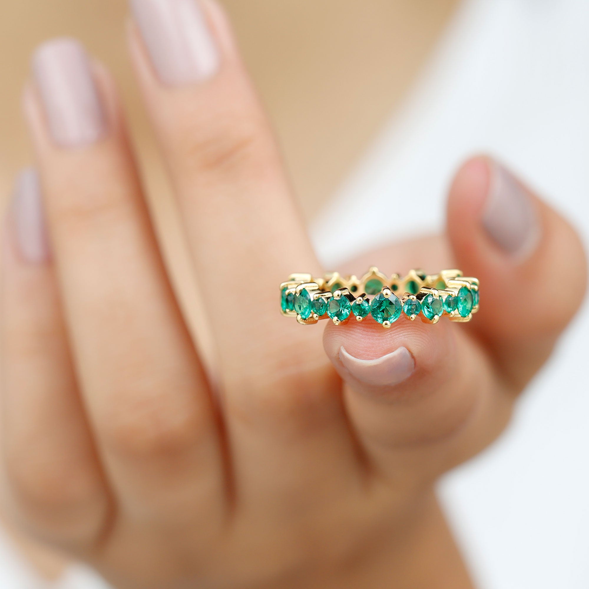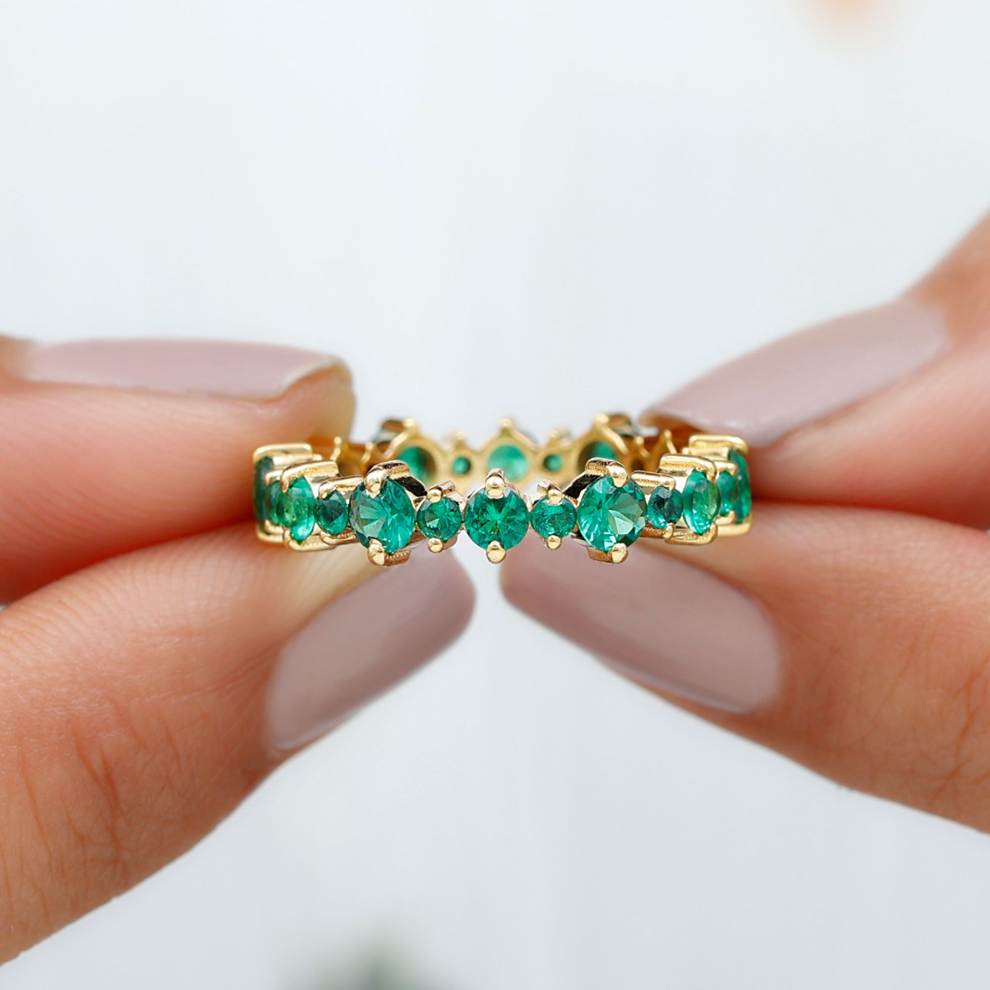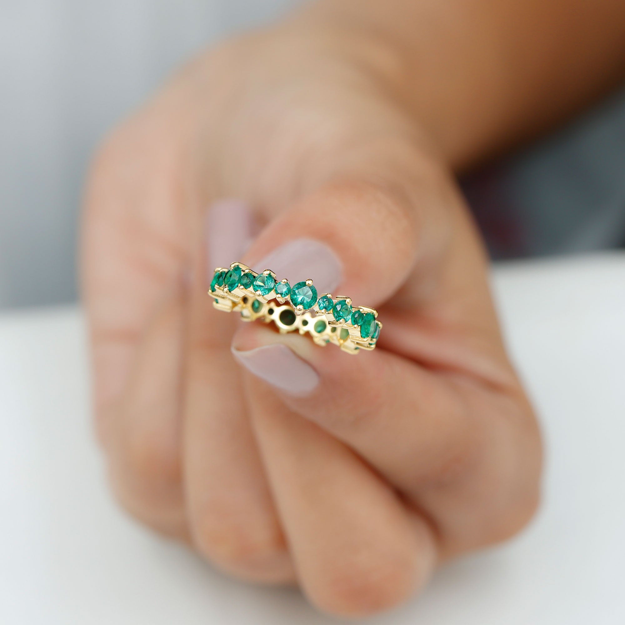 Commemorate your everlasting love and unforgettable memories with this Full Eternity Ring. Designed to symbolize infinite devotion, this Wedding Anniversary Ring features vibrant Round Shape Lab Created Emerald stones in 2 mm and 3 mm sizes, carefully set in an alternating pattern that creates a beautiful rhythm of color and sparkle all around the band. Each Lab Emerald shines with a rich green hue, representing hope, renewal and enduring commitment. The continuous circle of gemstones reflects the never-ending bond shared between two souls, making this Lab Grown Emerald Eternity Ring an ideal choice for marking a special anniversary, milestone or simply as a meaningful gift to show how much you care. Designed to capture hearts, this Lab Grown Emerald Ring offers a delicate yet striking appearance that sits gracefully on the finger. Its timeless design ensures it remains elegant through the years, perfectly complementing any style, from classic to contemporary. This Emerald Anniversary Ring captures the essence of lasting love, a gentle reminder of the promises kept and the beautiful journey shared. A perfect way to celebrate today, tomorrow and always.