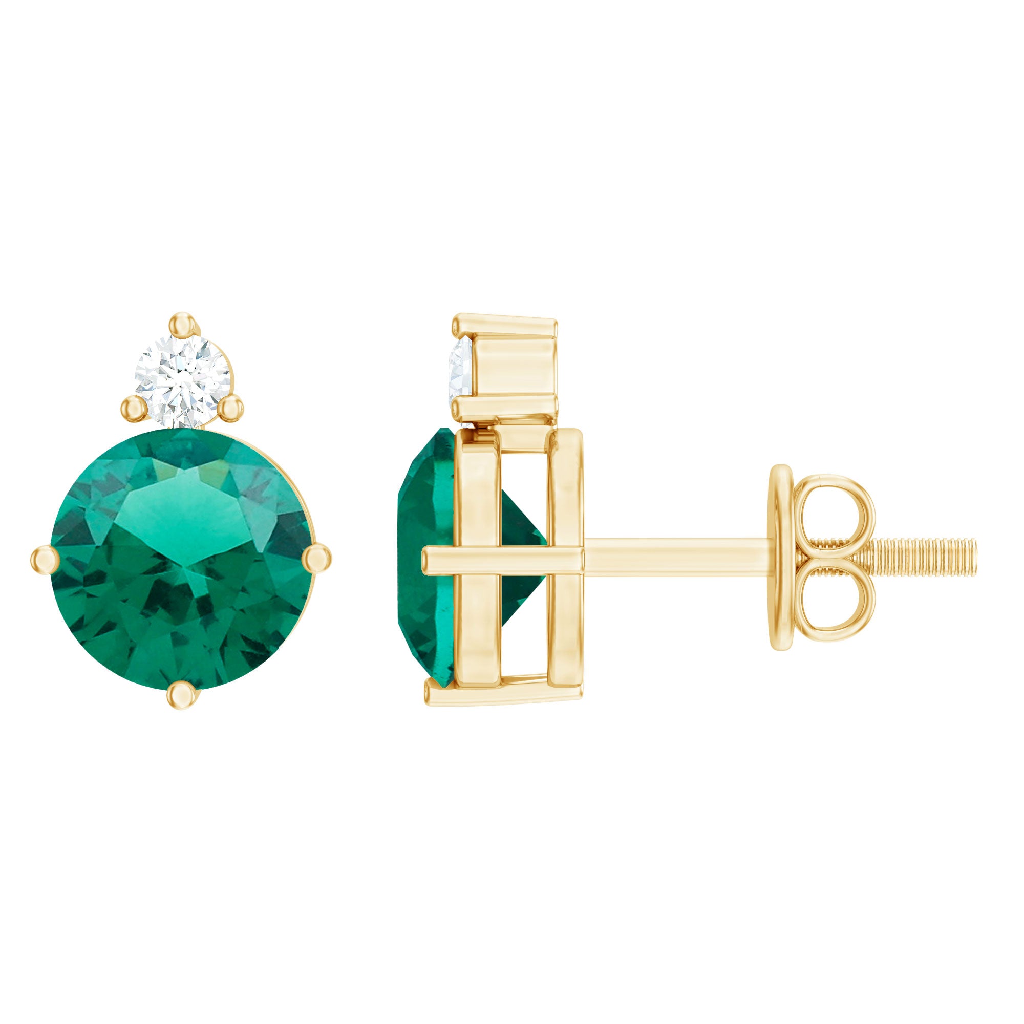 These Lab Created Emerald Stud Earrings are the perfect epitome of elegance and sophistication and come with screw back closure. The 6 mm Round Shaped Emerald of AAAA Quality is securely held in a Prong Setting with a dazzling Lab Grown Diamond sparkling from the top of these beautiful and eye-catching Green Gemstone Earrings. The Unnatural Emerald being richest in its color is similar to gorgeous naturally mined emeralds. The Rosec Jewels lets you shine like a diva and will make your event more special either when worn as Solitaire Studs or are a unique gift for that special person for their special occasion.