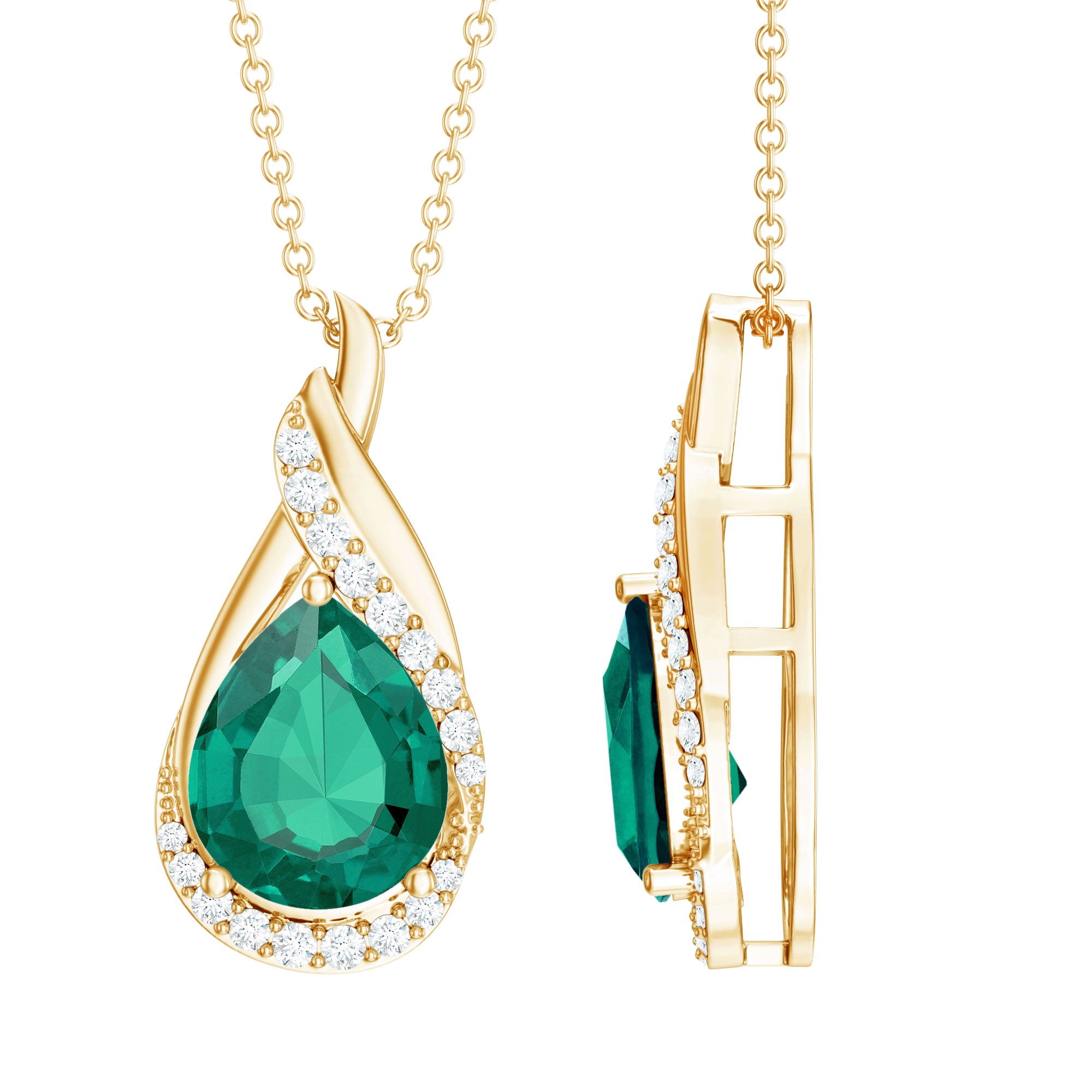 Radiate elegance and embrace your unique style with our Classic Lab Grown Emerald Pendant Necklace, a shimmering masterpiece that lets you shine like the stars. The artistically designed Pendant with a 8x10 Pear Shaped Lab Created Emerald, encircled by Round Lab Grown Diamonds on one side and the bottom, with a touch of exposed metal on the other side for a distinctive flair. Aaaa Quality Emerald and Ef-Vs Quality Diamond adornes the beauty of this Pear Shaped Pendant. This Emerald Diamond Pendant is a versatile adornment for any neckline, making it the perfect gift for someone you cherish be it your daughter, mom, friend, or girlfriend. Illuminate moments with the timeless allure of this designer pendant.