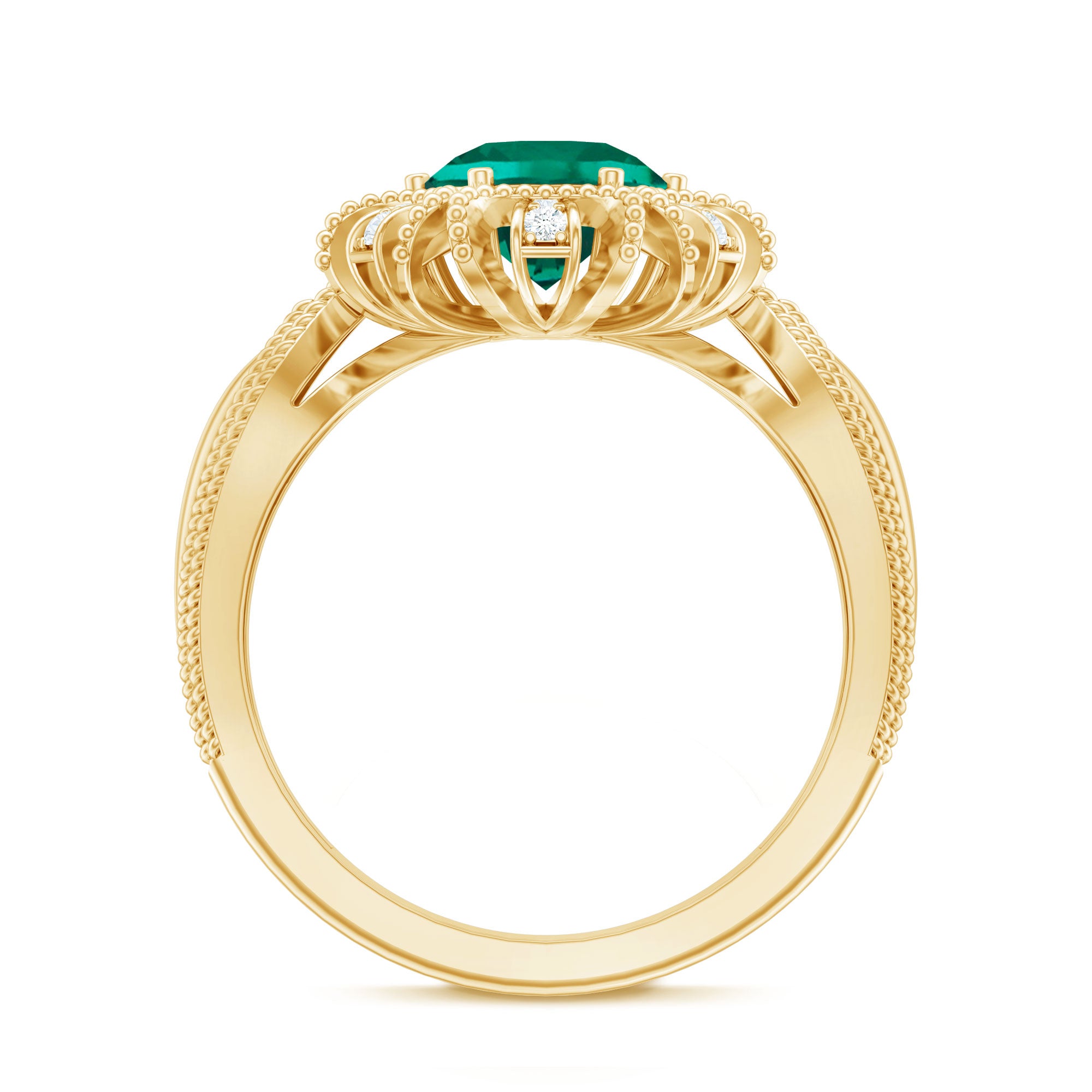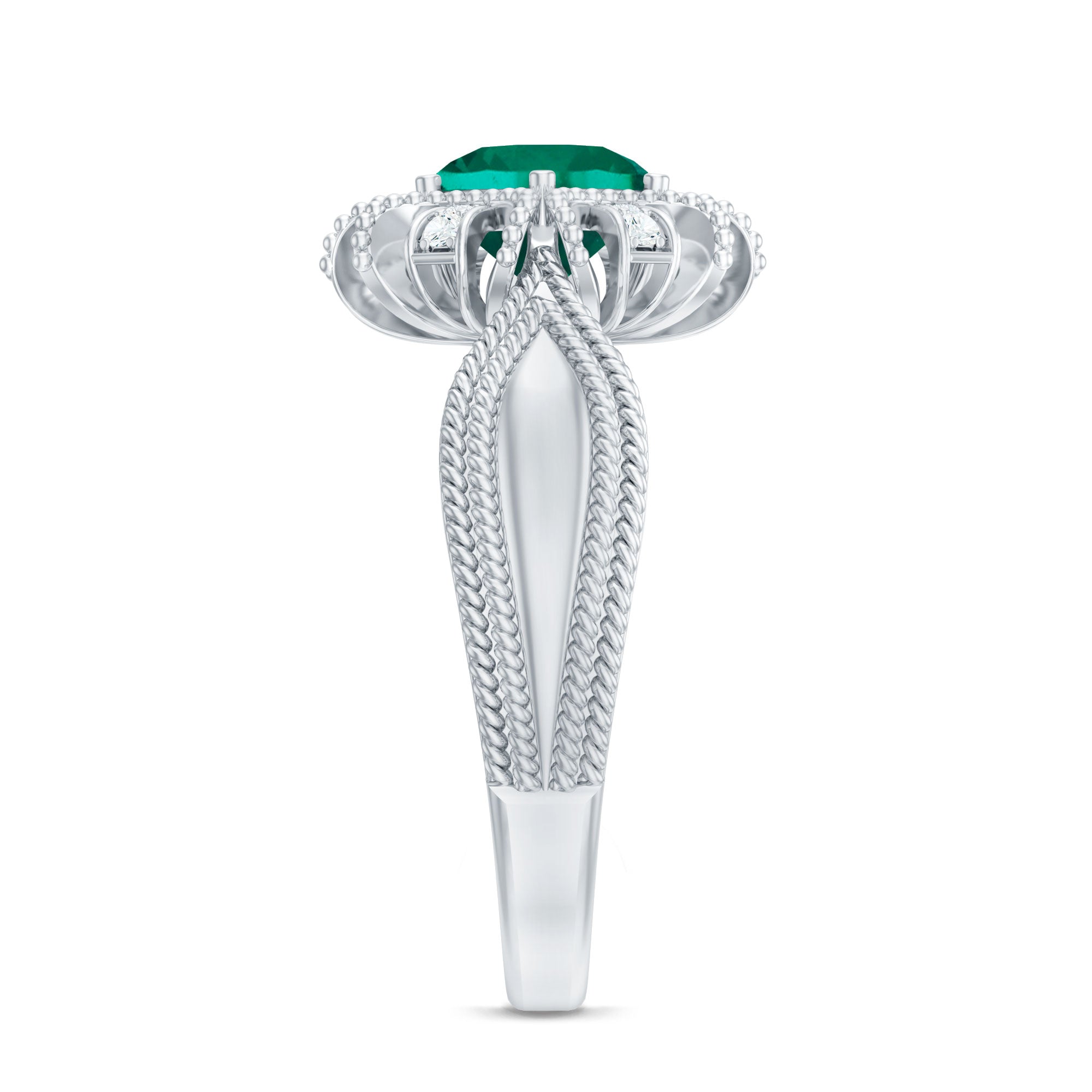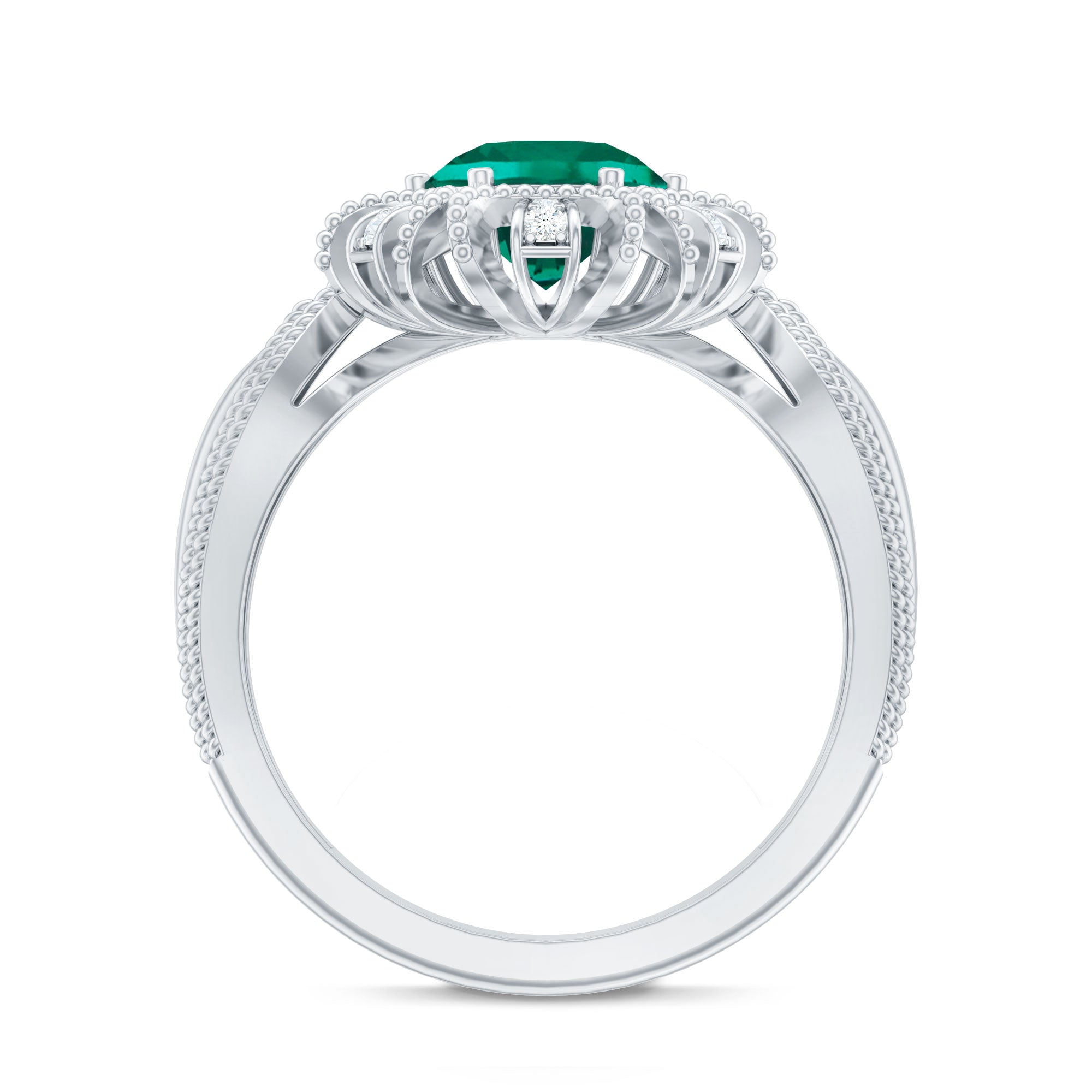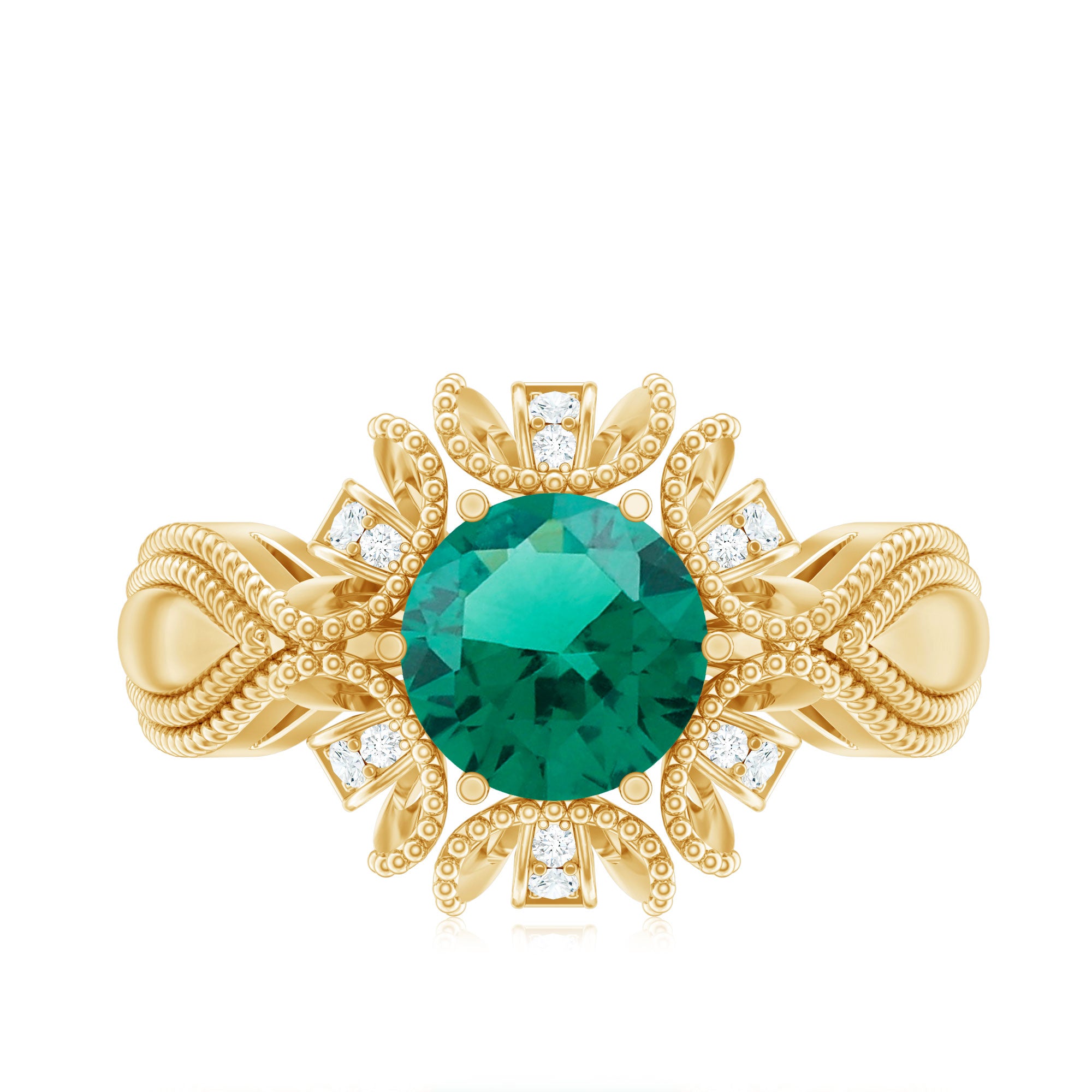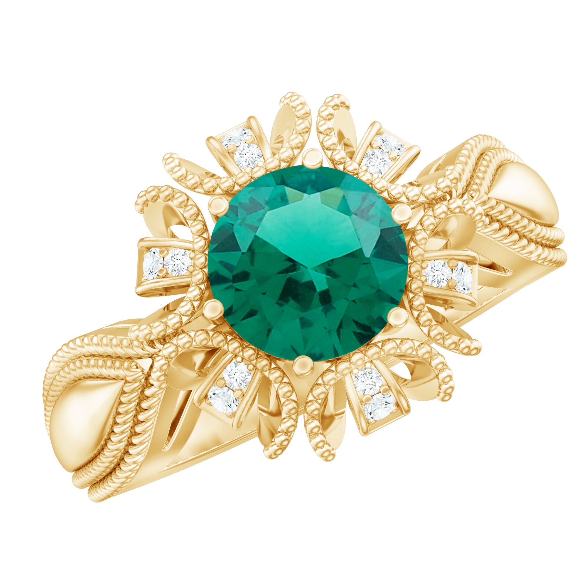Make a statement on your big day with this Vintage Engagement Ring which showcases a stunning 8 mm Round Shape Emerald (Unnatural), symbolizing eternal love, complemented by sparkling Lab Grown Diamond gemstones and Beaded Detailing. Meticulously crafted, the Emerald and Diamond Ring (Rosec Jewels) combines modern elegance with eco-conscious luxury. Elevate your commitment with Aaaa Quality Emerald and Ef-Vs Qaulity Diamonds, where timeless design meets responsible craftsmanship, ensuring your love story begins with both style and sustainability.