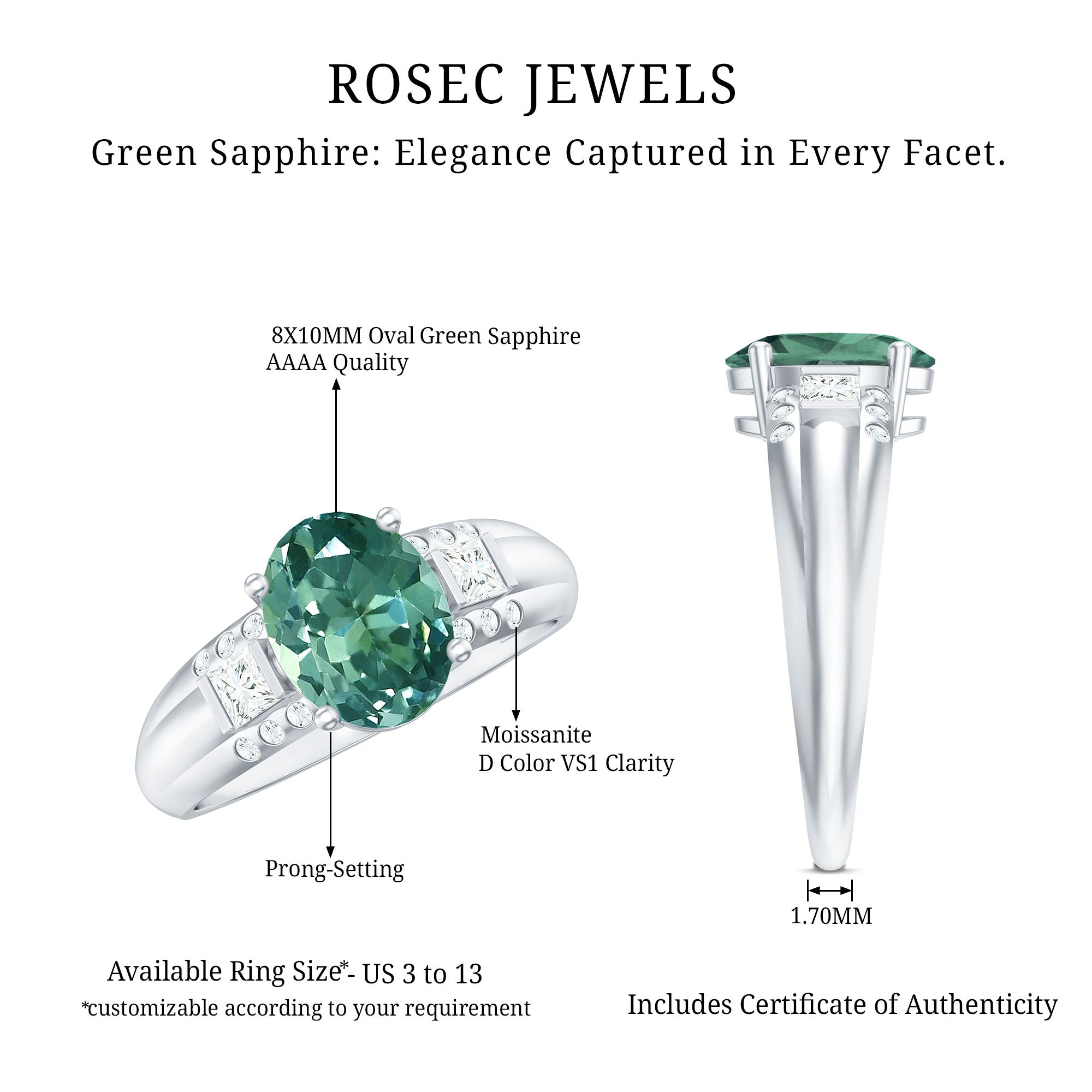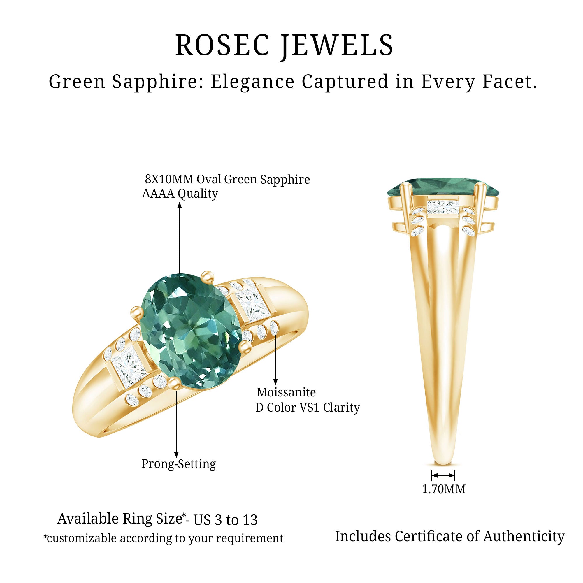 This amazing Engagement Ring is embellished with Oval Cut Lab Grown Green Sapphire secured in 4 Prong Setting while Round and Princess Cut Moissanite studded on the shank. Crafted with Solid Metal, you can present this Created Green Sapphire Ring to your special one as a Birthday or Anniversary Gift.