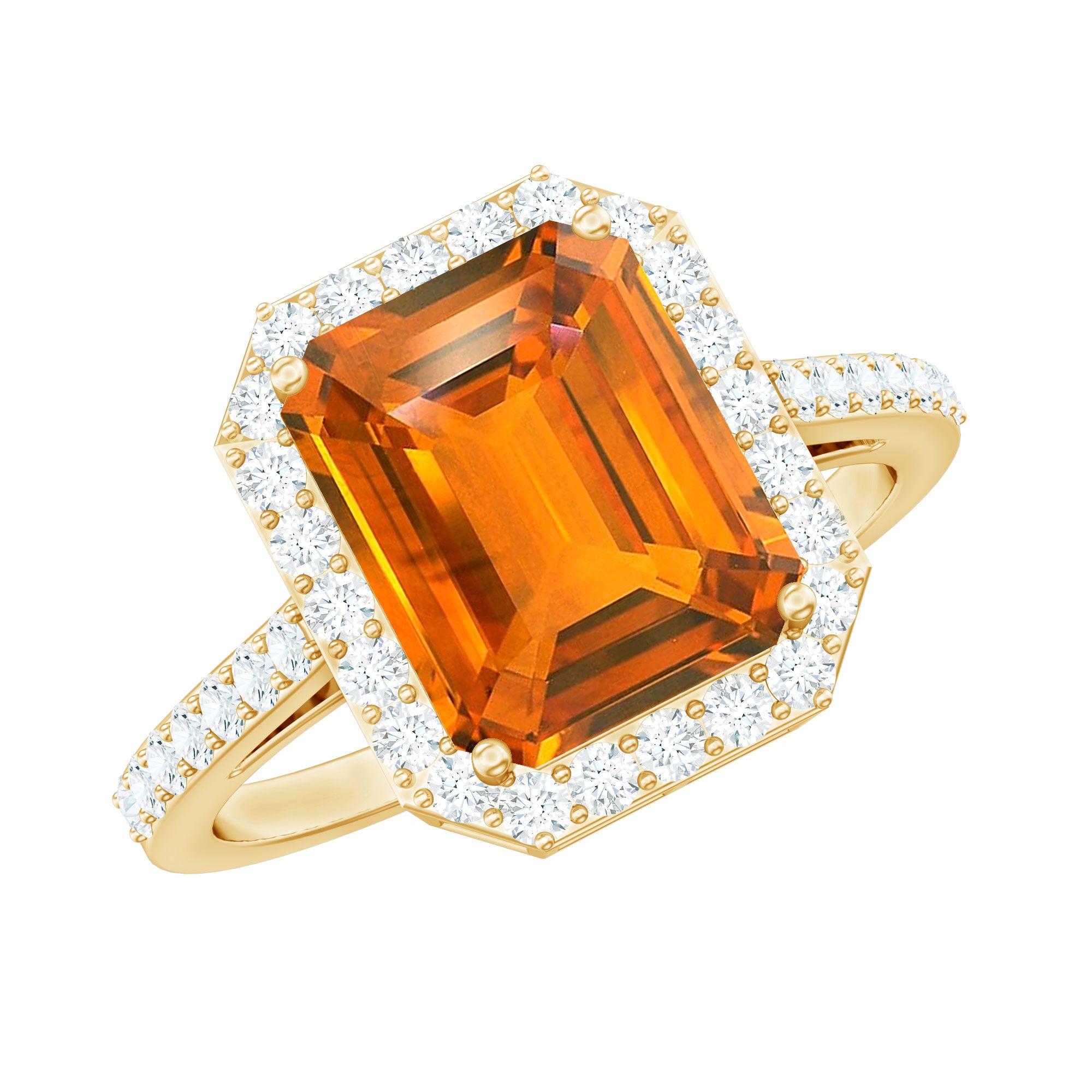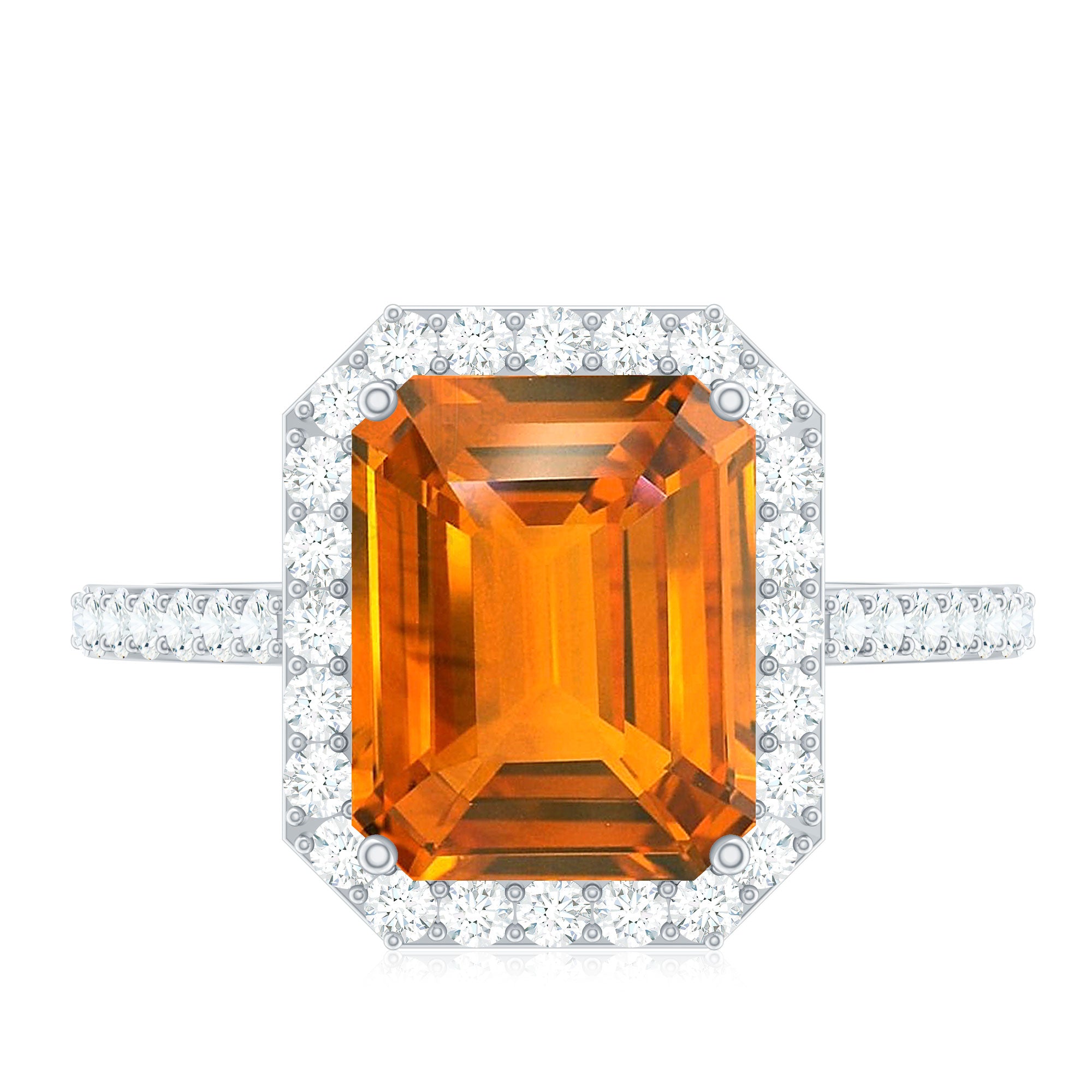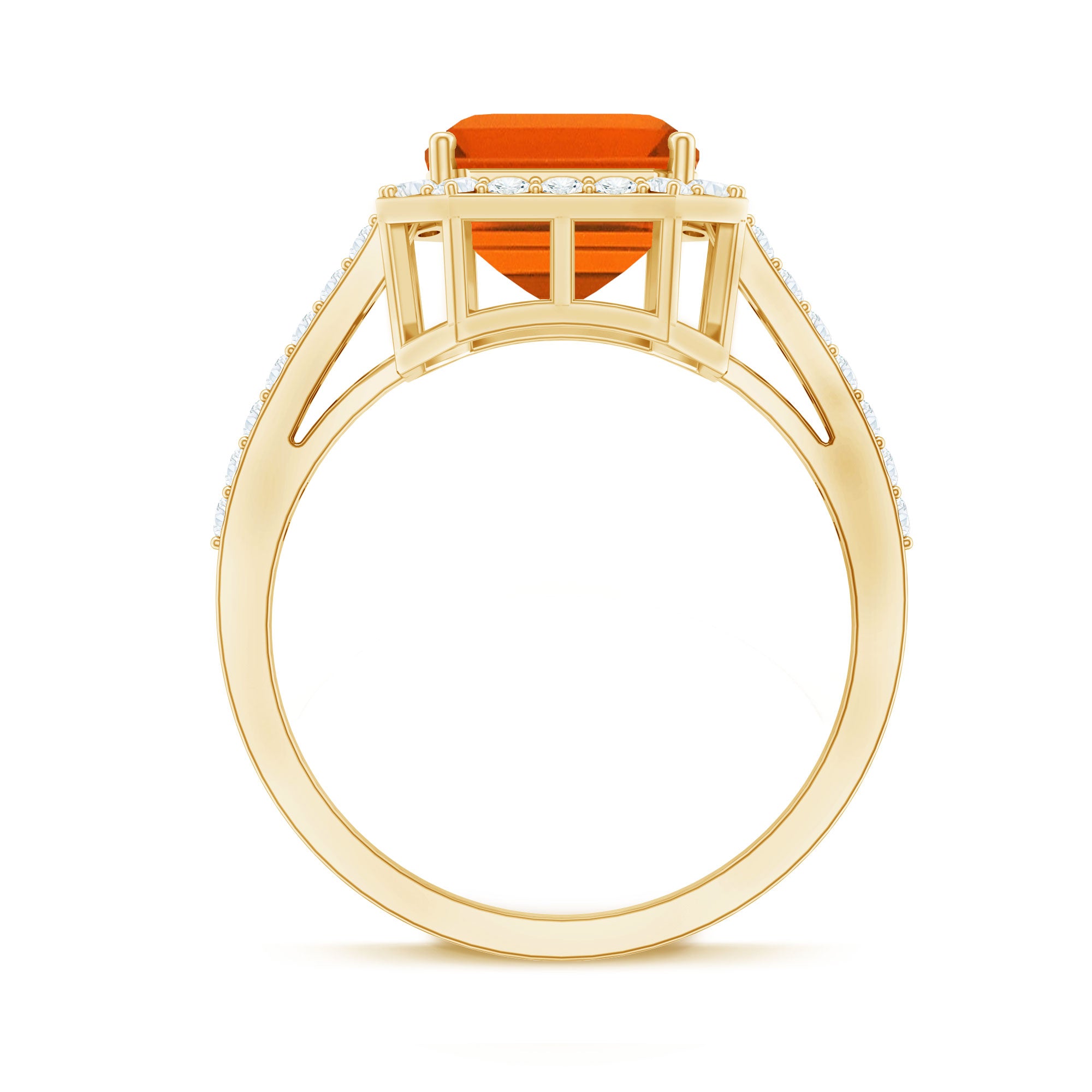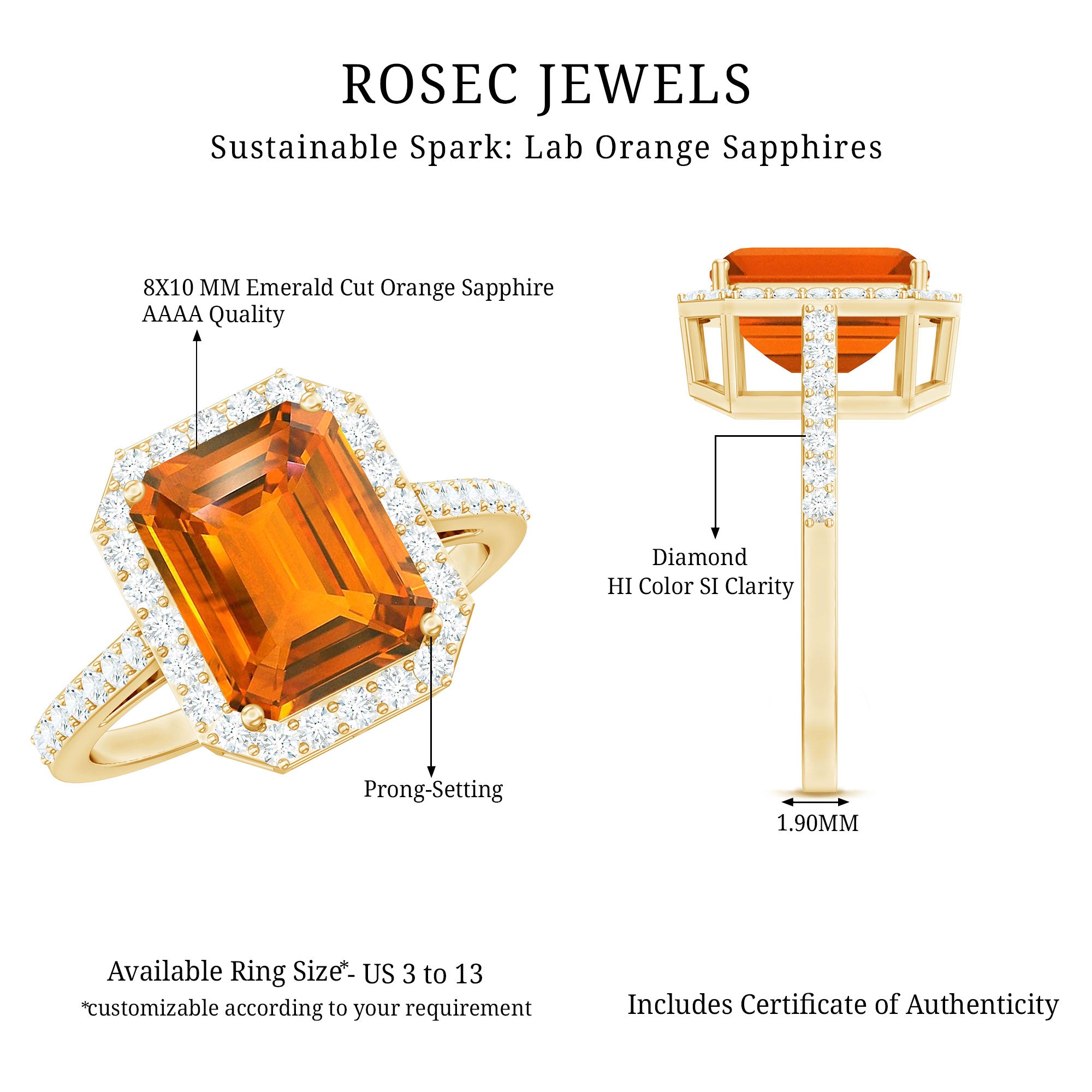 This elegant Engagement Ring is adorned with an Emerald Cut Lab Grown Orange Sapphire secured by 4 Prong Setting, and dainty Round Diamond add a perfect touch of sparkle. Crafted with Hallmarked Metal, this Lab Grown Sapphire Ring is perfect to enhance your any look.