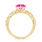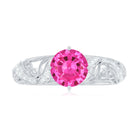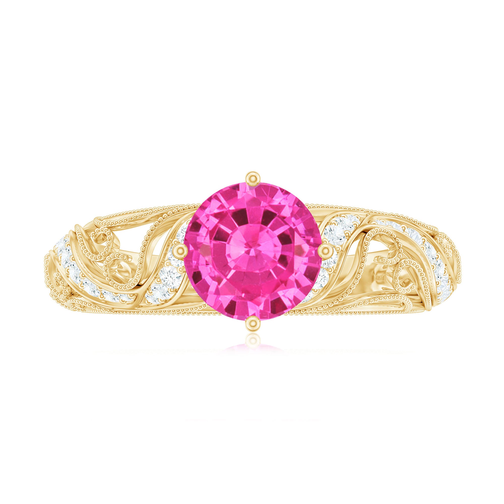 A love that stands the test of time deserves a ring just as remarkable, and this Lab Created Pink Sapphire Engagement Ring captures that sentiment beautifully. Features a 6 MM round lab created pink sapphire, set in basket setting. The vibrant pink gemstone is complemented by round diamonds along the band, which add sparkle and brilliance, enhancing the ring’s overall charm. Delicate beaded detailing along the vintage inspired band adds texture and subtle elegance, giving the piece a heirloom-quality feel. Crafted with AAAA quality lab created sapphire and HI-SI quality diamonds, this Vintage Style Engagement Ring combines exceptional beauty with lasting durability, offering the perfect blend of luxury and practicality. This Pink Sapphire and Diamond Ring is designed for those who appreciate timeless elegance with a touch of unique color. It is ideal for proposals, anniversaries, or as a treasured symbol of love that will be worn and admired for decades. The antique inspired design, sparkling diamonds, and vibrant pink sapphire come together to create a piece that is both classic and distinct.