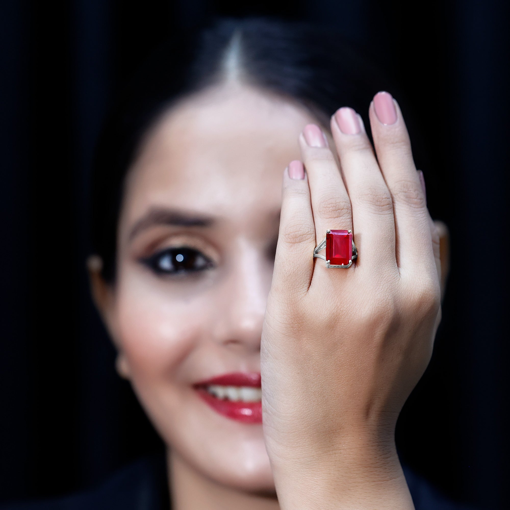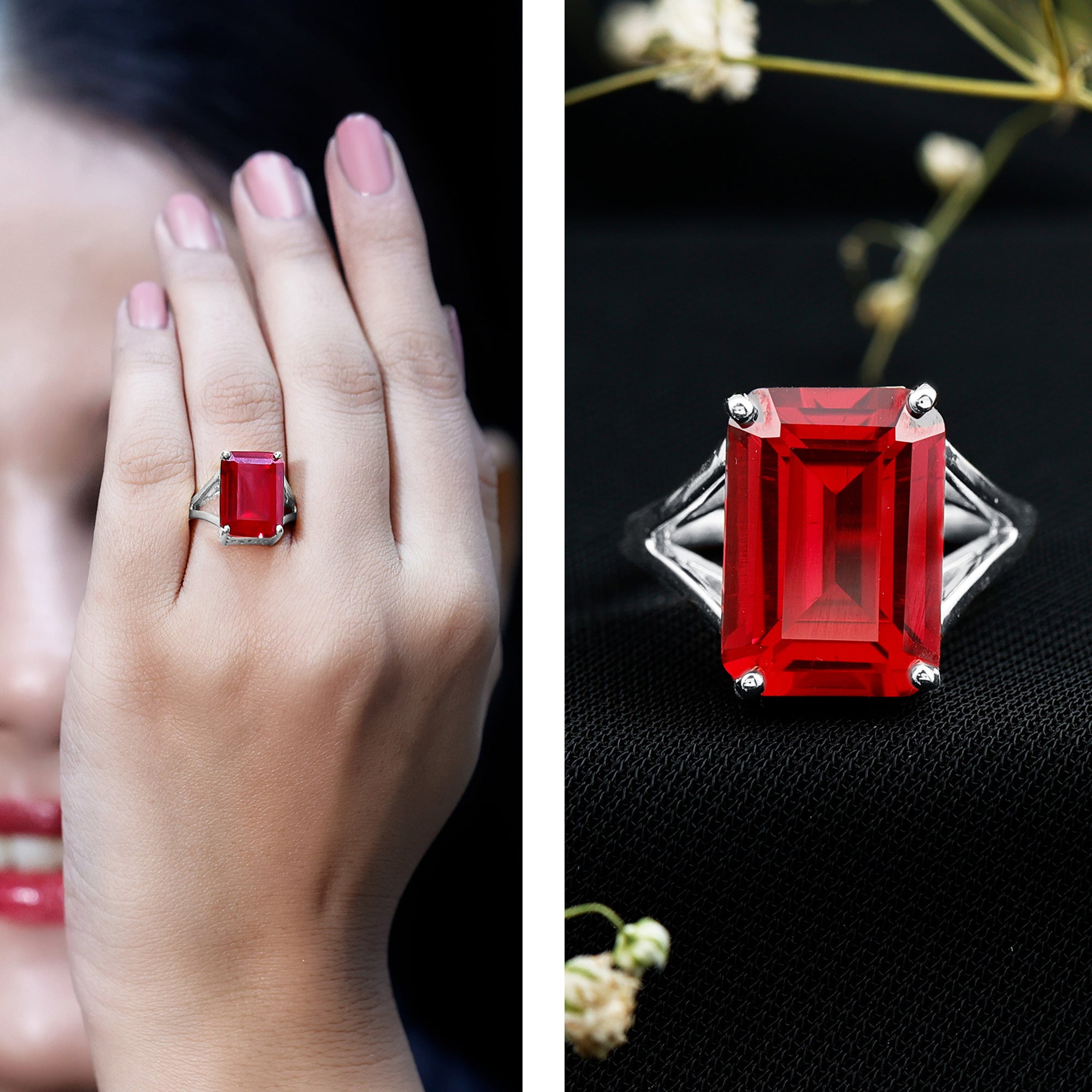 Rosec Jewels Lab Grown Ruby Ring is made to stand out - bold, bright, and full of love. With its deep red sparkle and classic design, this Solitaire Engagement Ring is the kind of jewelry that leaves a lasting impression. It is handcrafted in top notch metal with a 10X14 MM emerald cut lab created ruby placed beautifully in secure basket setting. The bold and big ruby catches the light from every angle, making sure all eyes are on it. It is further enhanced with a split shank band that adds a stylish charm to the design, giving it a modern yet elegant feel. Each part of this Emerald Cut Ruby Ring is curated to celebrate love that is strong, warm, and forever. Whether it is worn as an engagement ring or presented as a meaningful gift to someone who adores vintage inspired jewelry, this piece brings out the beauty in every moment. It comes with a certificate of authenticity for gemstones and is packaged in a premium quality signature jewelry box.