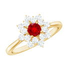 Exuding elegance, the Cluster Engagement Ring boasts a centerpiece of a Round Shape Created Ruby set as a striking Solitaire. Complementing its allure are Round Shape Diamond stones, rendering it a splendid selection for noteworthy events. This Statement Ring radiates a luxurious charm, making it an exceptional choice.