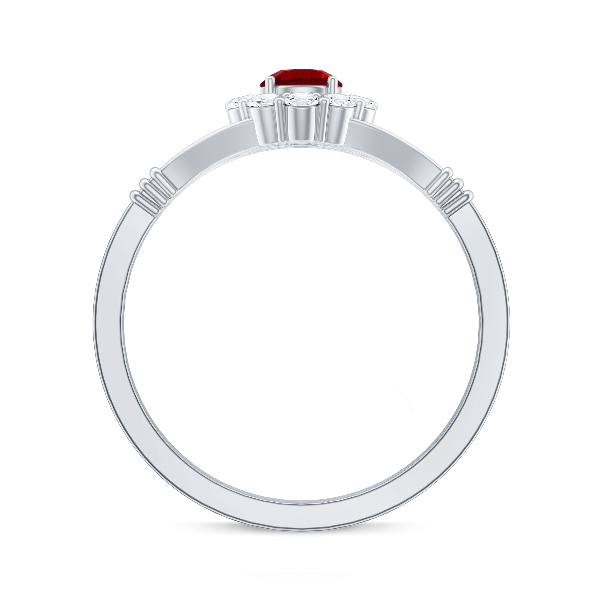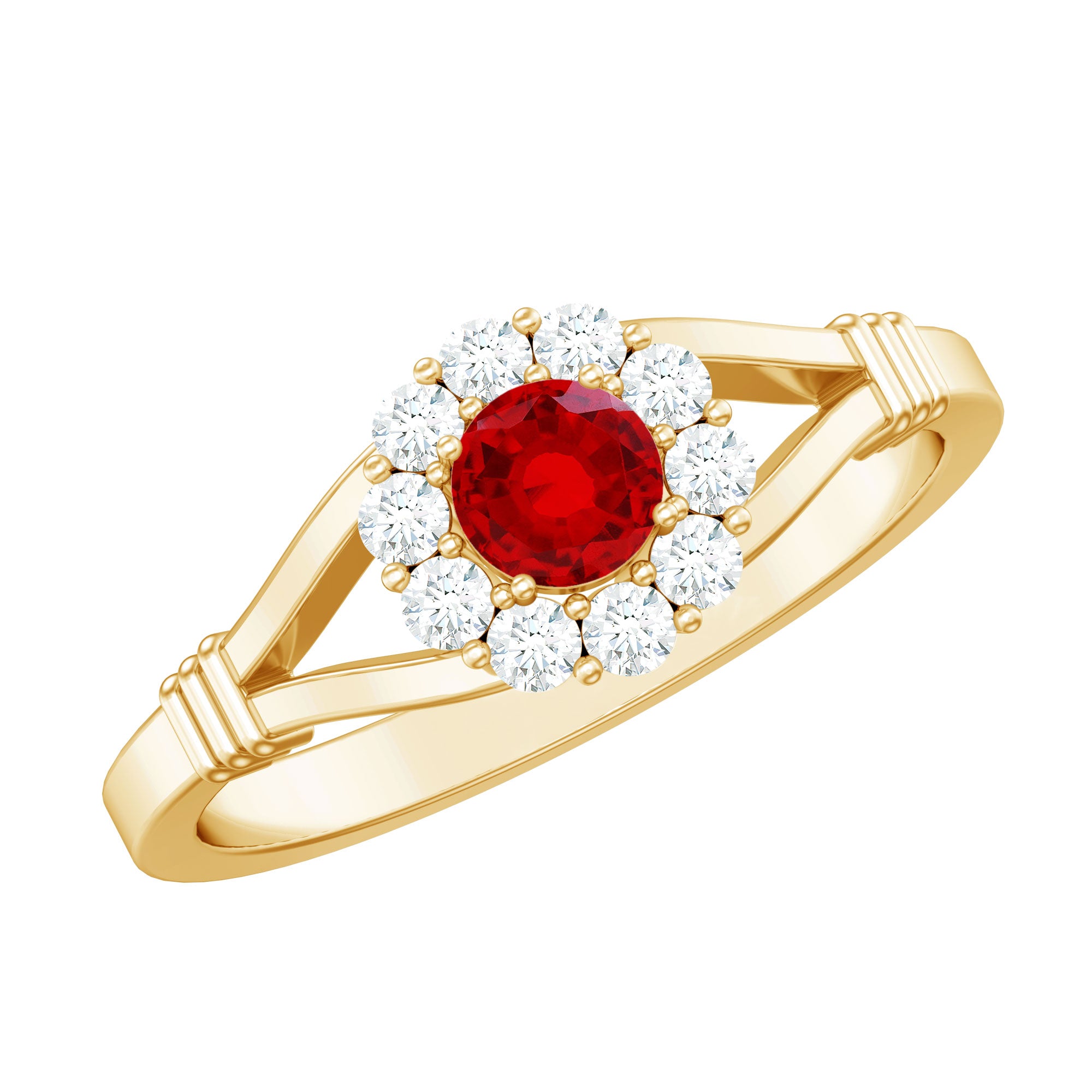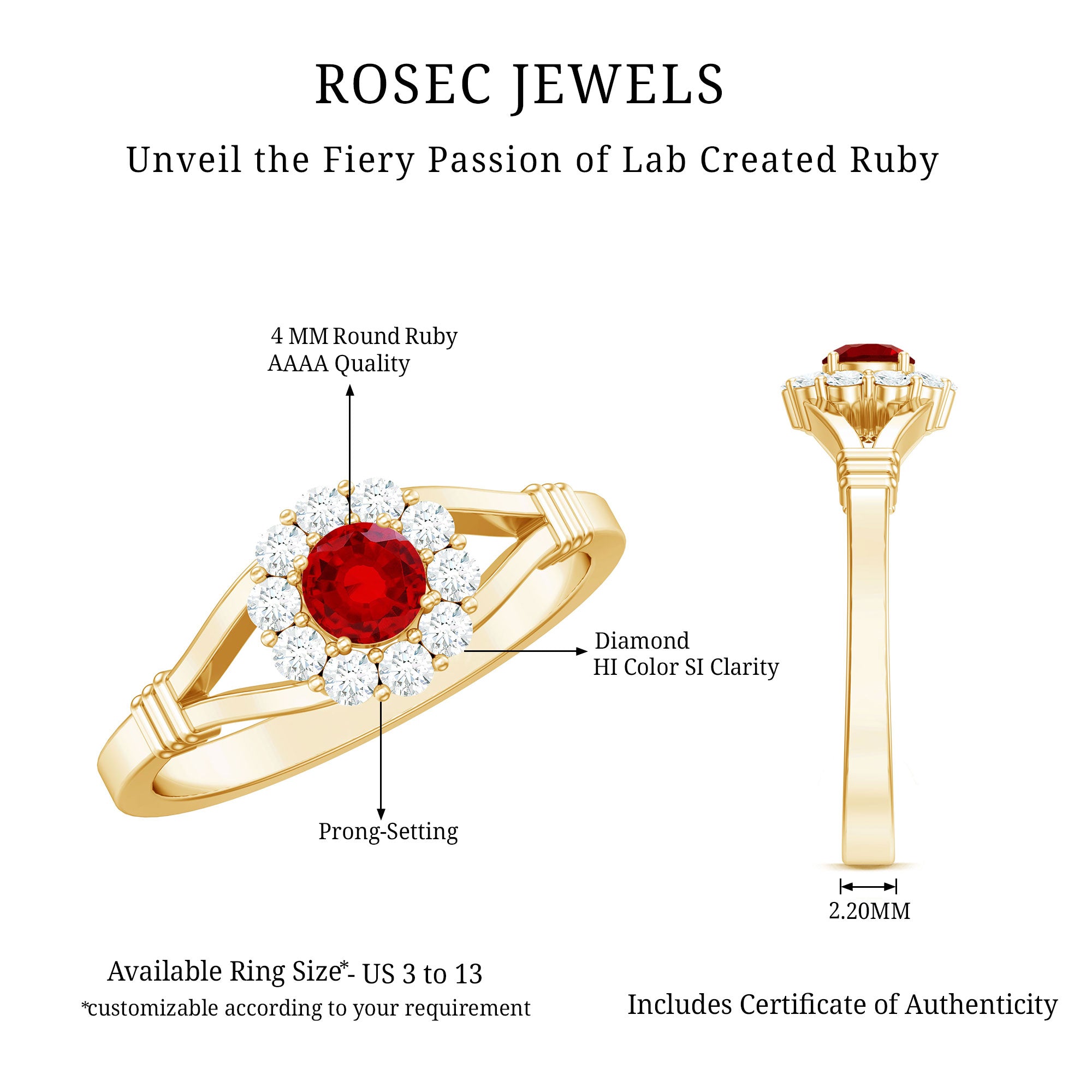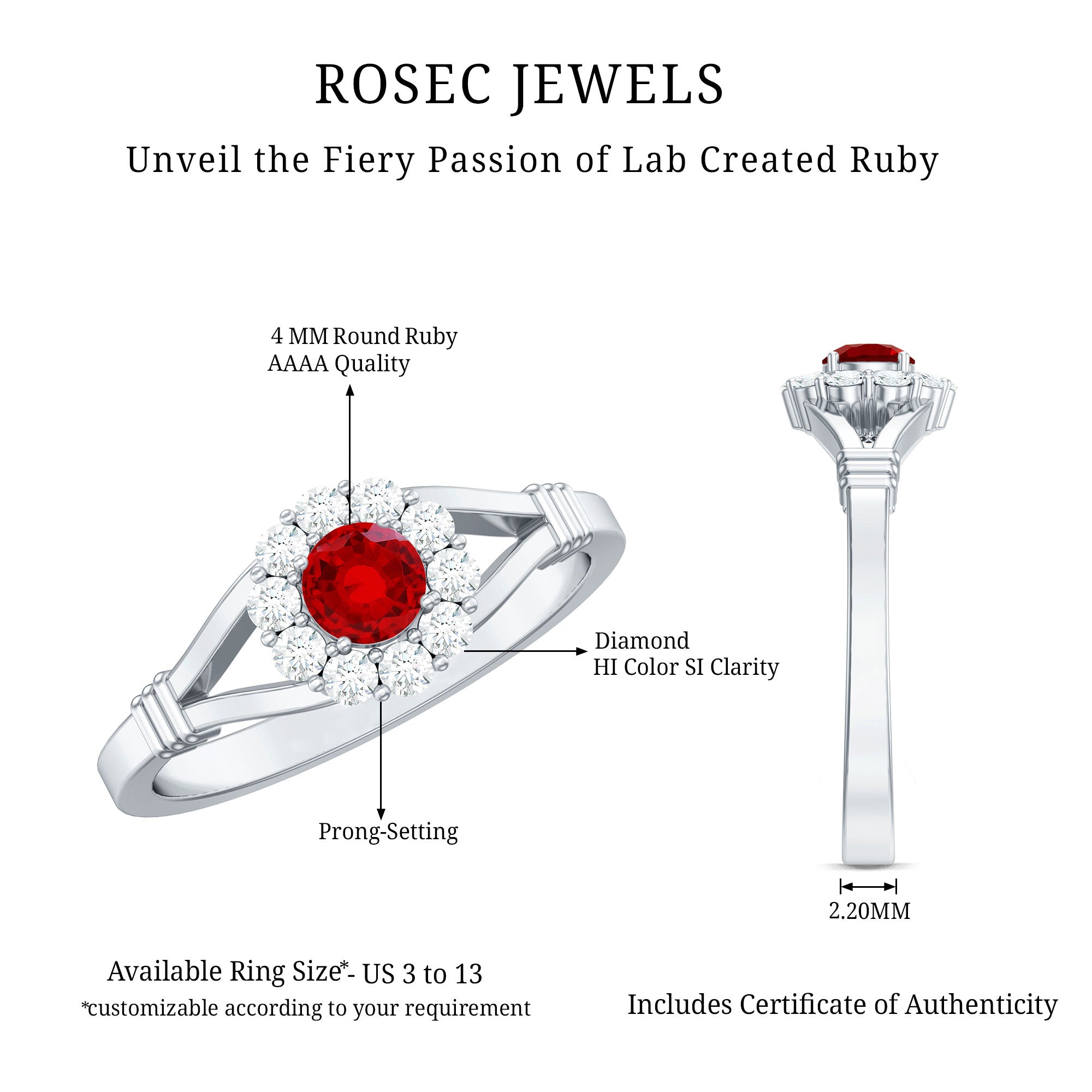 Inspired by the beauty of nature, this Lab Created Ruby Engagement Ring blossoms with elegance and charm. Designed for the woman who loves delicate details, the Halo Engagement Ring features a captivating 4 MM round cut lab created ruby at its center, held securely in prong setting. Surrounding the ruby is a sparkling halo of diamonds that enhances its brilliance and adds a graceful shimmer to the entire design. The band features a beautifully crafted split shank design that gives the ring a nature-inspired touch. Its gentle curves and open structure create a airy feel while maintaining a luxurious presence. The floral motif adds a romantic and feminine essence, making this piece truly stand out from traditional engagement styles. Every element of this Ruby and Diamond Ring is designed to capture attention while remaining elegant. The harmony between the AAAA quality lab created ruby and the surrounding HI-SI quality diamonds symbolizes passion, devotion, and timeless beauty. Its delicate beauty represents love that continues to grow and bloom with time. Presented in a beautifully packaged jewelry box, this Flower Engagement Ring is a lasting symbol of elegance and faithfulness, crafted to be cherished for years to come and admired for its truly unique design.