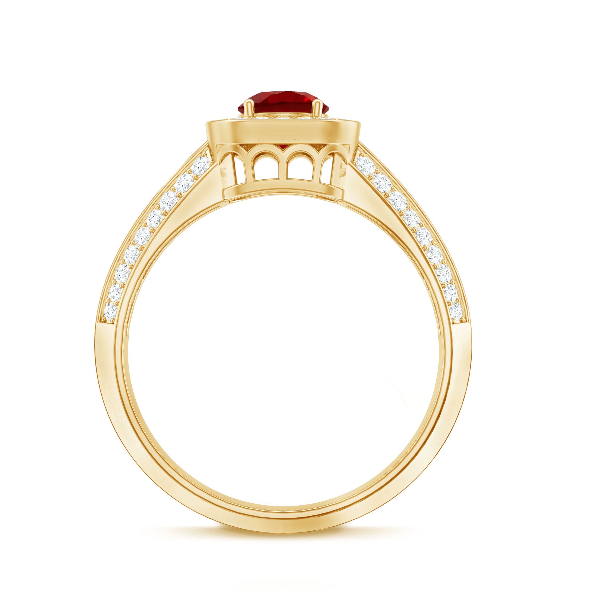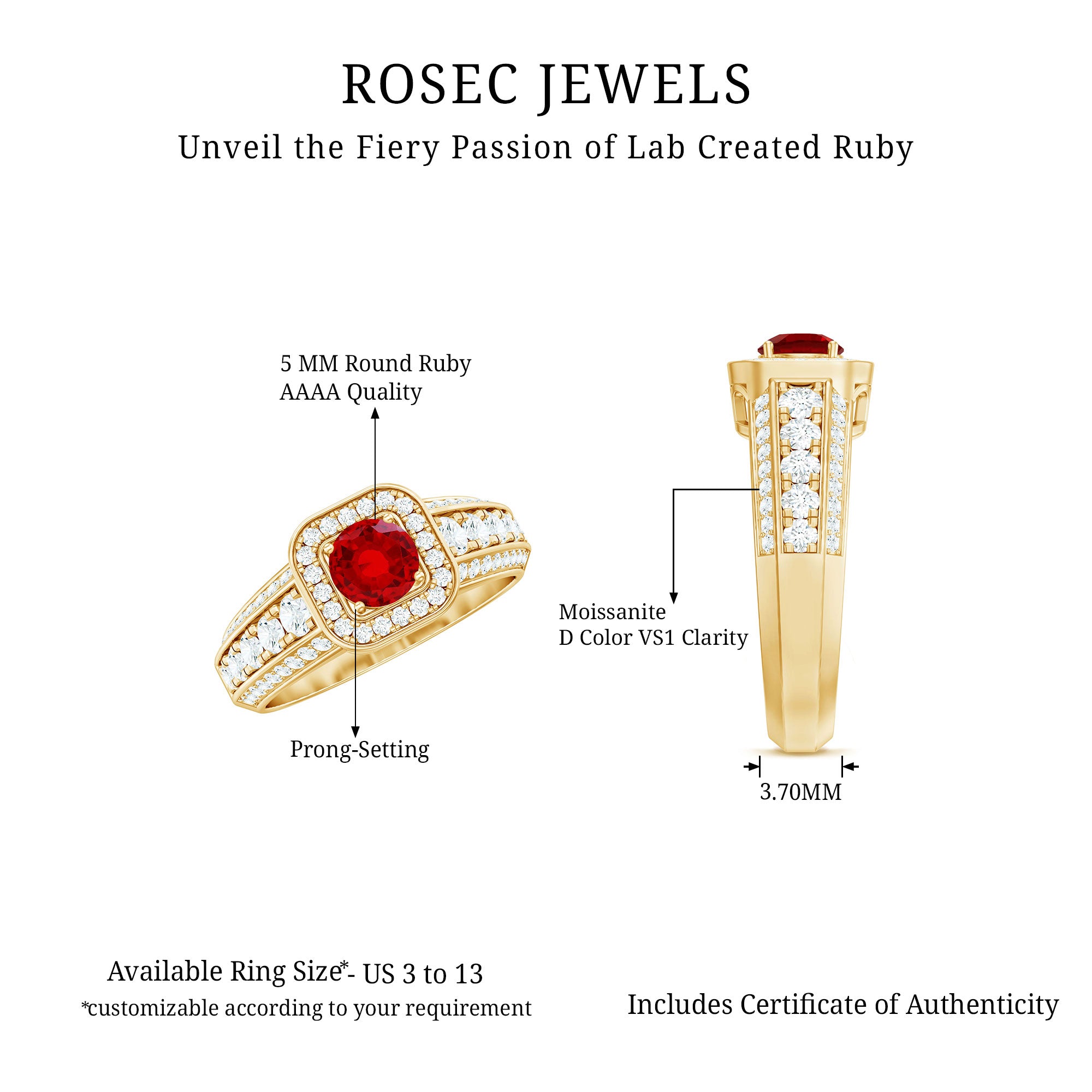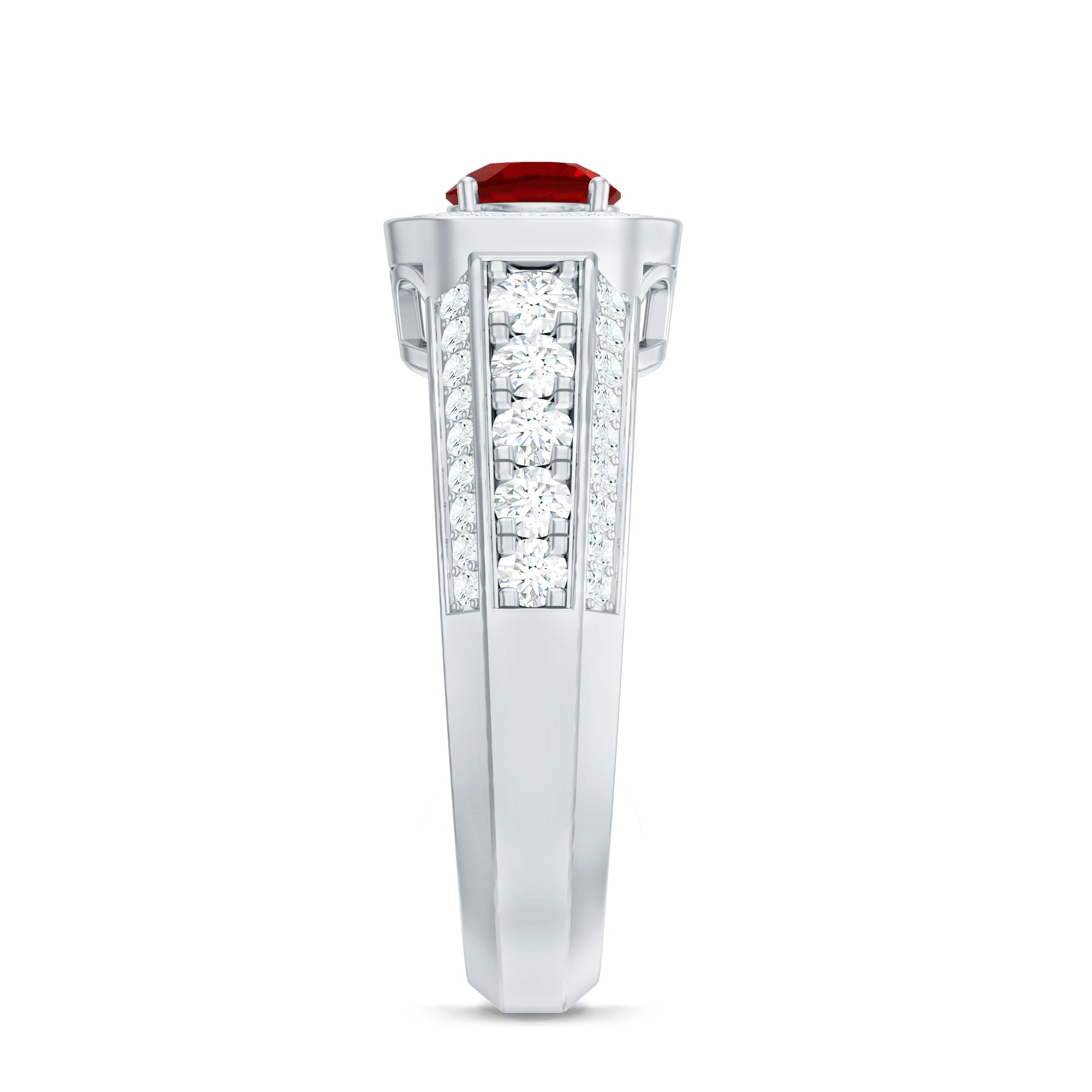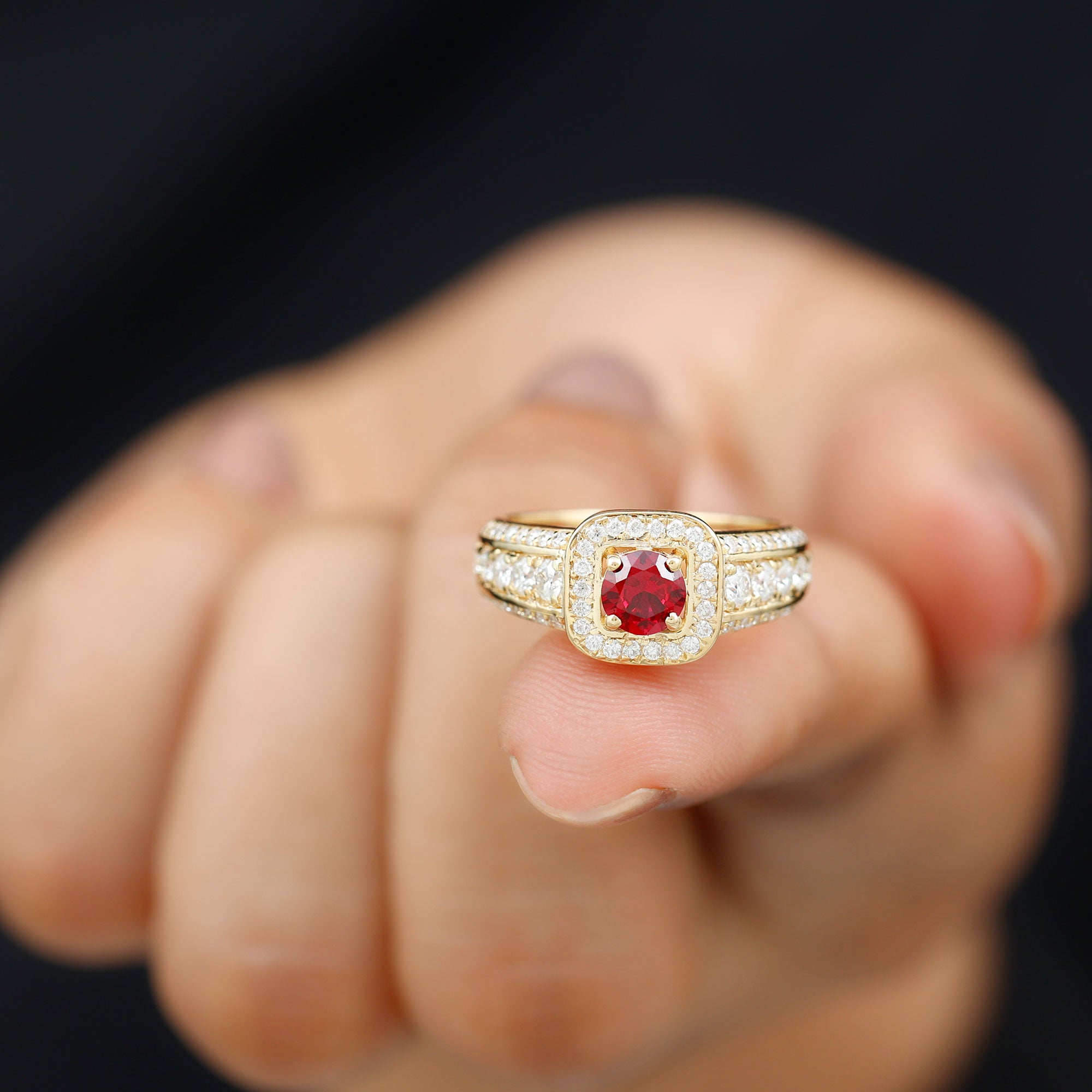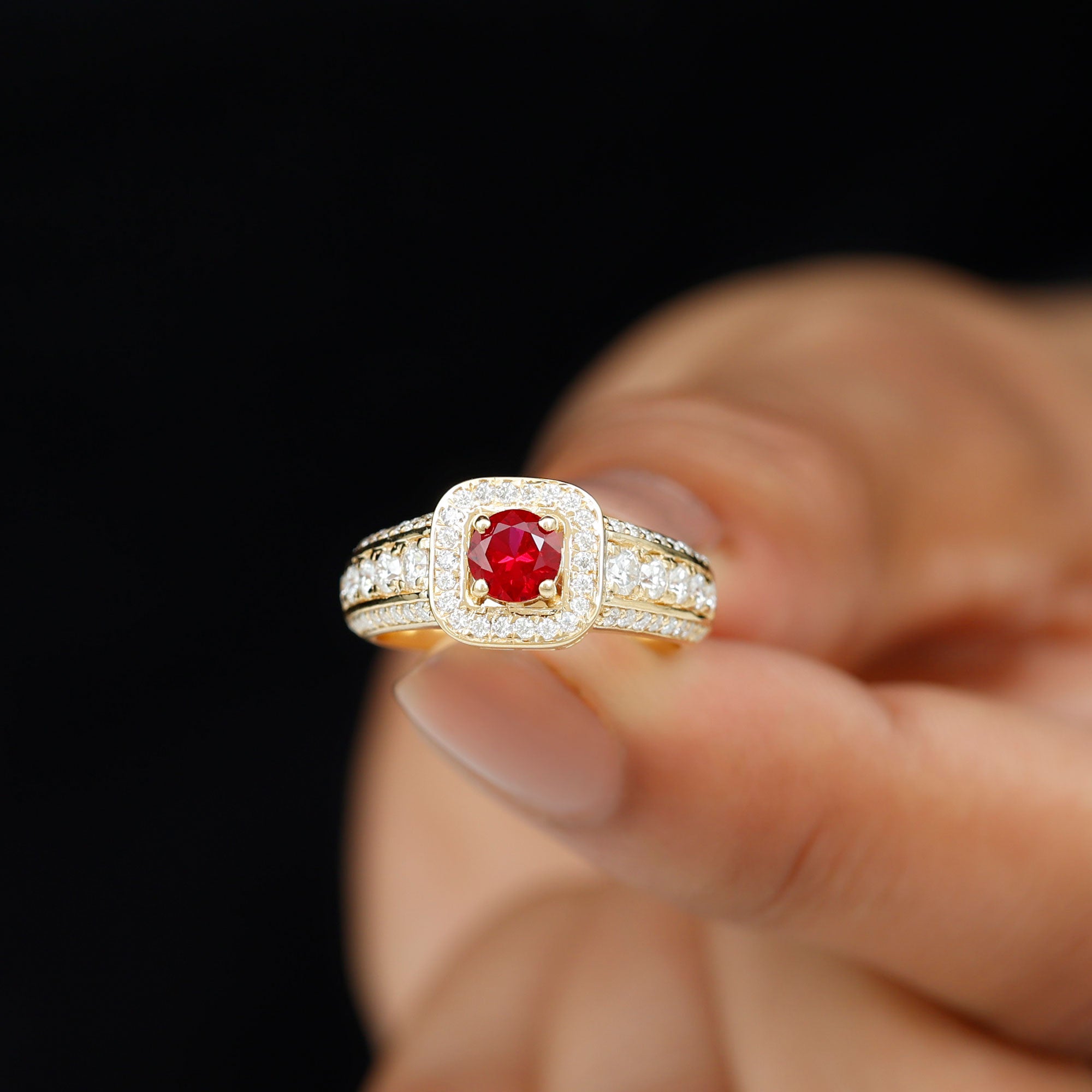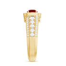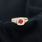 Enhance your look with a romantic touch by wearing this exquisite Statement Ring adorned with a Round Cut Lab Created Ruby at the center, accompanied by sparkling Round Cut Moissanite in an Accent Setting. This Created Ruby Ring is the perfect go-to accessory for all women. Let the allure of this stunning ring add a touch of elegance and charm to your style, making every occasion special and memorable.