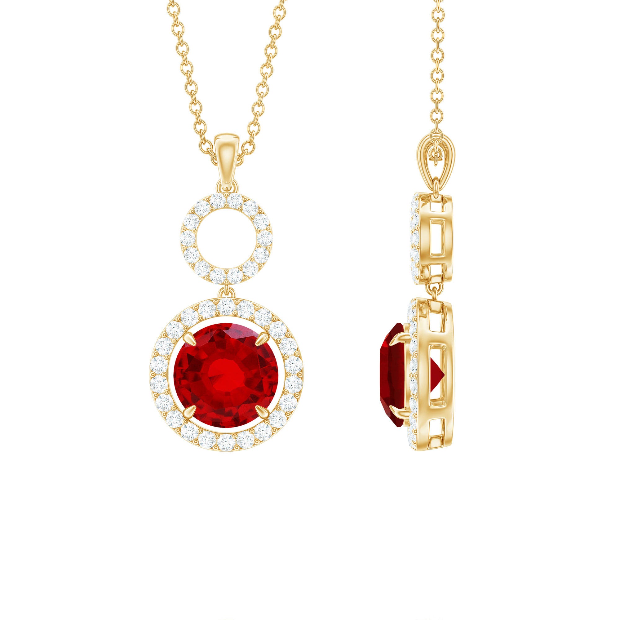 Enhance your style with the alluring charm of this Lab Grown Ruby Necklace, designed to captivate with every glance. The centerpiece of the Dangle Necklace is an 8 MM round created ruby held securely in claw setting. Surrounding the ruby is a halo of round brilliant moissanites, adding layers of sparkle that enhance the beauty of the central stone. Above the ruby sits an open circle, also lined with moissanites, creating an elegant drop effect that makes the Halo Pendant Necklace feel luxurious and eye-catching. Hanging from a strong and comfortable chain, the Ruby and Moissanite Necklace pairs easily with wedding gowns, cocktail dresses, or any outfit that calls for a statement. The AAAA quality lab created ruby offers outstanding color and shine, while the D-VS1 quality moissanites provide clarity and brilliance similar to real diamonds. The Open Circle Necklace brings together refinement, sparkle, and a touch of drama, ideal for anyone who wants to wear something truly memorable.
