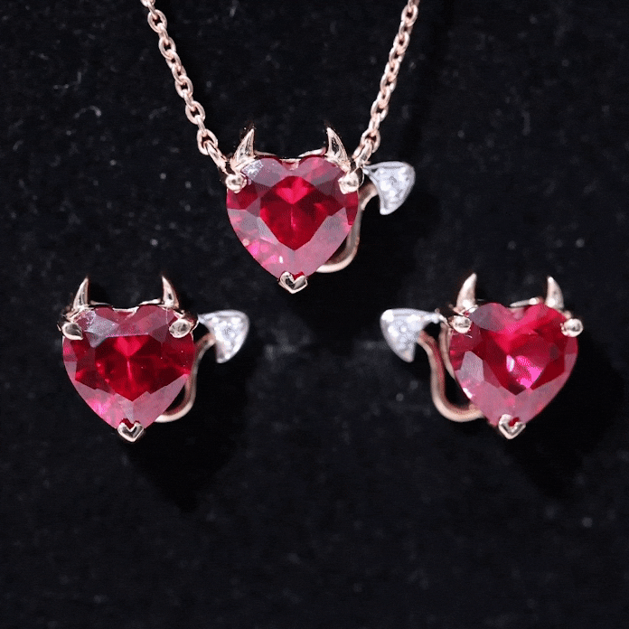 Capture attention with the mesmerizing beauty of this Ruby Jewelry Set. Features a necklace and stud earrings set adorned with heart-shaped lab-created ruby in prong setting and round dainty diamond on the tail, reflecting unmatchable brilliance. The devilish pattern of this ruby jewelry is enough to showcase your unique style and personality. From casual fit to glamorous evening attires this heart jewelry set is designed to compliment all your looks.