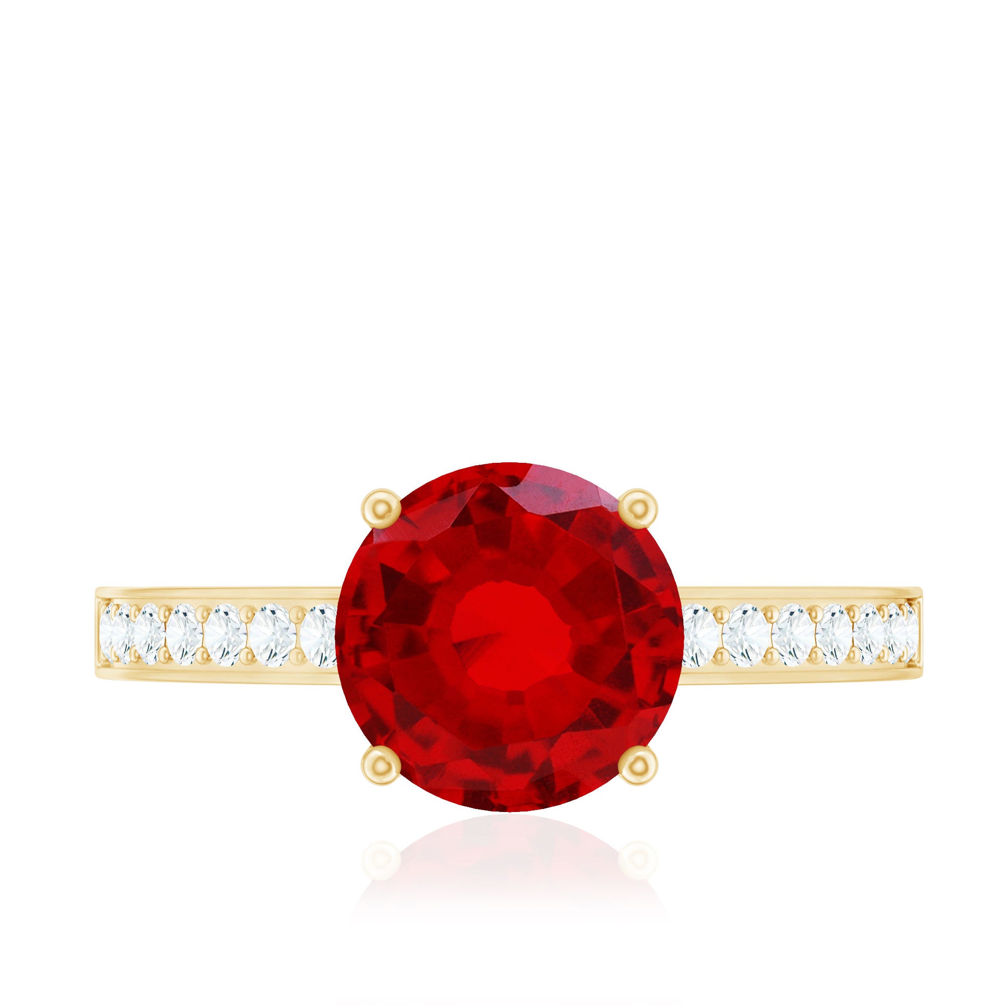 This understated solitaire engagement ring is the perfect addition to any collection. Featuring an 8 MM round-cut Lab-Created Ruby as the central gemstone, accompanied by Diamond side stones elegantly placed along the shank, the design exudes an air of elegance and sophistication.