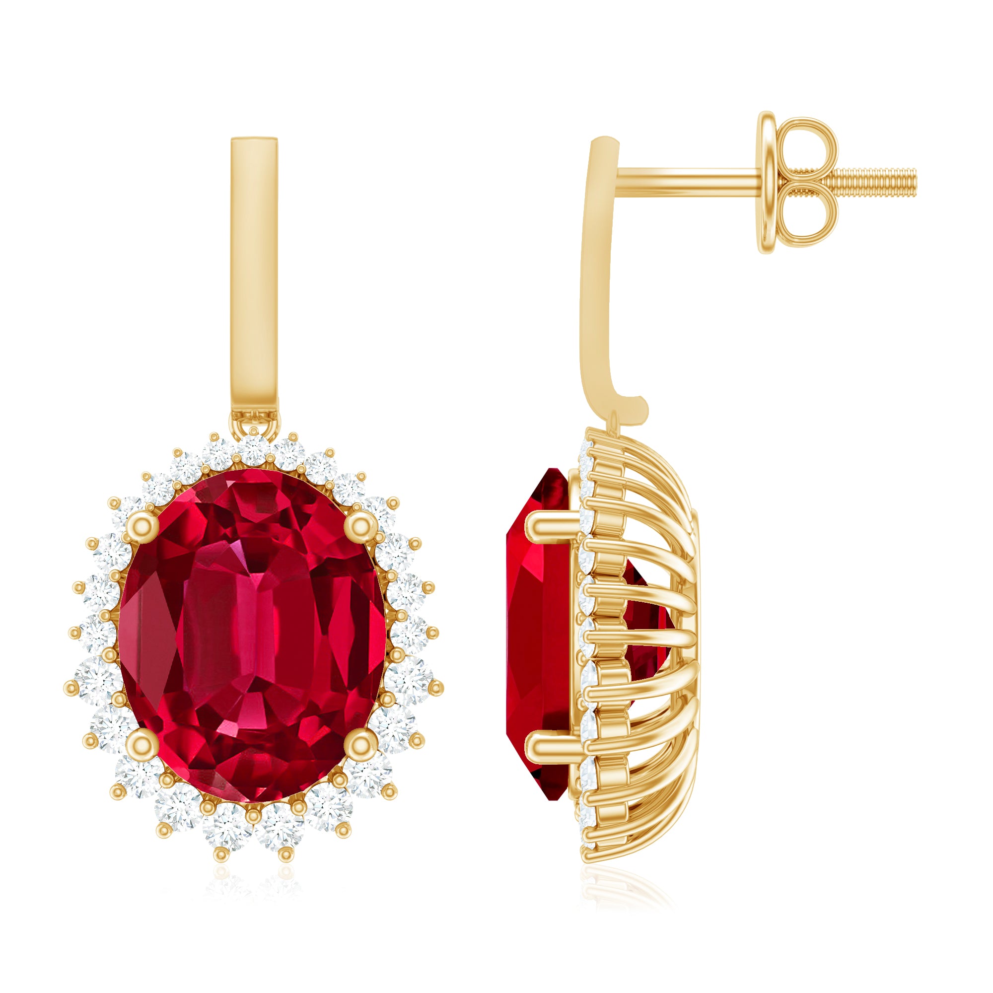 Whether attending a glamorous soiree or adding elegance to your everyday ensemble, these mesmerizing Ruby and Diamond Earrings are a captivating choice. These Bridal Drop Earrings feature an 8X10 MM Oval Shape Ruby gemstone, surrounded by a sparkling Halo of round shaped Lab Grown Diamond gemstones. The Screw Back Closure ensures a secure fit, while the exquisite design reflects the exceptional craftsmanship synonymous with Rosec Jewels, bringing timeless beauty to every moment. Ruby (April Birthstone) is considered a strong symbol of deep love and passion, it would be a perfect Gift for Women on a special day. The deep color of the gemstone in these Red Ruby Earrings is a representation of the depth of your love for her.