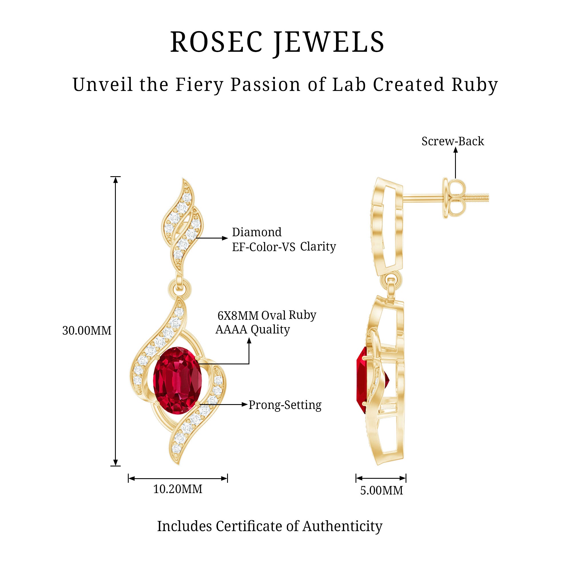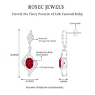 Take her to the dinner date and surprise your beloved by presenting these ravishing lab created Ruby and Diamond Earrings. These Dangle Drop Earrings feature a 6x8 mm Oval Shaped Ruby gemstone of Aaaa quality set in Prong Setting, accentuated by sparkling Lab Grown Diamonds of Ef-Vs quality. They carry 3 carat weight gemstones, whether as a gift for bride to be or a Valentines Day gift for your lady love these Ruby Dangle Earrings will sure to capture their heart. Secured with Screw Back Closure, these Infinity Earrings are a testament to the fusion of modern luxury and ethical practices. Embrace the allure of minimalism with Rosec Jewels, where innovation meets enduring beauty.