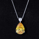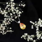 Cherish your lady with this stunning Yellow Sapphire Necklace on her momentous day. The pendant is made from 14K White Gold Plated silver, featuring a large 18X13 MM lab grown yellow sapphire set in prong setting, complemented by a 5 MM heart shaped moissanite at the top for an added romantic flair to this striking design. This Solitaire Drop Pendant dazzles with AAAA Quality Yellow Sapphire, enhancing the celebration with its sun-like hue and vibrant charm. The Sapphire Statement Pendant hangs from a sturdy cable chain, perfectly completing the aesthetics. The everlasting brilliance of Lab Grown Yellow Sapphire ensures that this pendant will be the focal point of attention. It elegantly embodies the timeless themes of love, compassion, courage, and lifelong devotion. Whether you are getting ready for a special occasion or looking to enhance a casual outfit, this Teardrop Wedding Pendant serves as the perfect finishing touch. It will arrive in a luxurious velvet pouch, complete with gemstone authentication certification.