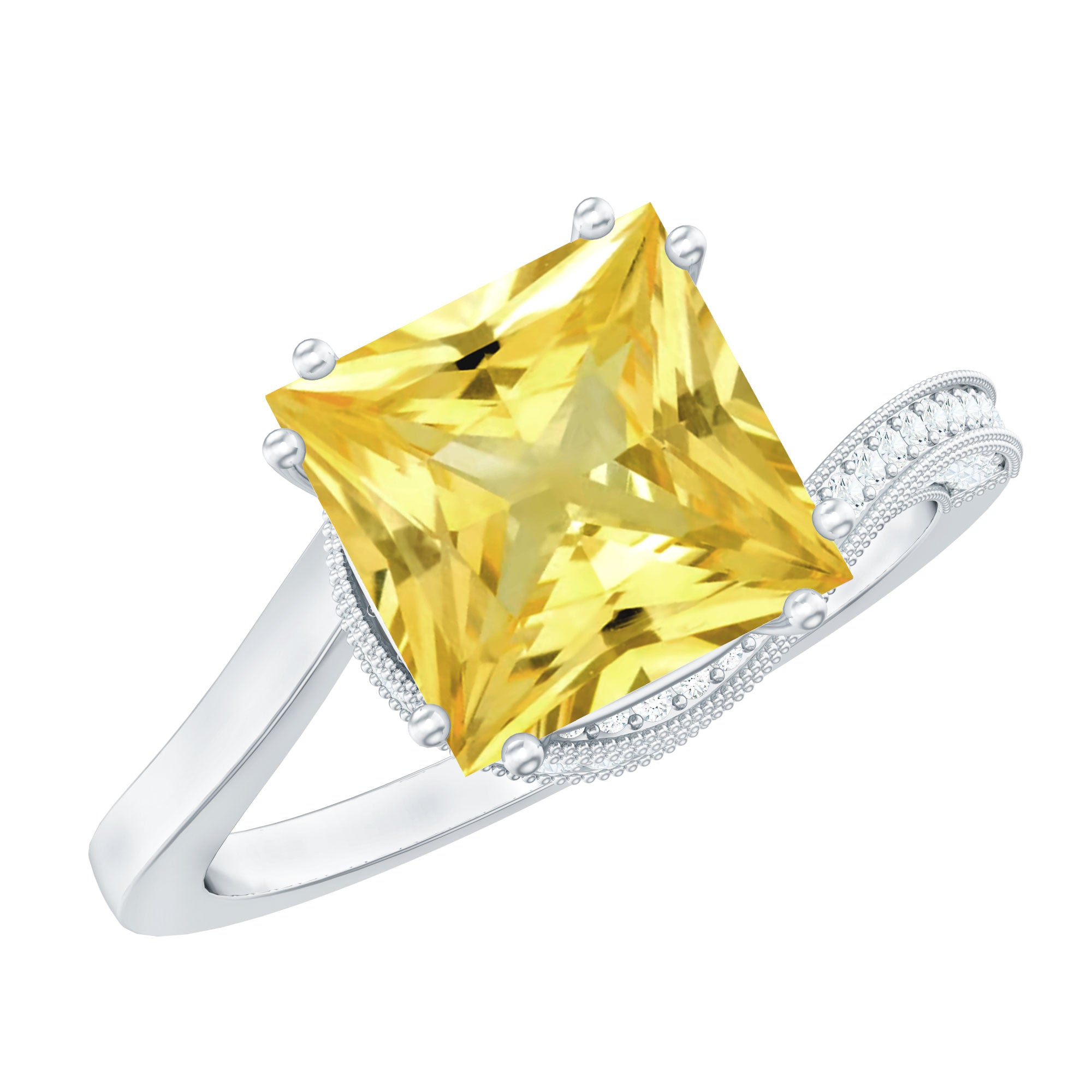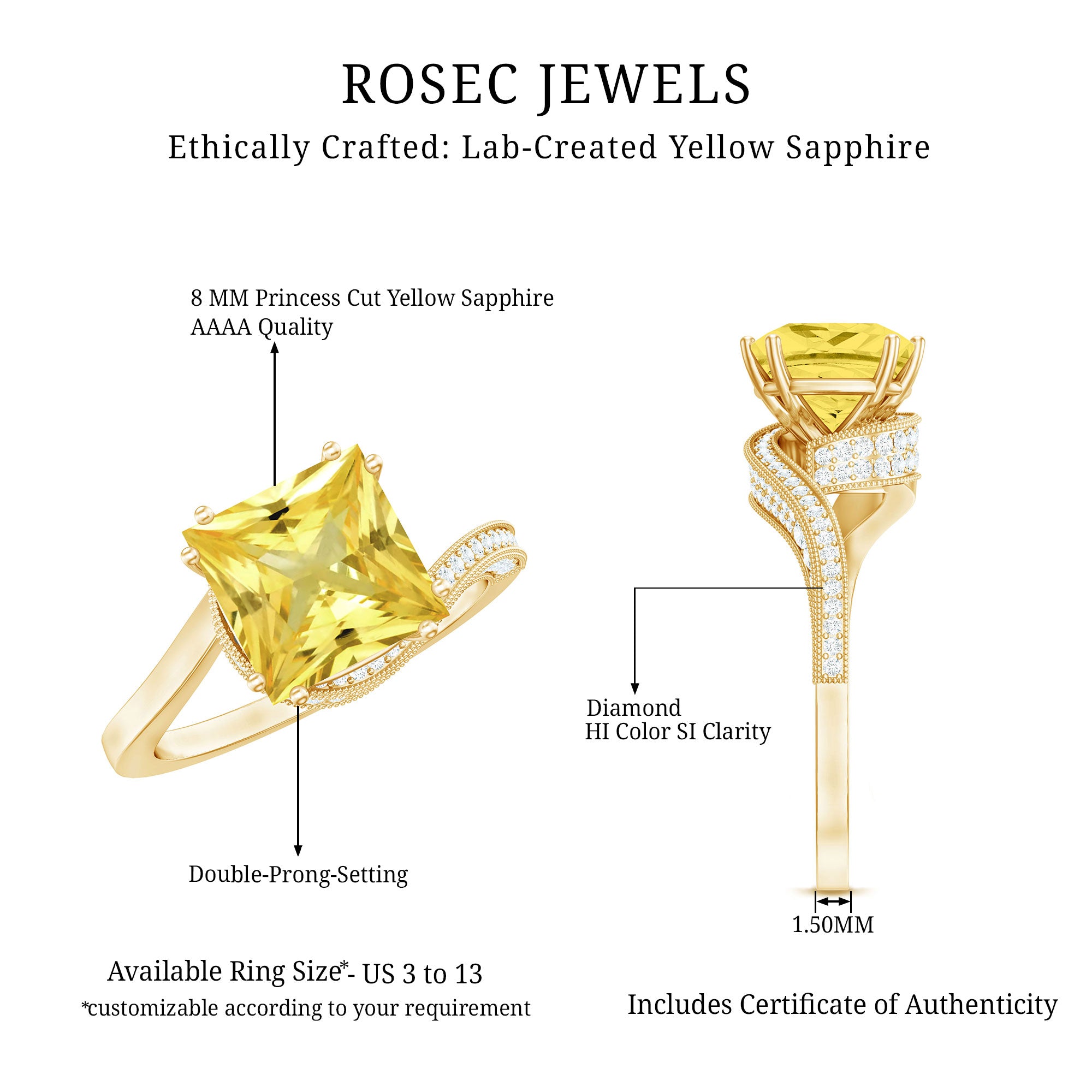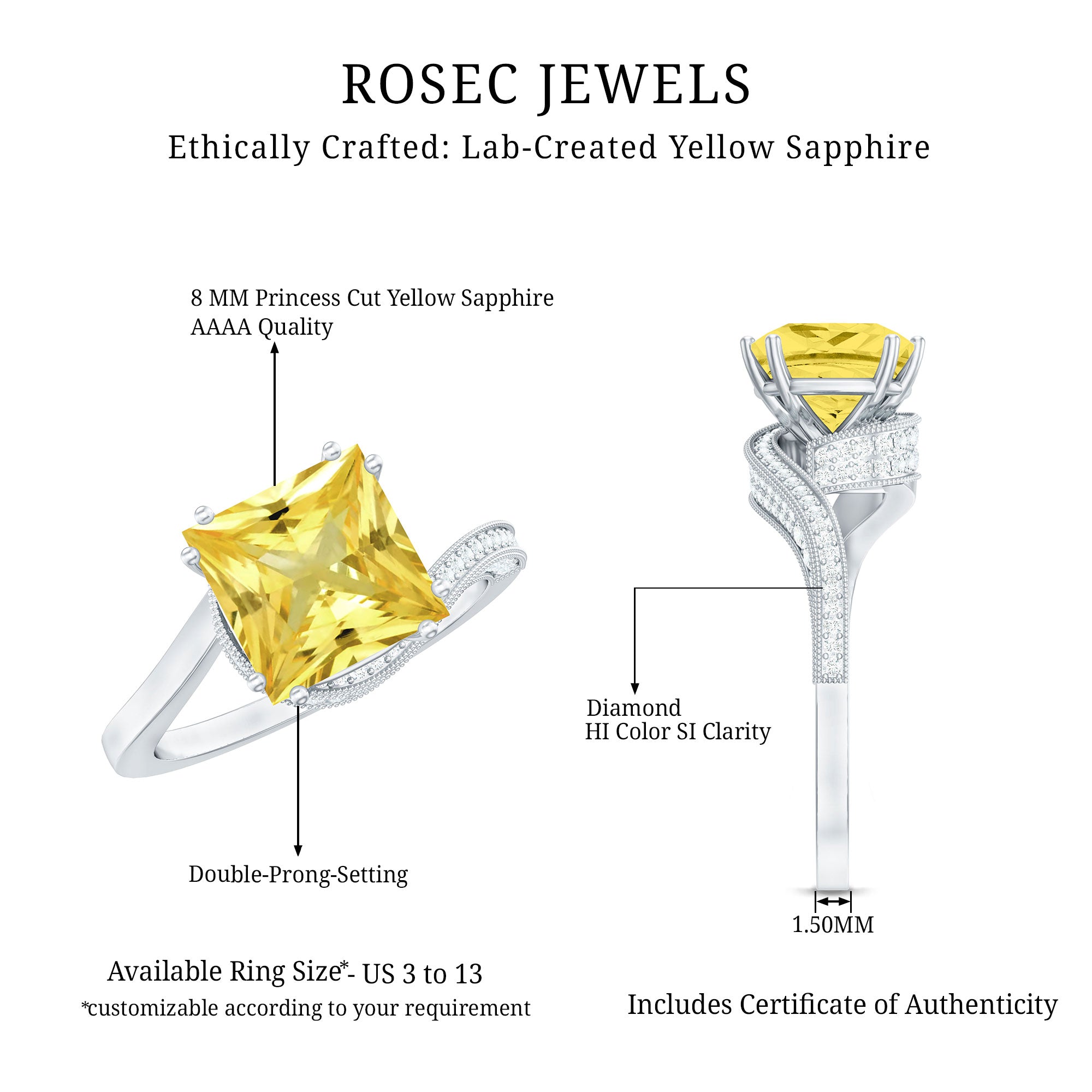 This simple yet exquisite Bypass Engagement Ring features a Princess Cut Lab Grown Yellow Sapphire secured by Double Prong Setting while Round Shape Diamond adds the right amount of sparkle. You can wear this Created Yellow Sapphire Ring with your everyday or party attire, to create unique and stunning looks.
