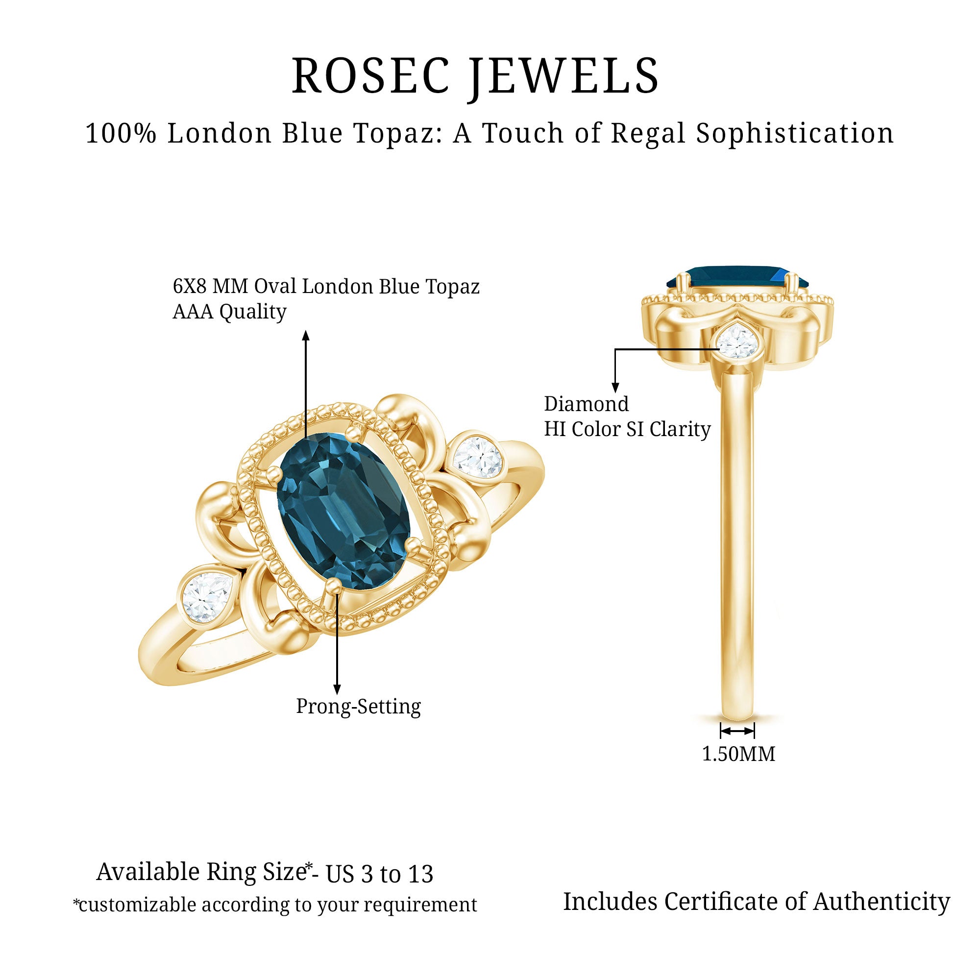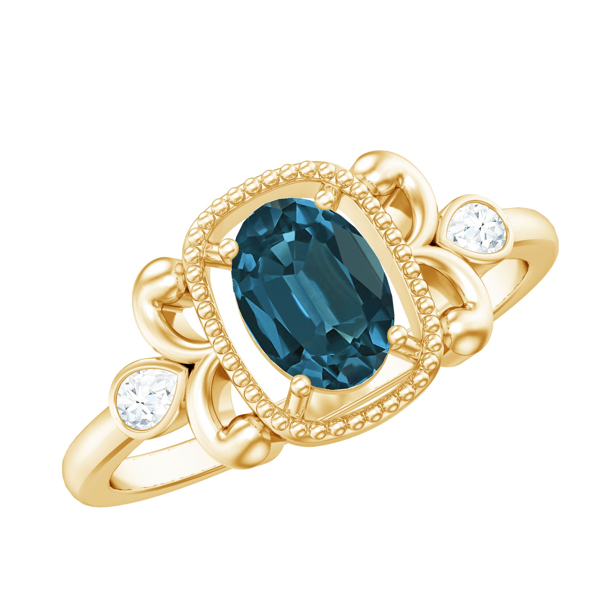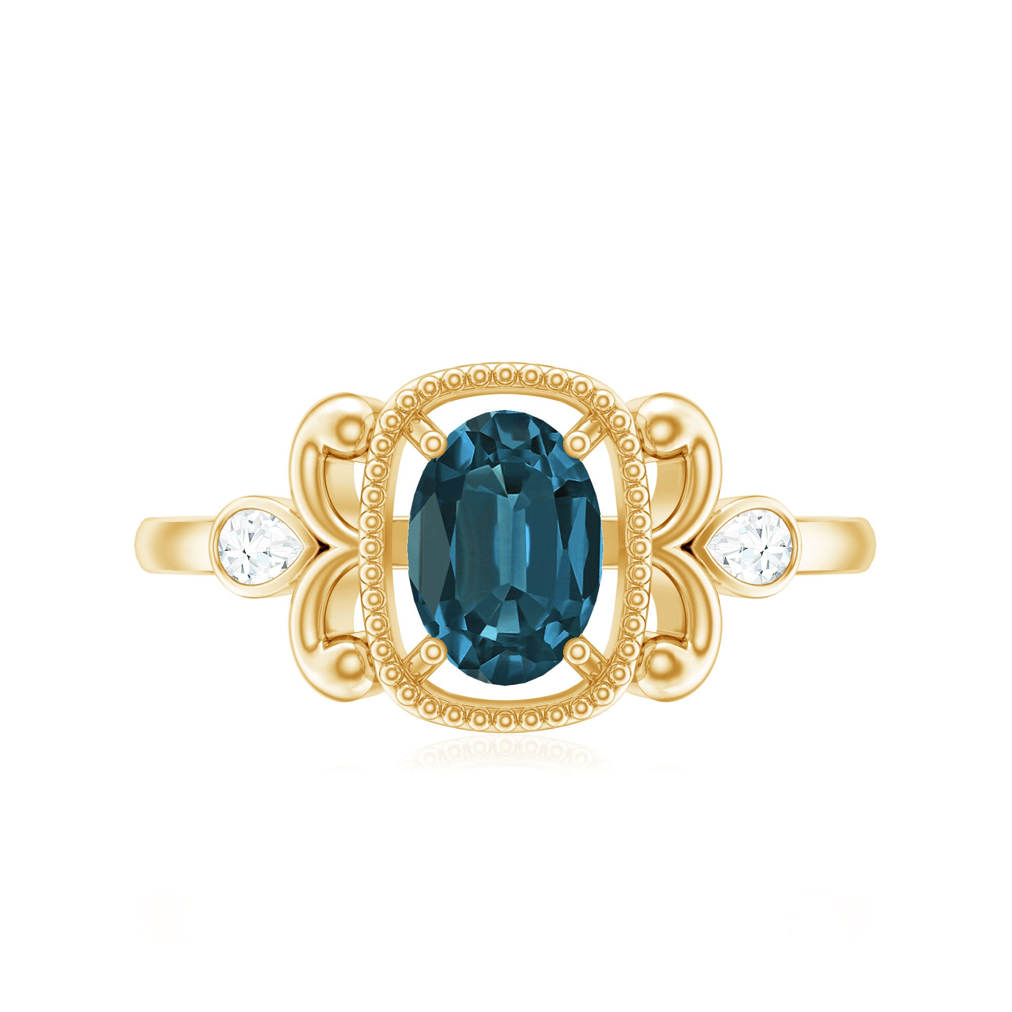 Make a statement with a ring that draws inspiration from the elegance of Vintage. This London Blue Topaz Engagement Ring combines vintage allure with a bold aesthetic in an Art Deco inspired style that is vibrant and sparkling. It showcases a beautiful 6X8 MM oval cut London blue topaz, held securely in a prong setting and surrounded by beaded embellished metal and twisted metal detailing on both sides that imparts a distinctive character to the Antique Engagement Ring. To add the perfect touch of shimmer, two pear shape diamonds are meticulously set on both sides of the shank in a bezel setting, creating a subtle yet eye-catching accent that enhances the depth of the piece. The twisted design and lines echo the geometry and style of the Art Deco period, embodying a timeless quality with a creative twist. This piece is designed for someone who does not merely follow trends but rather sets them, someone who appreciates the blend of vintage detail and contemporary edge. This Blue Topaz and Diamond Engagement Ring is offered in a variety of ring sizes, and you can select from different metal purities to suit your personal style. Additionally, we provide a complimentary ring sizer to assist you in finding the perfect fit effortlessly. This Oval Blue Topaz Ring is accompanied by a certificate of authenticity for the gemstone, allowing you to shop with assurance.