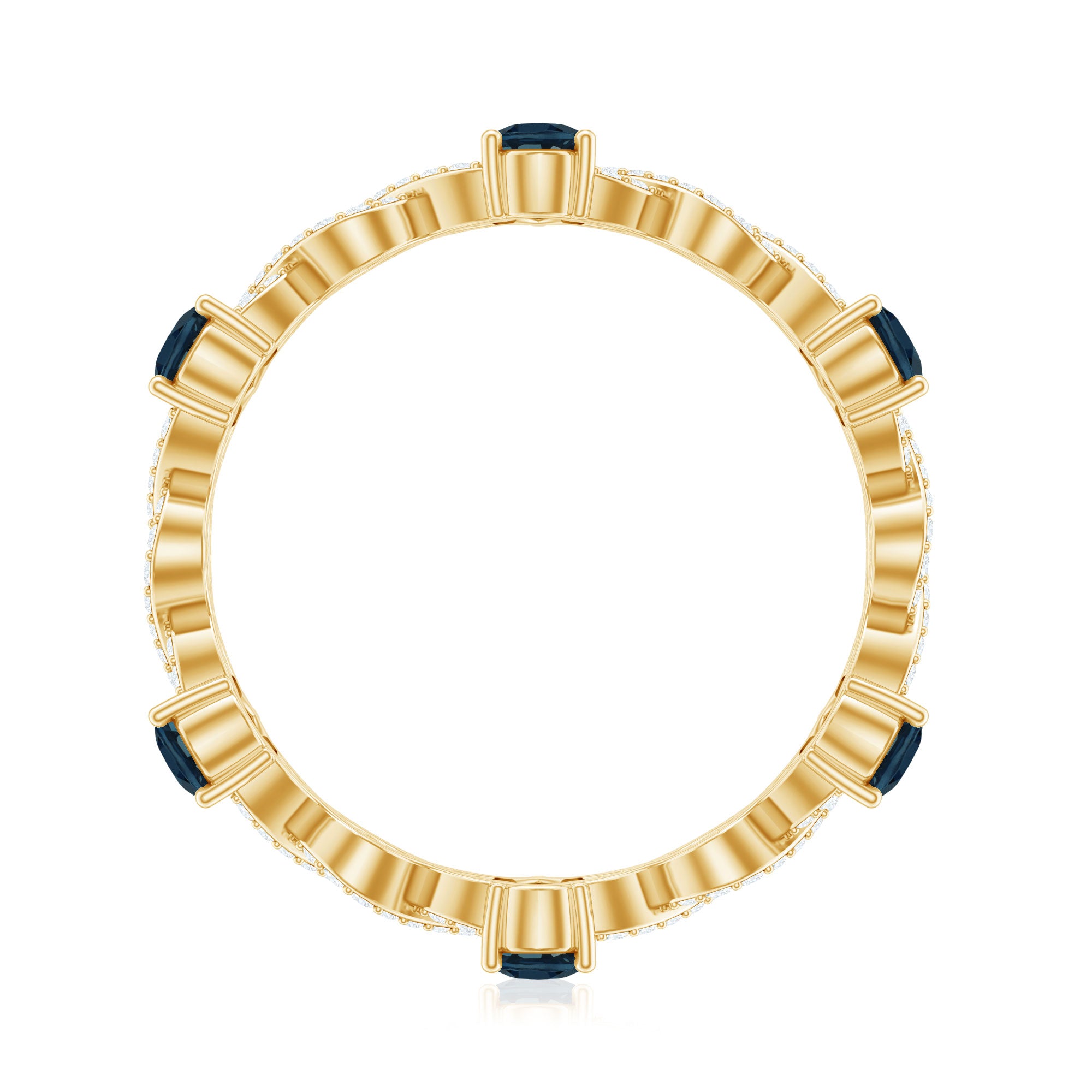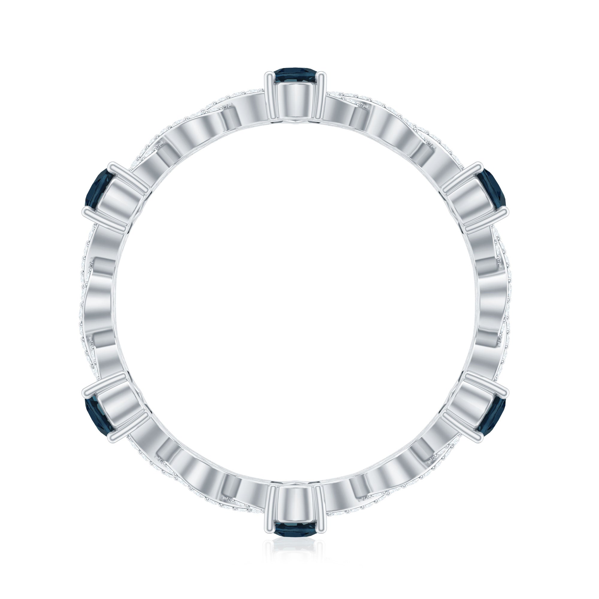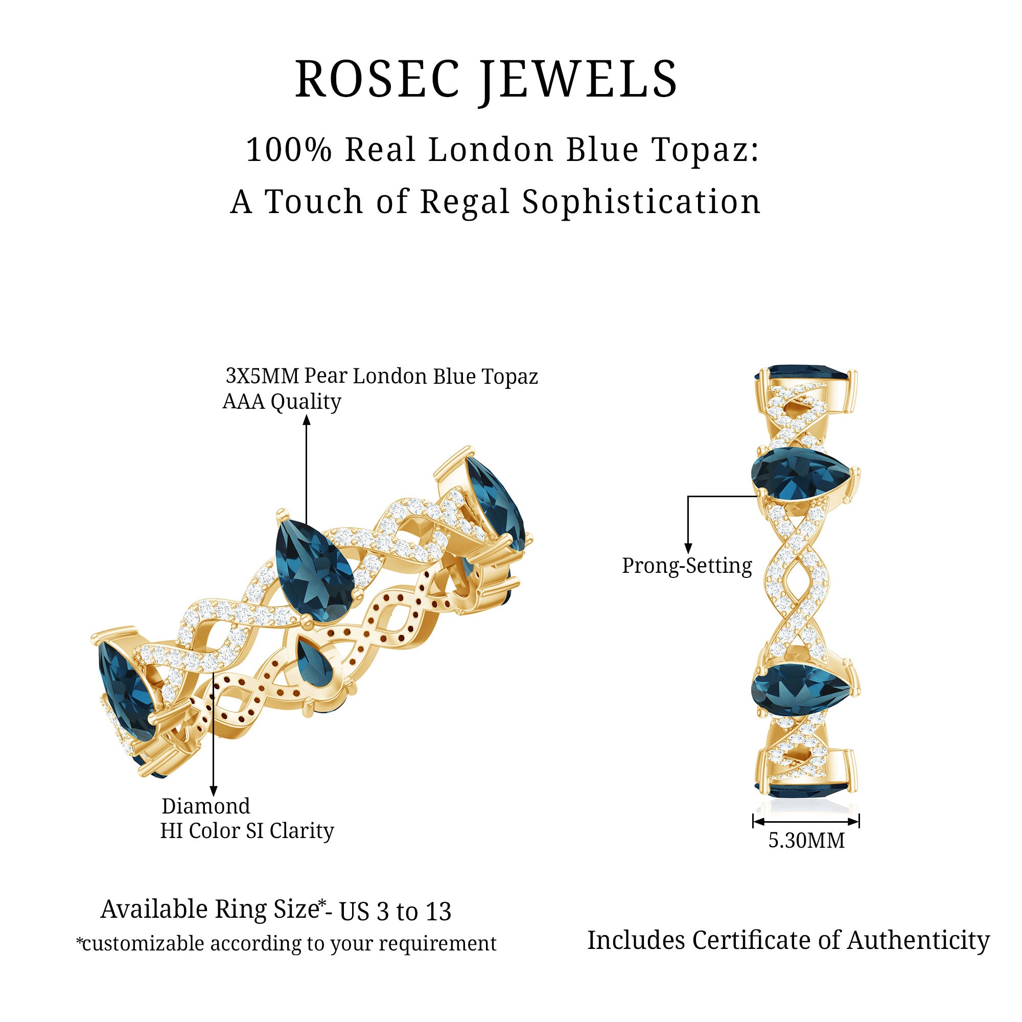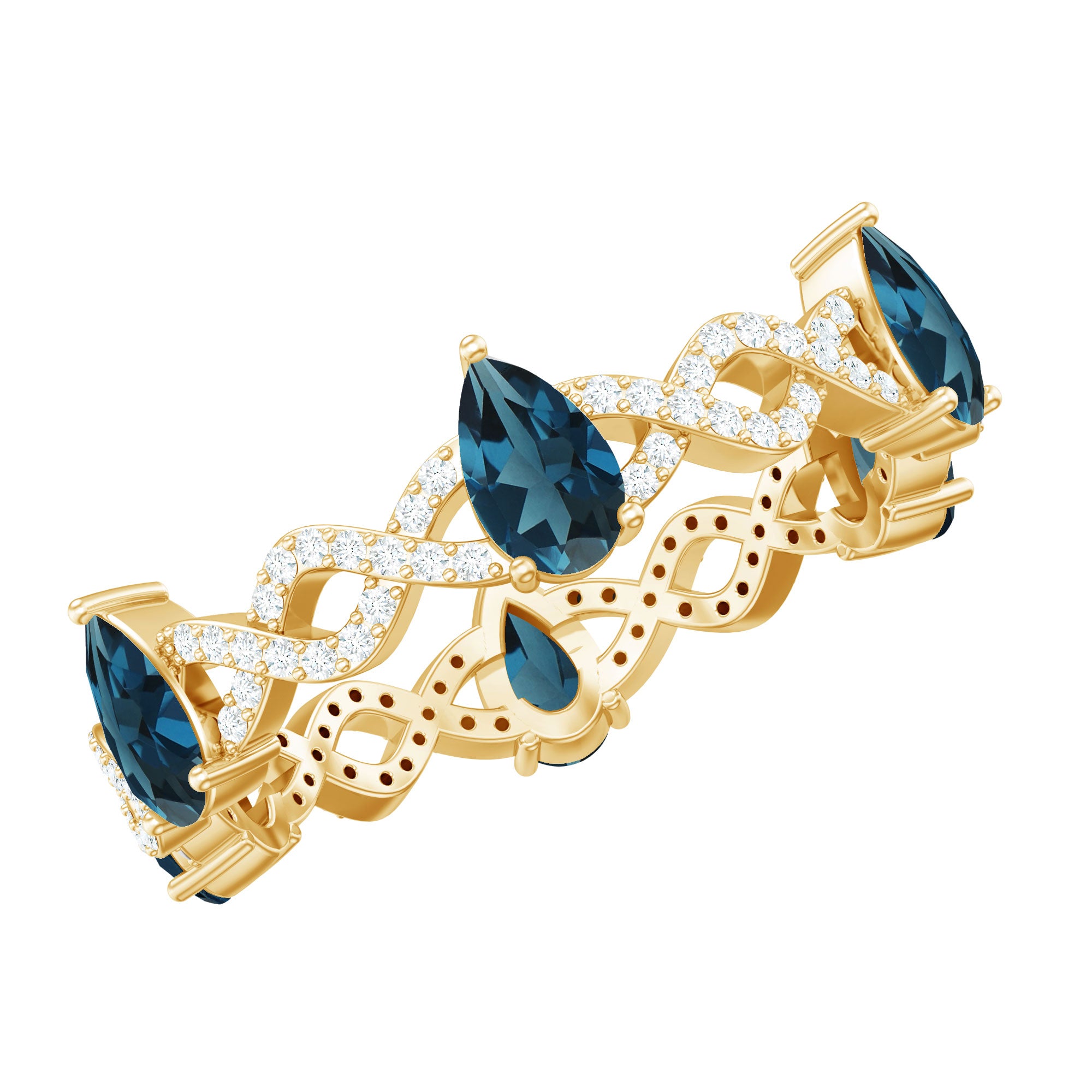 This Full Eternity Band Ring perfectly combines boldness and elegance, designed to elevate your outfit instantly. Whether you are preparing for a special evening or simply wish to enhance your everyday stack with something distinctive, this Blue Topaz Wedding Band delivers the wow factor without being excessive. The Crossover Eternity Band showcases exquisite pear-cut london blue topaz gemstones, each meticulously set in a secure prong setting to emphasize its teardrop shape. Between each blue topaz stone, round-cut diamond stones are positioned over a flowing crossover design, imparting a graceful movement to the band. The true allure of this piece lies in the harmonious interplay between the deep blue topaz and the shimmering diamonds. This contrast adds depth, while the crossover style introduces a contemporary twist that feels stylish. This Blue Topaz and Diamond Ring is perfect for those who appreciate rings with a touch of uniqueness, whether worn alone for a striking appearance or stacked with other cherished pieces. Additionally, it serves as a beautiful wedding band, a chic anniversary gift, or simply a delightful treat for oneself. If you appreciate elegant details infused with a hint of luxury, this piece is tailored for you.