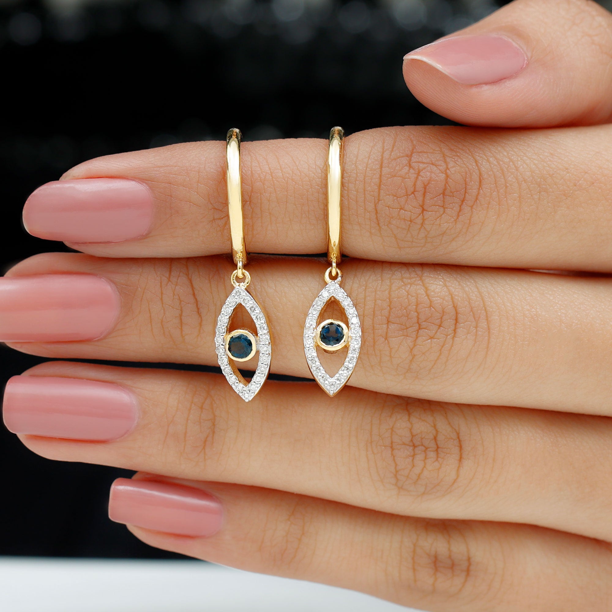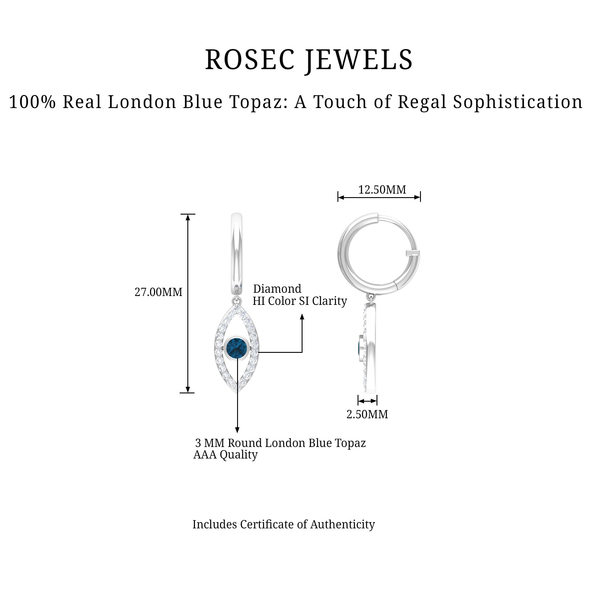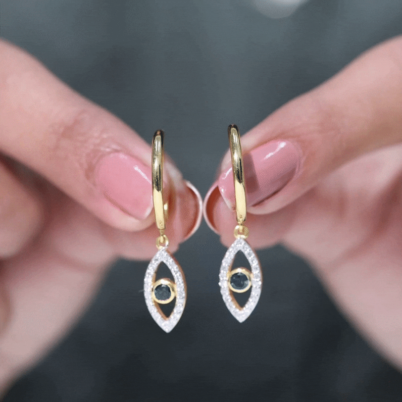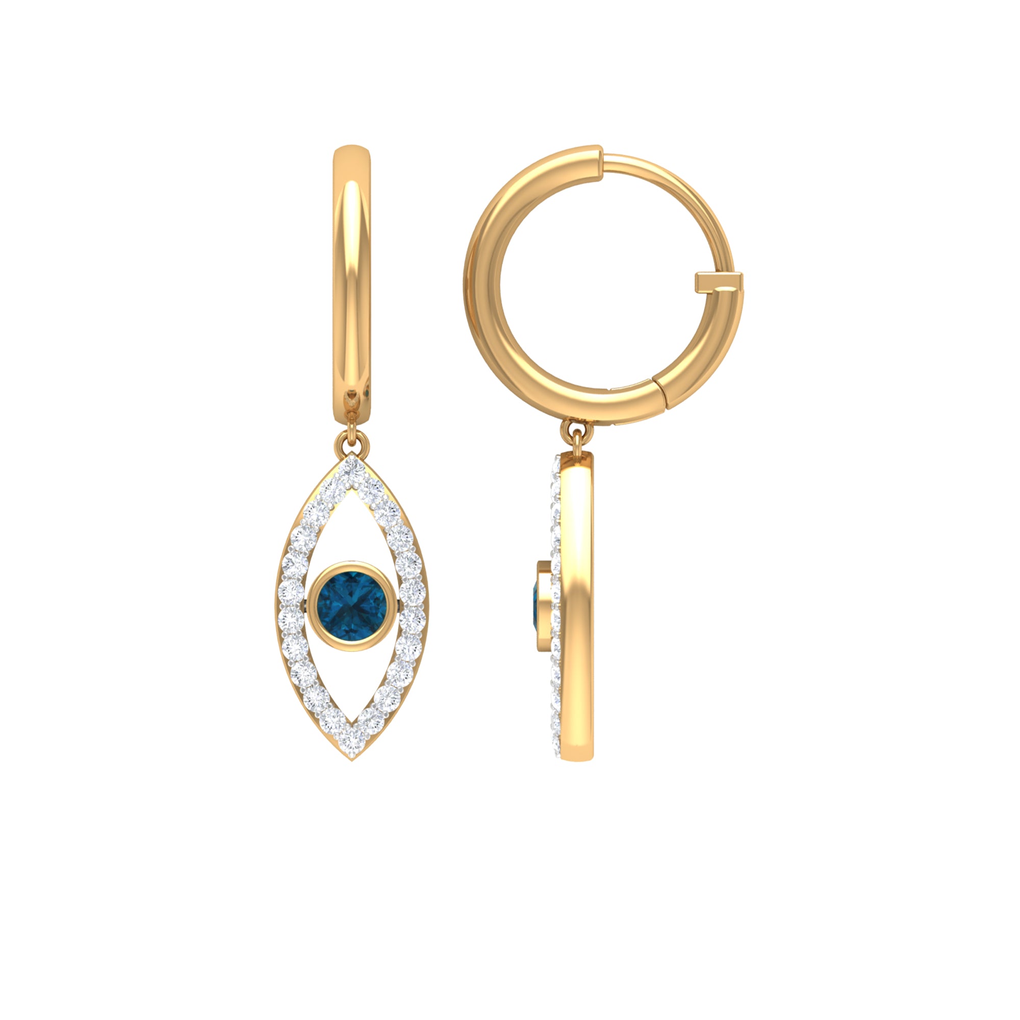 Get ready to turn heads with our stunning Evil Eye Drop Earrings, featuring a unique design that is sure to catch the eye. The Evil Eye charm hangs delicately from a hoop and is adorned with a Round Shape London Blue Topaz in a Bezel Setting, while Round Shape Diamond stones are beautifully studded on the Pave Setting. These earrings are both unique and eye-catching, making them the perfect accessory to add a touch of glamour to any outfit.