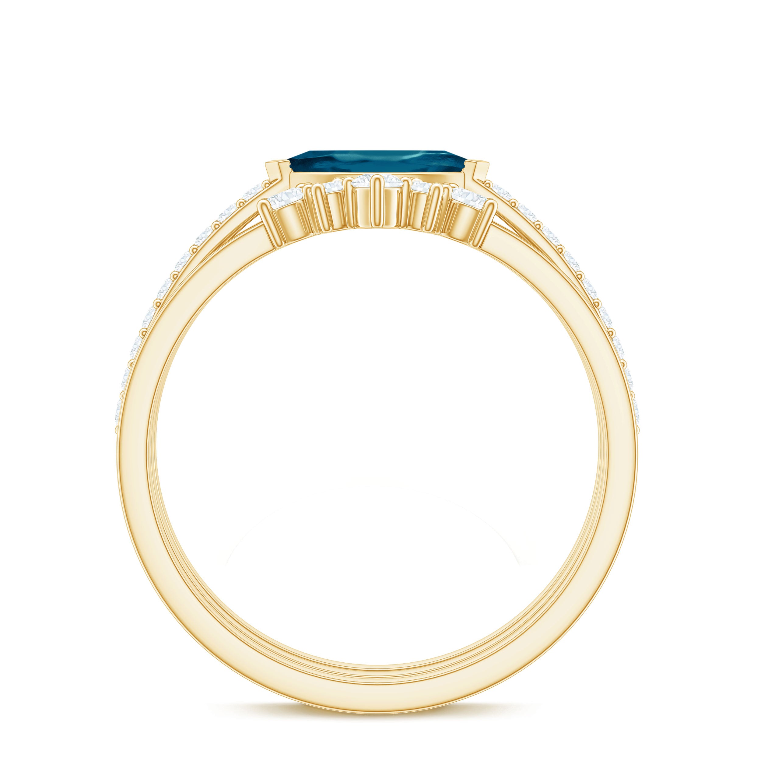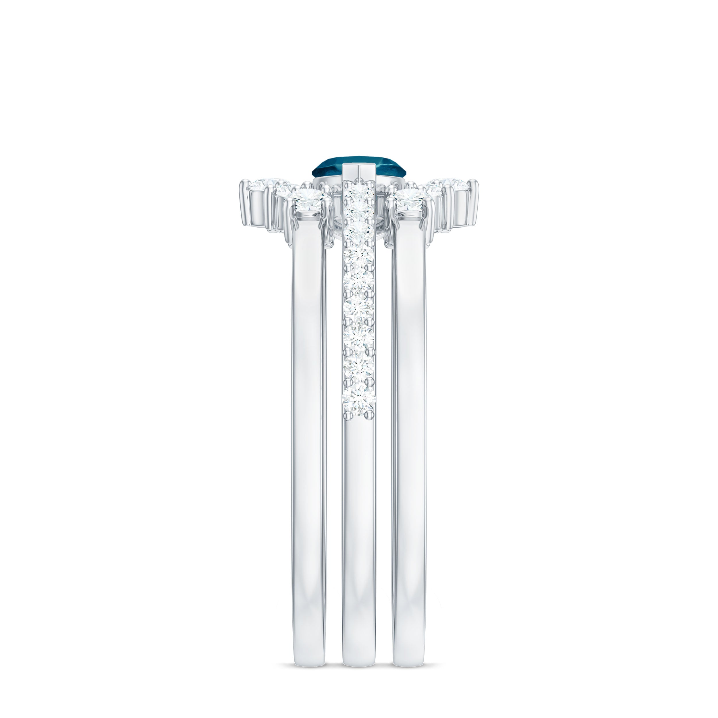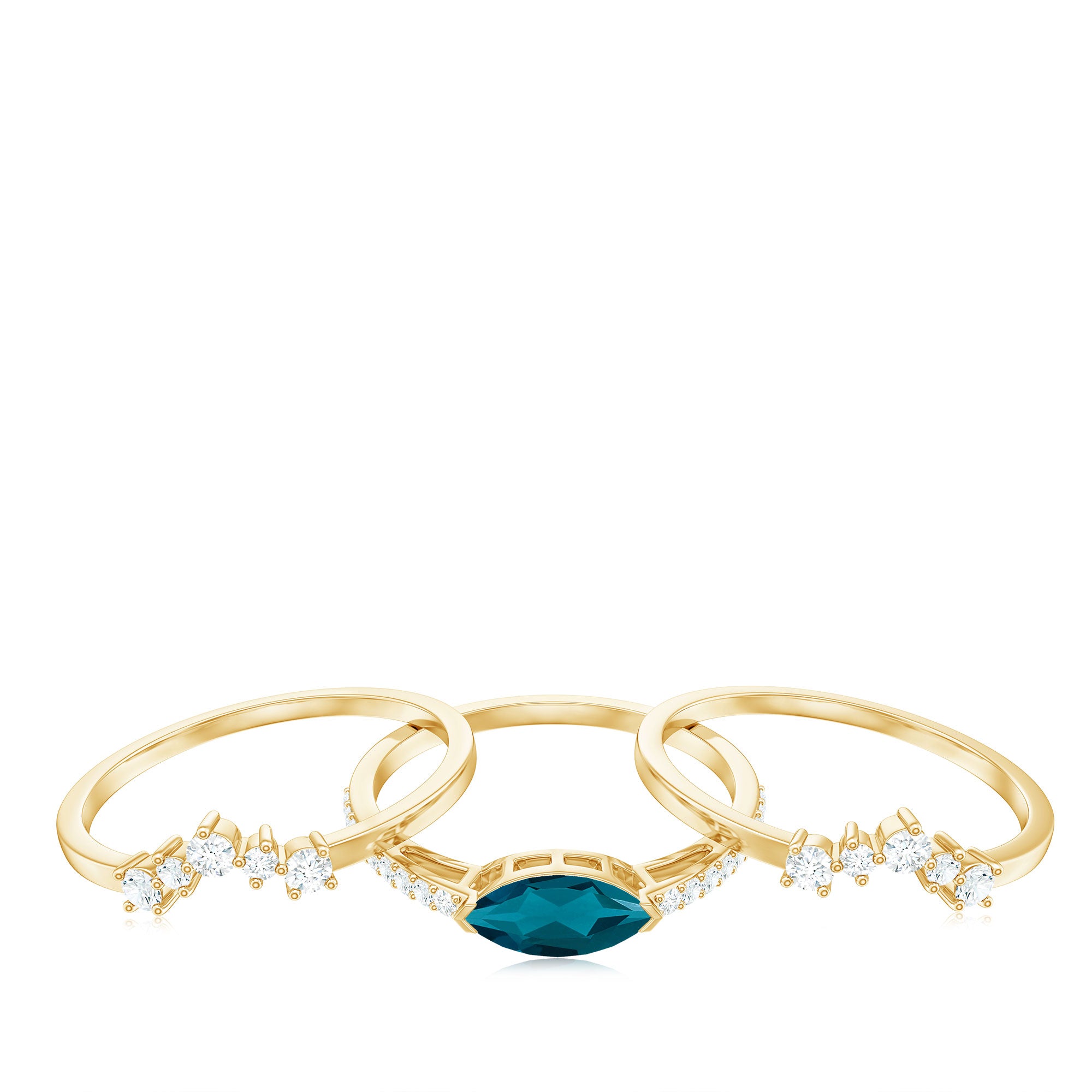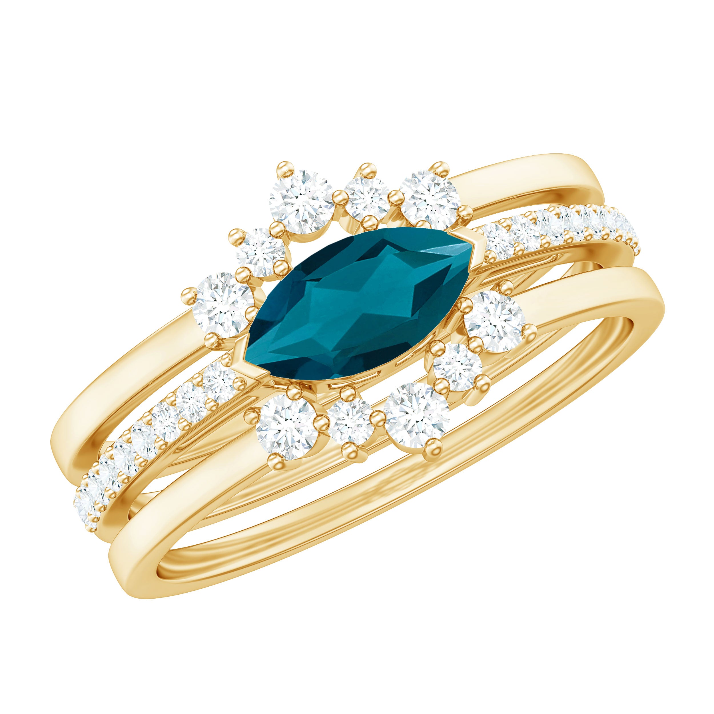 Embrace your new beginning with a ring set that embodies both contemporary style and profound significance. This exquisite Blue Topaz Wedding Ring Set is crafted to attract attention while carrying deep emotional resonance. Meticulously designed, this 3 Piece Bridal Set presents a harmonious blend of sophistication, fashion, and meaning. At the core of the set lies a 4X8 MM marquise cut london blue topaz, positioned in an east-west orientation within a secure prong setting. Flanking the center stone are round, sparkling diamonds that add a touch of brilliance, elegantly framing the blue topaz and enhancing the overall appearance of the engagement ring. Accompanying the main ring are two crown-shaped enhancer bands that infuse additional charm and intricacy into the Blue Topaz Engagement Ring Set. Each band is adorned with round diamond stones arranged in a graceful curve, forming a delicate border around the center ring. These bands not only accentuate the allure of the engagement ring but also impart a regal essence to the entire ensemble. Collectively, the three rings create a cohesive bridal aesthetic that is ideal for those who appreciate a fusion of traditional and modern design. You have the option to wear all three for a striking statement or to mix and match them for various occasions. Crafted for comfort and durability, this Natural London Blue Topaz Ring Set will serve as a daily reminder of your commitment.