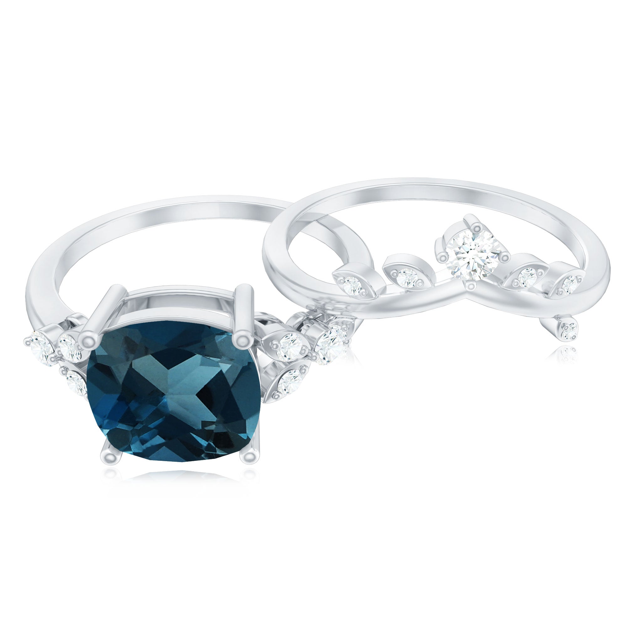 This London Blue Topaz Ring Set is crafted to enhance beauty, brilliance, and elegance during one of the most significant moments in your life. The set comprises an engagement ring and a complementary curved band, designed to fit together flawlessly. At the center of the engagement ring is a breathtaking 8 MM Cushion cut London Blue Topaz, securely held in a prong setting. Encircling the central stone is a floral-inspired arrangement of round Diamond stones on both sides, which adds a delicate touch to the striking center. The accompanying curved ring is both simple and sophisticated. It showcases a series of round diamond stones that gently curve to align with the engagement ring. Whether worn together or individually, both rings present a polished and timeless look. This Blue Topaz Wedding Ring Set is ideal for a bride seeking a classic design with an added touch of sparkle. Whether you are making a proposal or celebrating a special occasion, this Cushion Cut Engagement Ring with Wedding Band encapsulates the moment with grace and thoughtfulness.