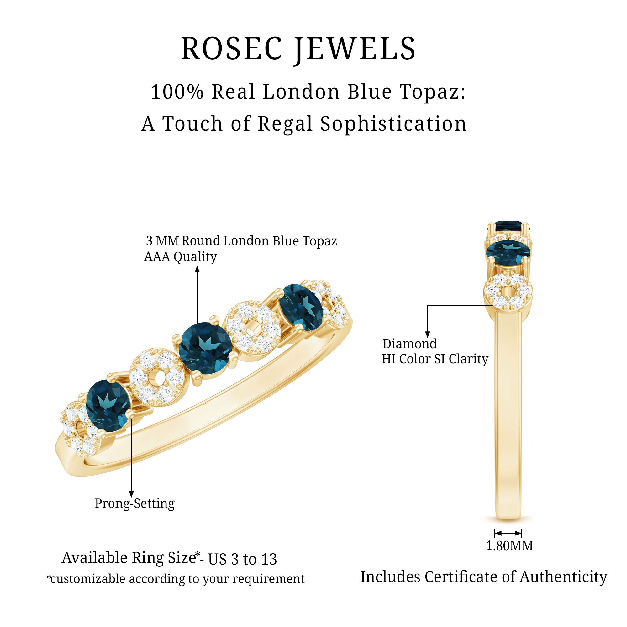 Unbroken, unending, and unforgettable - this Blue Topaz Wedding Band transcends mere symbolism; it embodies a promise. A timeless emblem of everlasting love, this Half Eternity Band is designed with exquisite brilliance and lasting elegance. It showcases a remarkable blend of round shape london blue topaz stones set alternatively with small round shape diamonds set in a circle style, each gem carefully chosen for its impeccable AAA quality Blue topaz and HI-SI quality diamonds. The outcome is a radiant band that not only refracts light but also signifies the profoundness of your commitment. With a secure prong setting, the stones are arranged to capture light from every angle, guaranteeing a luminous display that enchants the observer. Its sophisticated design permits this Wedding Anniversary Band to be worn solo for a classic look or stacked with an engagement ring or other bands for enhanced flair and drama. This London Blue Topaz Eternity Band acts as a perpetual reminder of cherished moments, whether you are commemorating a wedding, anniversary, birthday, or a significant occasion of self-love. Beautifully crafted and eternally significant, this Stackable Eternity Band elevates everyday wear into a celebration of what truly matters.