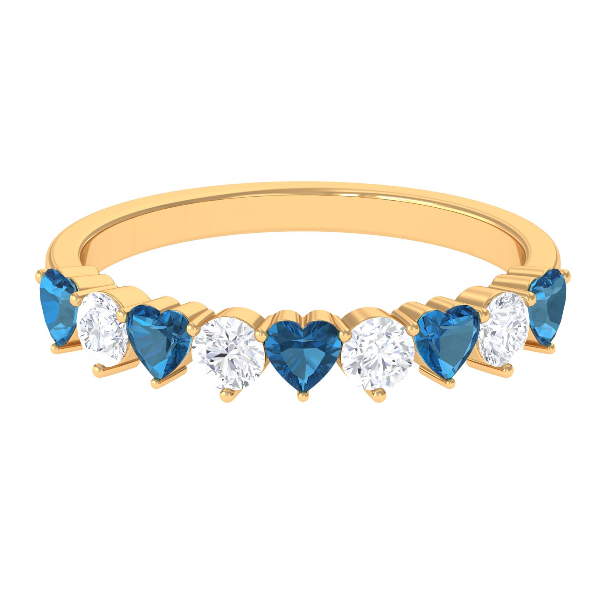 A piece of jewelry that conveys the essence of love. This Blue Topaz Wedding Band embodies significance in every aspect. Crafted to celebrate the enduring connections that last a lifetime, this Heart Eternity Ring serves as an elegant emblem of commitment, meticulously designed to enhance your daily attire. It showcases carefully chosen 4 MM heart-shaped London Blue Topaz gemstones, securely set in prong settings. Each london blue topaz is accompanied by sparkling round-cut moissanites, each nestled within delicate heart-shaped frames. The alternating design creates a harmonious interplay of contrast and brilliance, imparting a gentle romantic glow to the overall aesthetic. Created with care and precision, the Heart Wedding Band features a half eternity style, offering perfect balance and comfort for everyday wear. It is ideal for individuals who appreciate jewelry with a personal touch, embodying both style and sentiment in equal measure. Whether worn solo or stacked with other rings, it brings a subtle elegance to your hand. The heart motifs introduce a romantic touch, making it a considerate choice for an anniversary, a promise, or simply a meaningful gift. This handcrafted Half Eternity Band serves as a tender reminder of enduring love and the cherished moments shared along the journey. Whether commemorating a significant occasion or merely expressing your feelings for someone special, this Eternity Stackable Ring is a timeless treasure, designed to be valued every day.
