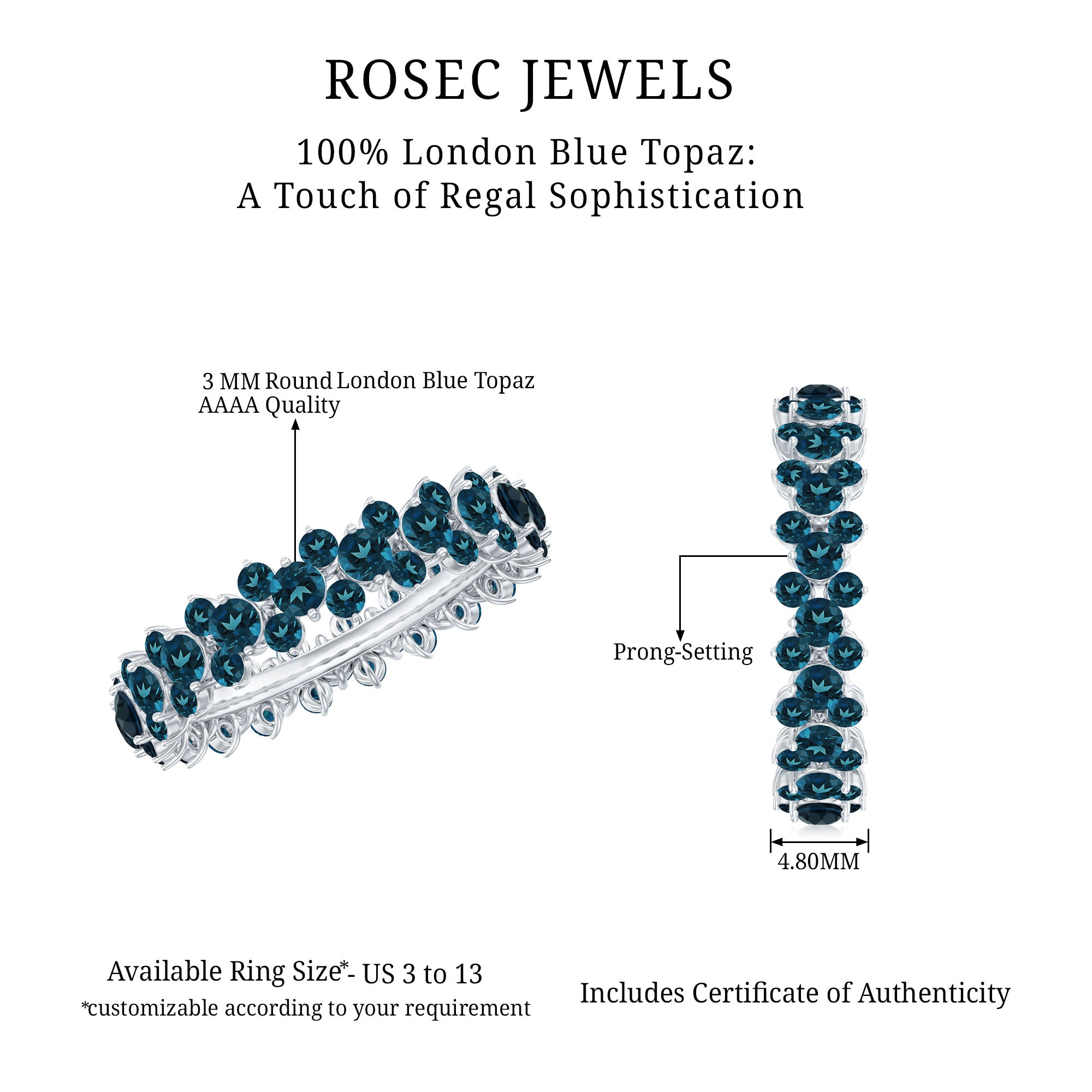 Elevate your jewelry collection with a touch of romance and sophistication through our stunning London Blue Topaz Eternity Ring. This timeless piece features a continuous array of round-shaped AAA quality London Blue Topaz gemstones. Each stone is securely set in a classic prong setting, allowing its brilliance to shine prominently. The cluster design of this Blue Topaz Wedding Band offers an elegant yet versatile accessory, ideal for adding a splash of color to your daily ensemble or enhancing your outfit for special events. Whether it is worn as an Eternity Wedding Band, an anniversary ring, or a standalone statement piece, its intricate craftsmanship and enchanting color will undoubtedly leave a memorable impression. Emanate uniqueness and capture the spotlight from every angle with this captivating Cluster Eternity Ring. Whether paired with a casual or formal outfit, this Cluster Wedding Band Ring adds a touch of glamour and sophistication to any ensemble, making it the perfect accessory for various occasions. Representing your love, this Topaz Anniversary Ring and encircles the finger in a full eternity design, stirring up feelings of romance and nostalgia. This Eternity Anniversary Band lets you commemorate your union with a symbol of stunning beauty that sparkles more with each glance. Its detailed craftsmanship, when combined, creates a wedding ring that will genuinely connect with you.