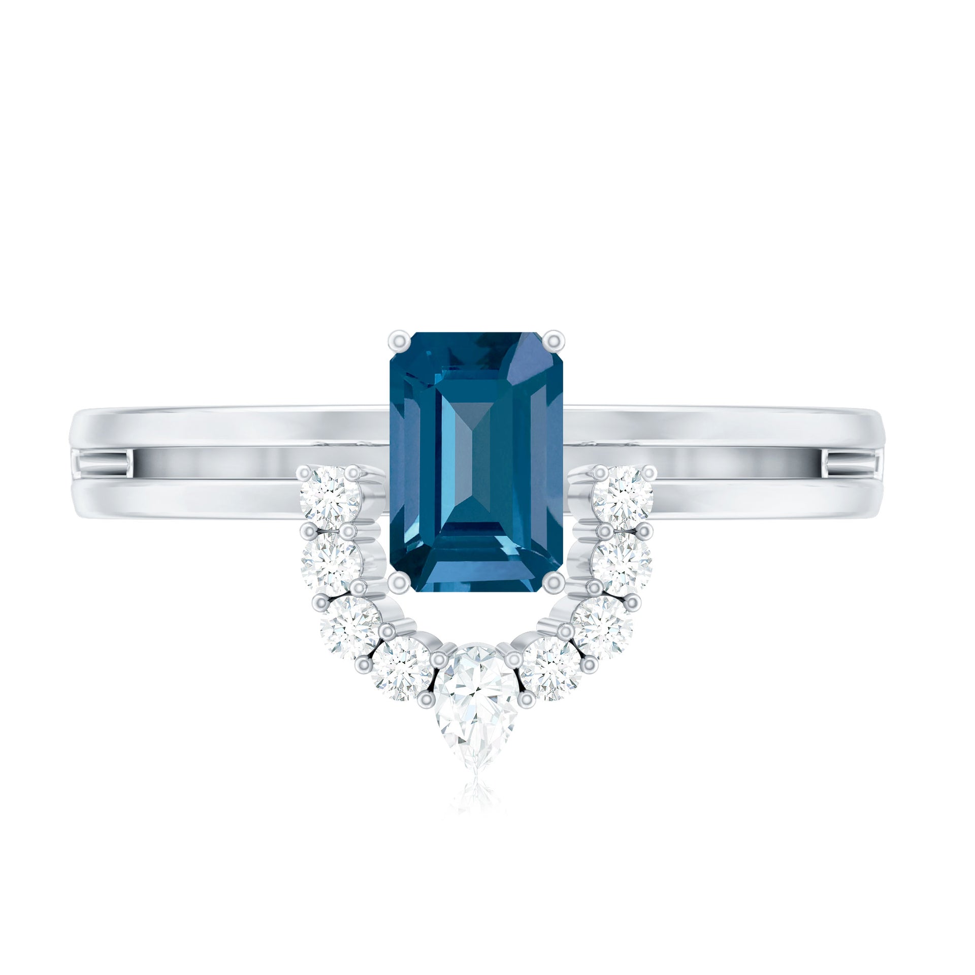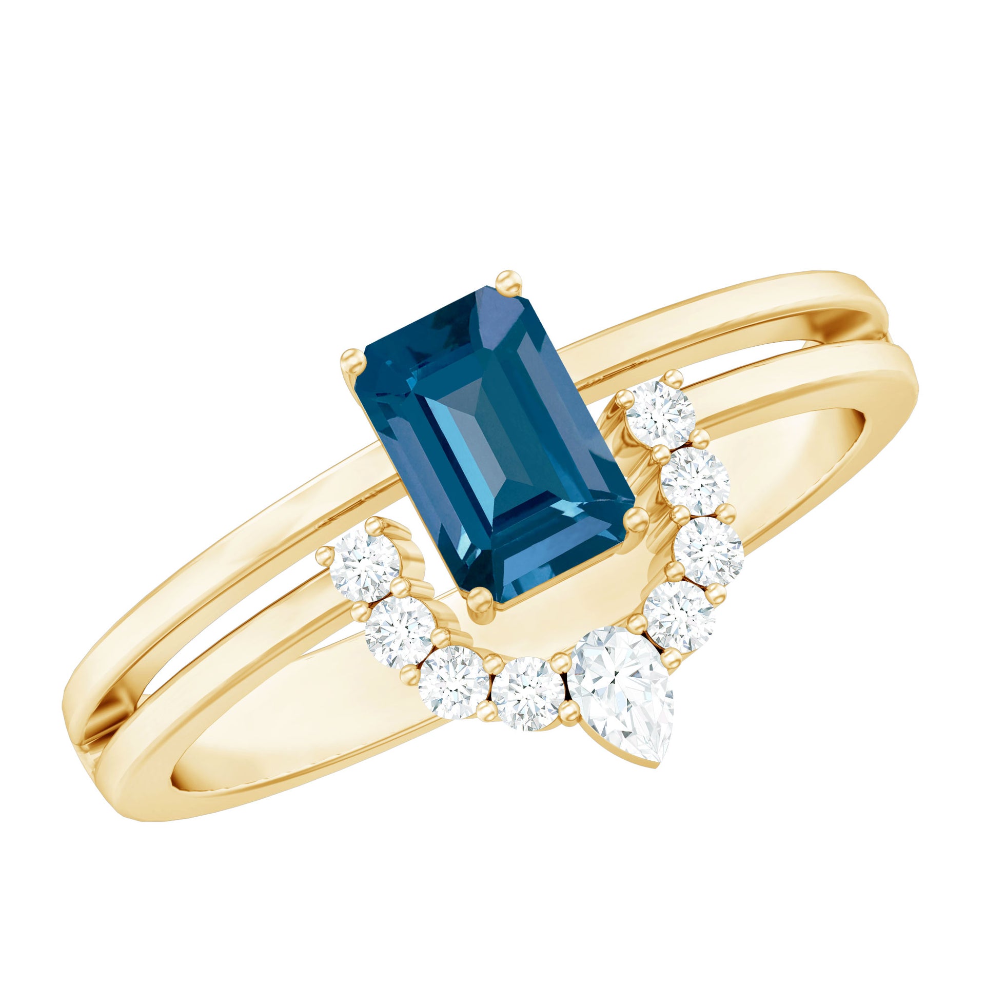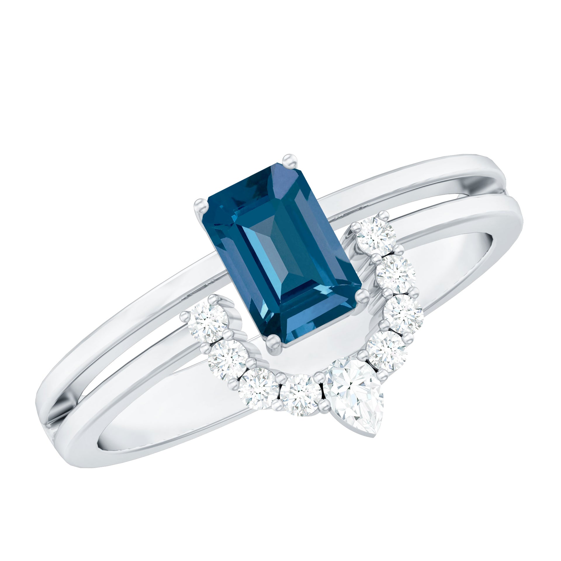 Emerald Cut London Blue Topaz Double Band Engagement Ring with Diamond