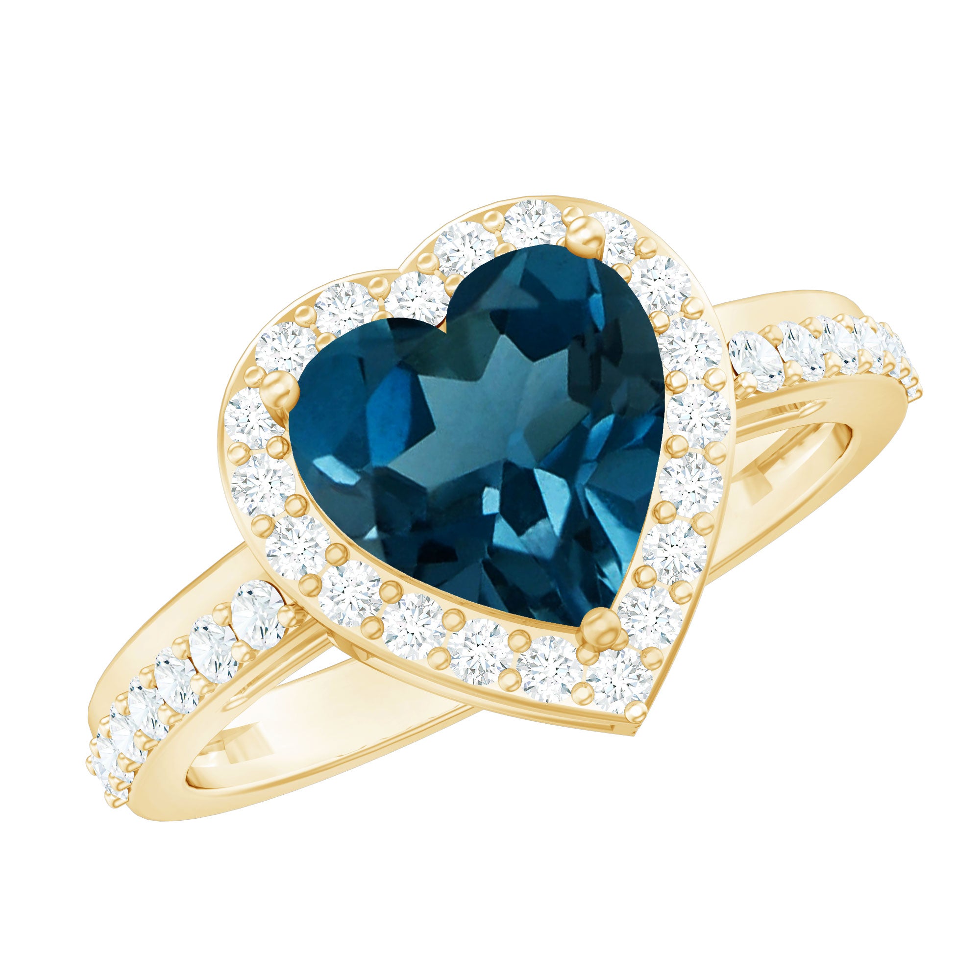 Express your feelings with a sparkle that resonates from the heart. This charming Heart Shaped Topaz Ring transforms ordinary moments into unforgettable memories. At the heart of the design, a 8 MM heart-shaped London Blue Topaz is securely held in prong setting. Encircling the Blue topaz is a fine halo of round diamonds, providing the perfect amount of sparkle. The band offers a graceful appearance, embellished with round diamond side stones. Whether you are making a promise or celebrating a significant milestone, this London Blue Topaz Promise Ring serves as a beautiful reminder of loyalty and love. Simple yet profound, this Heart Promise Ring encapsulates deep emotions within an elegant design. It is suitable for daily wear, yet feels special enough for those extraordinary occasions. Made with AAA quality london blue topaz and HI-SI quality diamonds, this Heart Halo Ring is not only stunning but also ethically produced. The Blue Topaz and Diamond Ring is presented in a signature jewelry box and comes with a certificate of authenticity, making it ready to be gifted upon arrival.