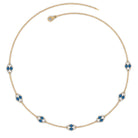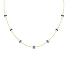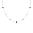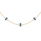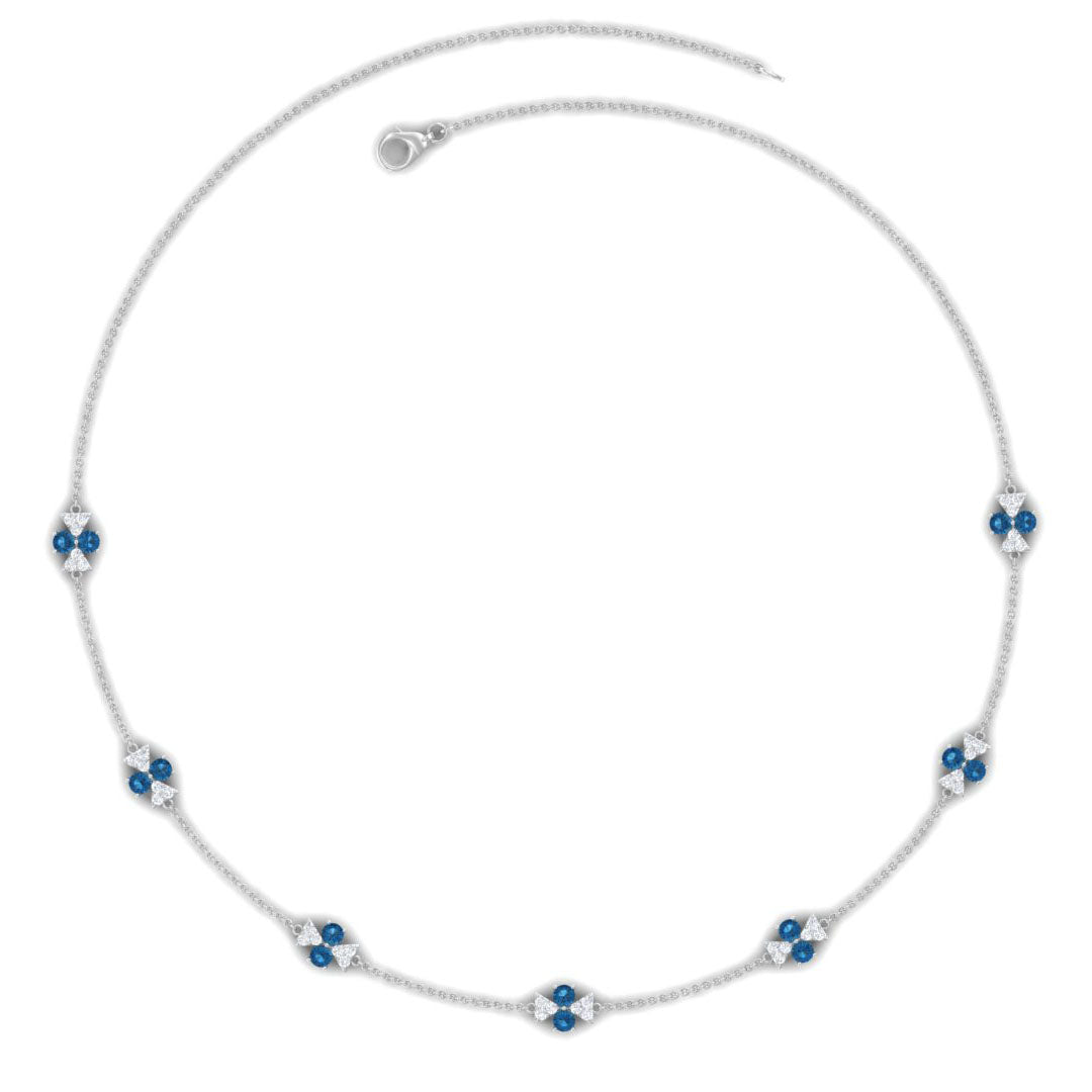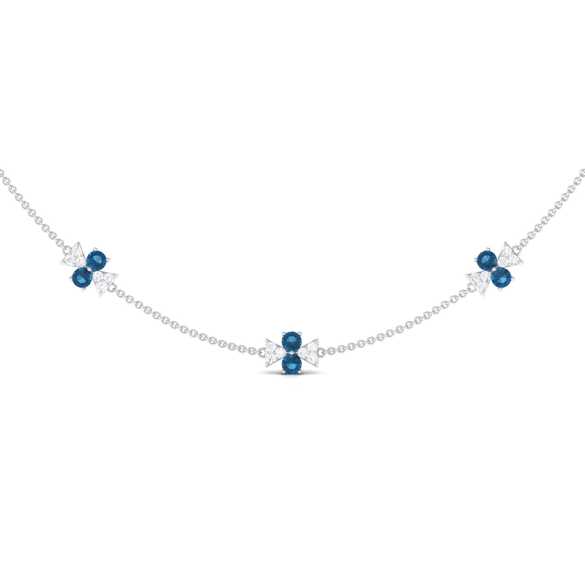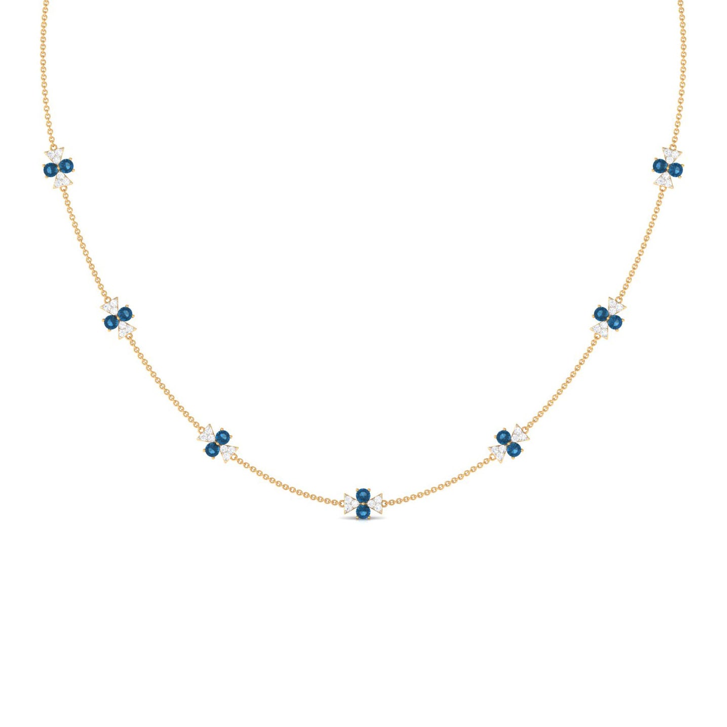 This necklace is a stunning combination of London Blue Topaz and Moissanite that is sure to win her heart. The contemporary design features round-cut London Blue Topaz stones in a prong setting, accented with Moissanite stones. The necklace is composed of solid gold and features a gold station chain, making it a cute and stylish jewelry piece for your beloved.