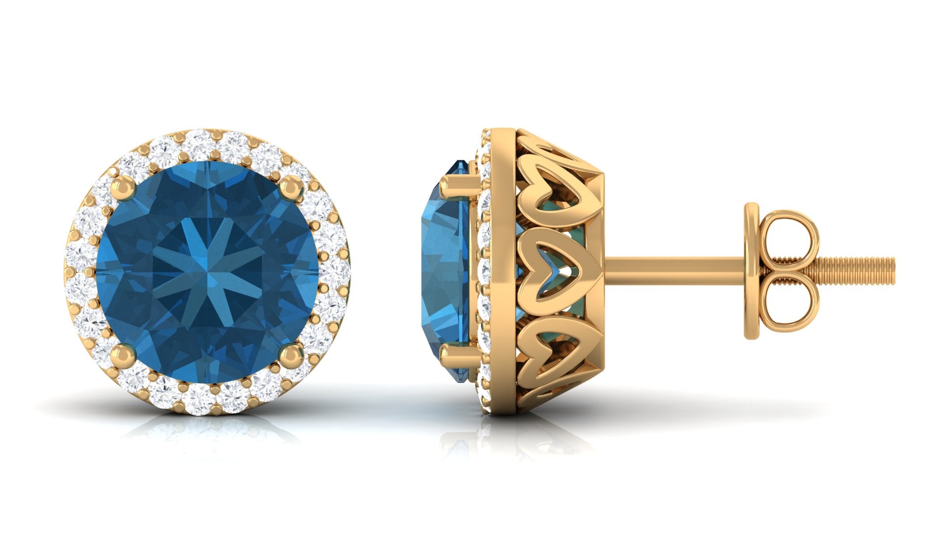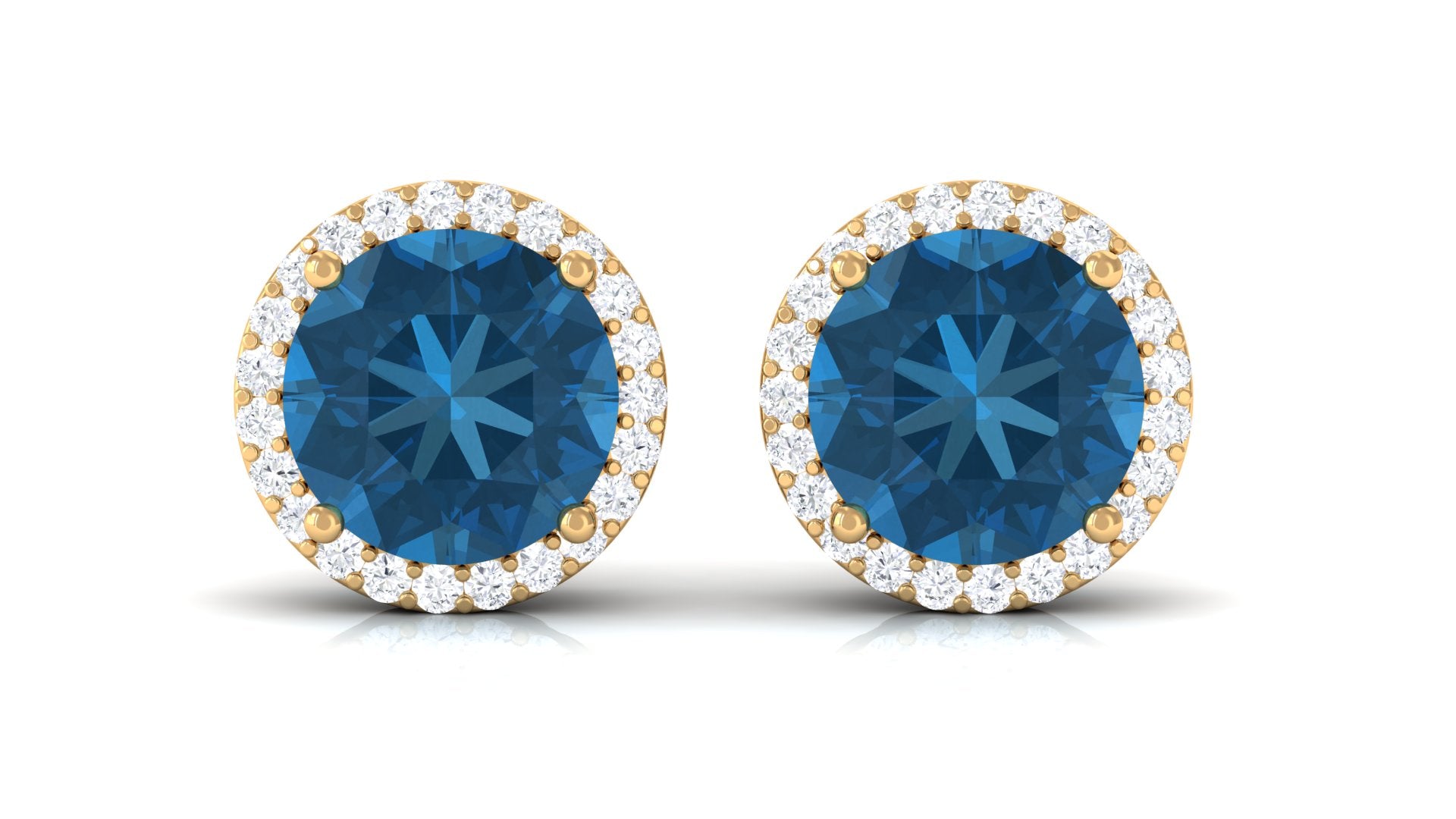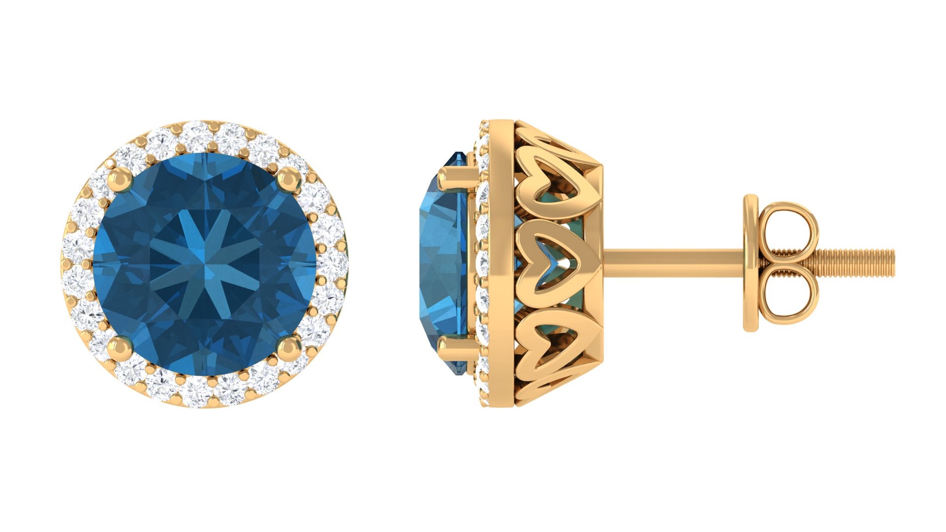 Create a unique style statement with these stud earrings adorned with round-shaped london blue topaz set in a prong setting while the diamond shimmers around it. From dinner dates to casual day outs, these diamond earrings have been designed to add an instant touch of glamour to any outfit. Crafted with proper care and precision, secured with screw back closures to keep them intact in the earlobe.
