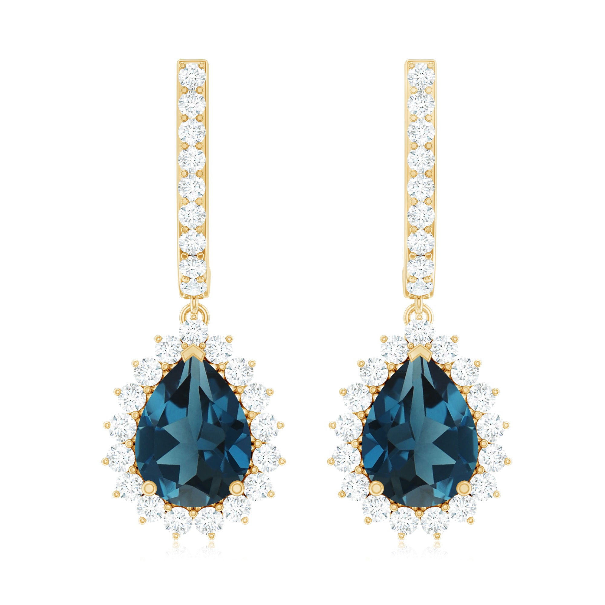 Step into effortless style with these London Blue Topaz Hoop Earrings, designed to bring sophistication and sparkle to any occasion. Designed with a 6X8 MM pear cut London Blue Topaz at the center, surrounded by a halo of round cut diamonds that add brilliance to the design. The vivid blue stone stands out beautifully, while the diamonds enhance its glow with a touch of refined luxury. The teardrop shape hangs from a sleek J-hoop, which is also adorned with small diamonds for an added shimmer. This thoughtful detail gives the Blue Topaz and Diamond Earrings an elegant finish that feels both modern and classic. With secure screw back closures, they stay comfortable and safe for all-day wear. Each gemstone is carefully selected for quality and clarity, ensuring a look that feels special yet easy to wear. Perfect for weddings, anniversaries, or personal milestones, these Pear Shaped Earrings are designed to capture attention while keeping their charm understated. Presented in a beautiful jewelry box, they are ready to gift or add to your own collection. The Blue Topaz Drop Earrings reflect style, confidence, and grace, offering a piece that shines with meaning and beauty for years to come.