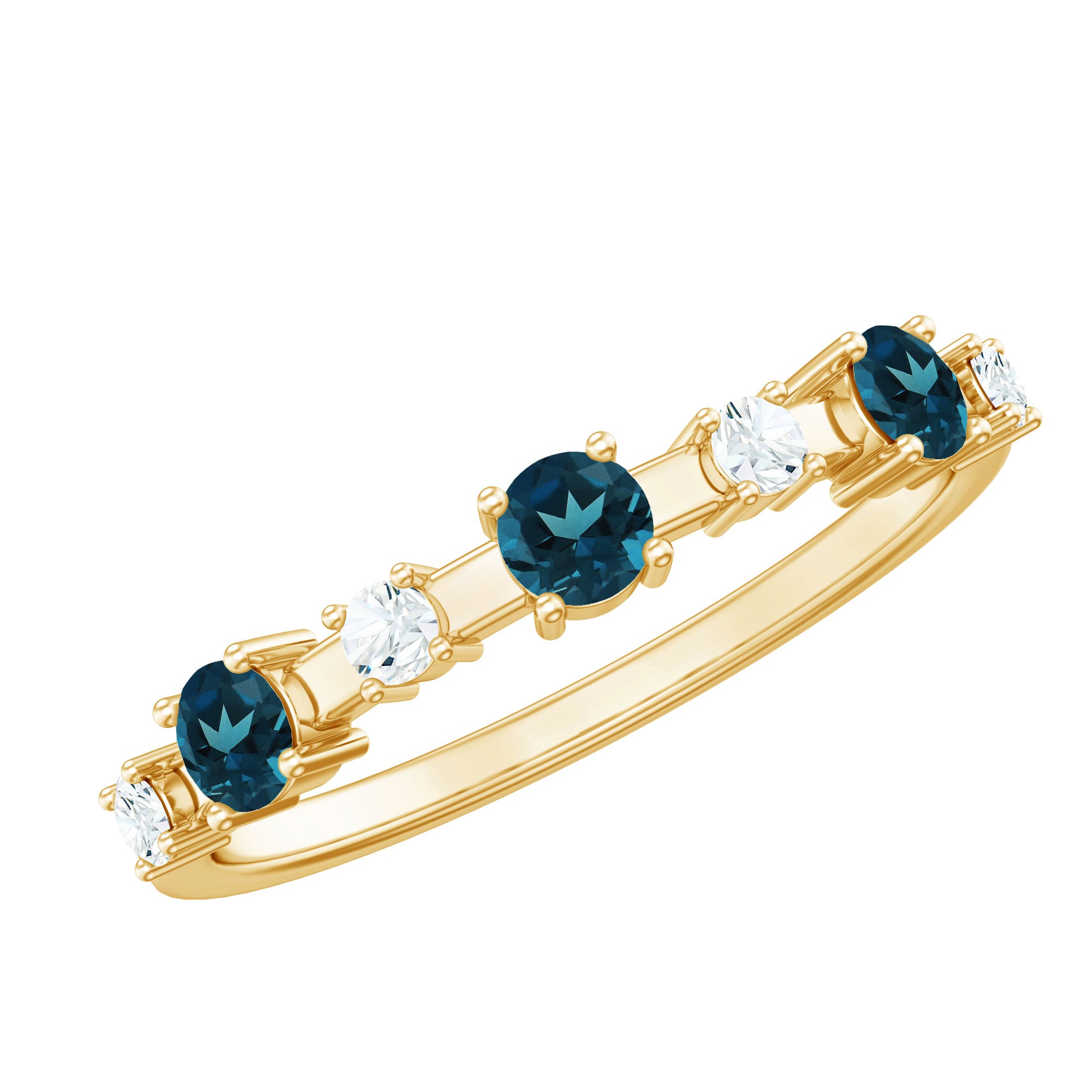 Present her with a gift that embodies both elegance and emotion. Crafted for significant occasions or simply to express your affection, this London Blue Topaz Eternity Ring adds a sophisticated element to any jewelry collection. The design showcases round shaped London Blue Topaz stones alongside round shape diamonds, resulting in a striking contrast between dark and light. The alternating arrangement enhances visual appeal and imparts a contemporary vibe, while the secure prong setting ensures that each stone remains firmly in place for enduring wear. Ideal for stacking or wearing solo, the half eternity design provides a graceful appearance that is both captivating and timeless. Whether she favors a minimalist aesthetic or enjoys combining different styles, this Half Eternity Stacking Ring seamlessly adapts to her individual preferences. Meticulously crafted with a focus on quality, using AAA grade london blue topaz and HI-SI grade diamonds, it is designed for durability and comfort throughout the day. Available in US sizes 3 to 13, locating the perfect size is straightforward. This Blue Topaz and Diamond Band is presented in a sophisticated jewelry box, making it a considerate gift that is ready to be given for birthdays, anniversaries, or simply to show you care.