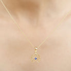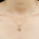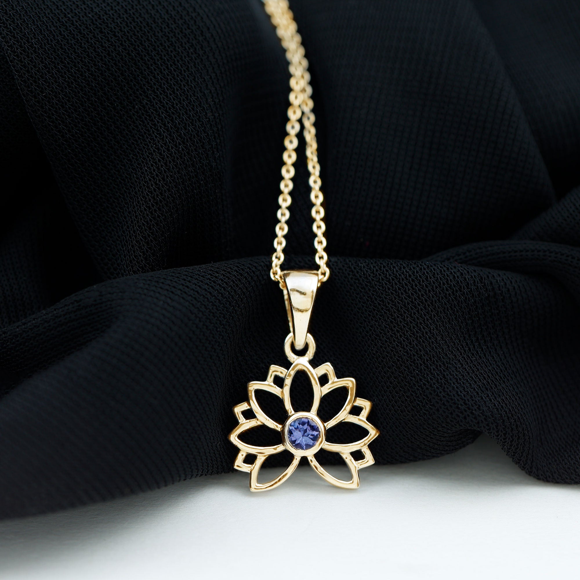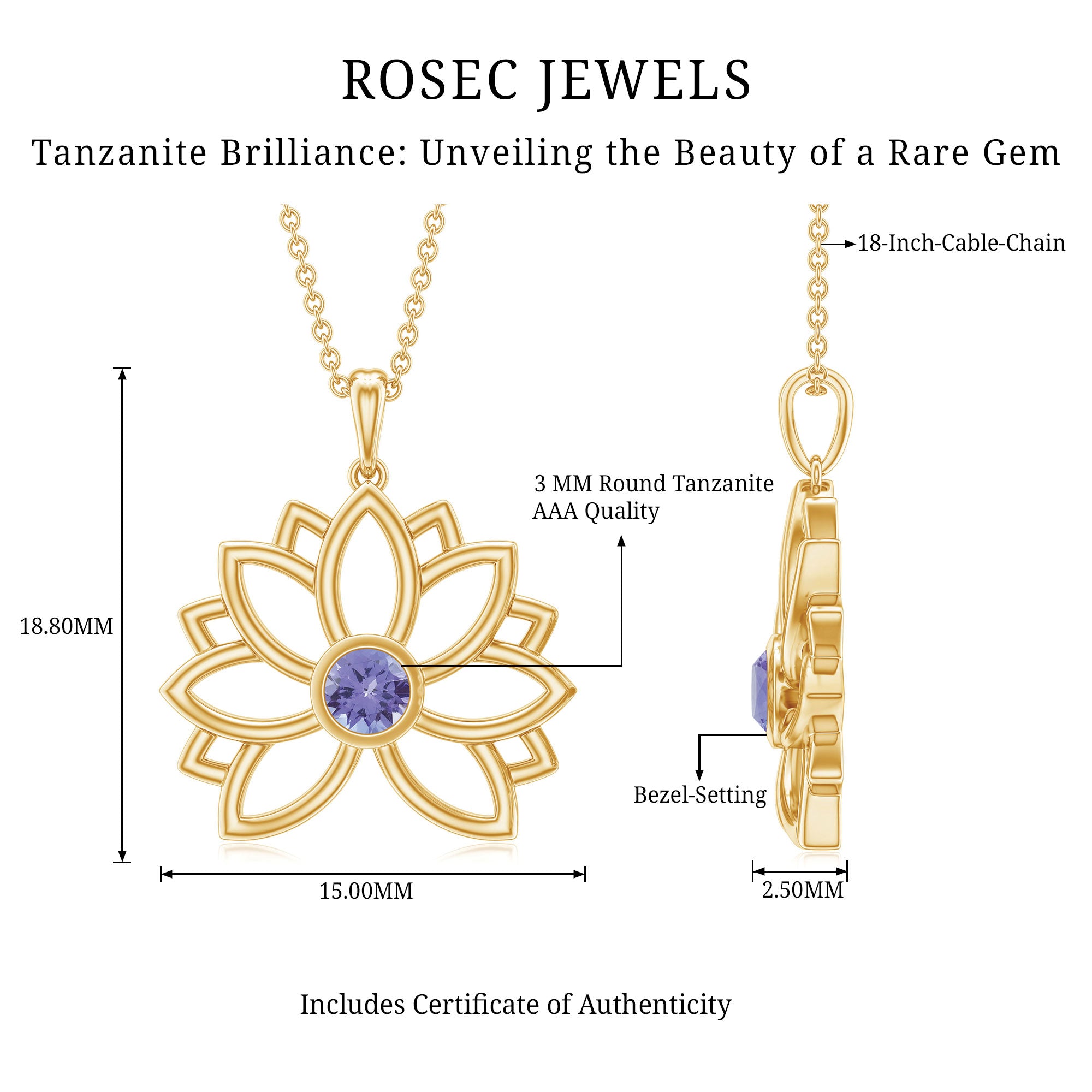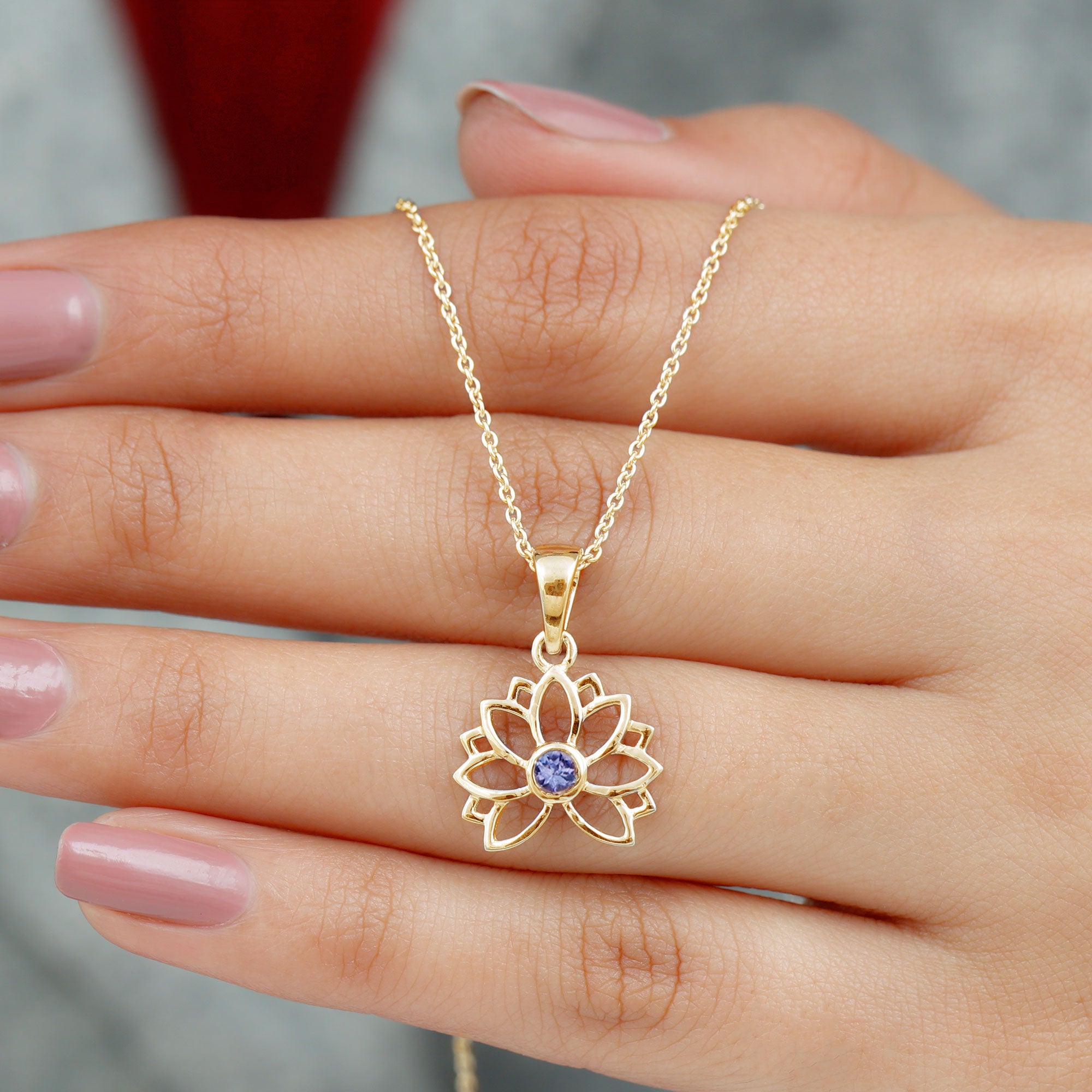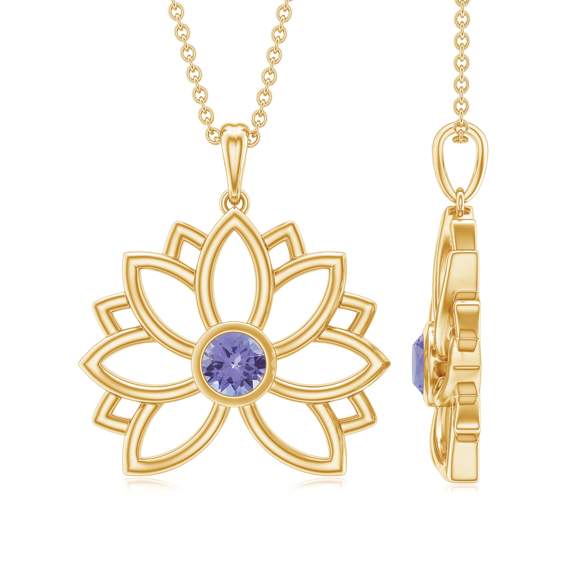 Lotus Pendant has stunning Round Solitaire Tanzanite stone encased in bezel setting to enhance the beauty of Floral Charm Necklace. Solid Gold is used to craft this enchanting piece. Stack it or wear alone for statement look.