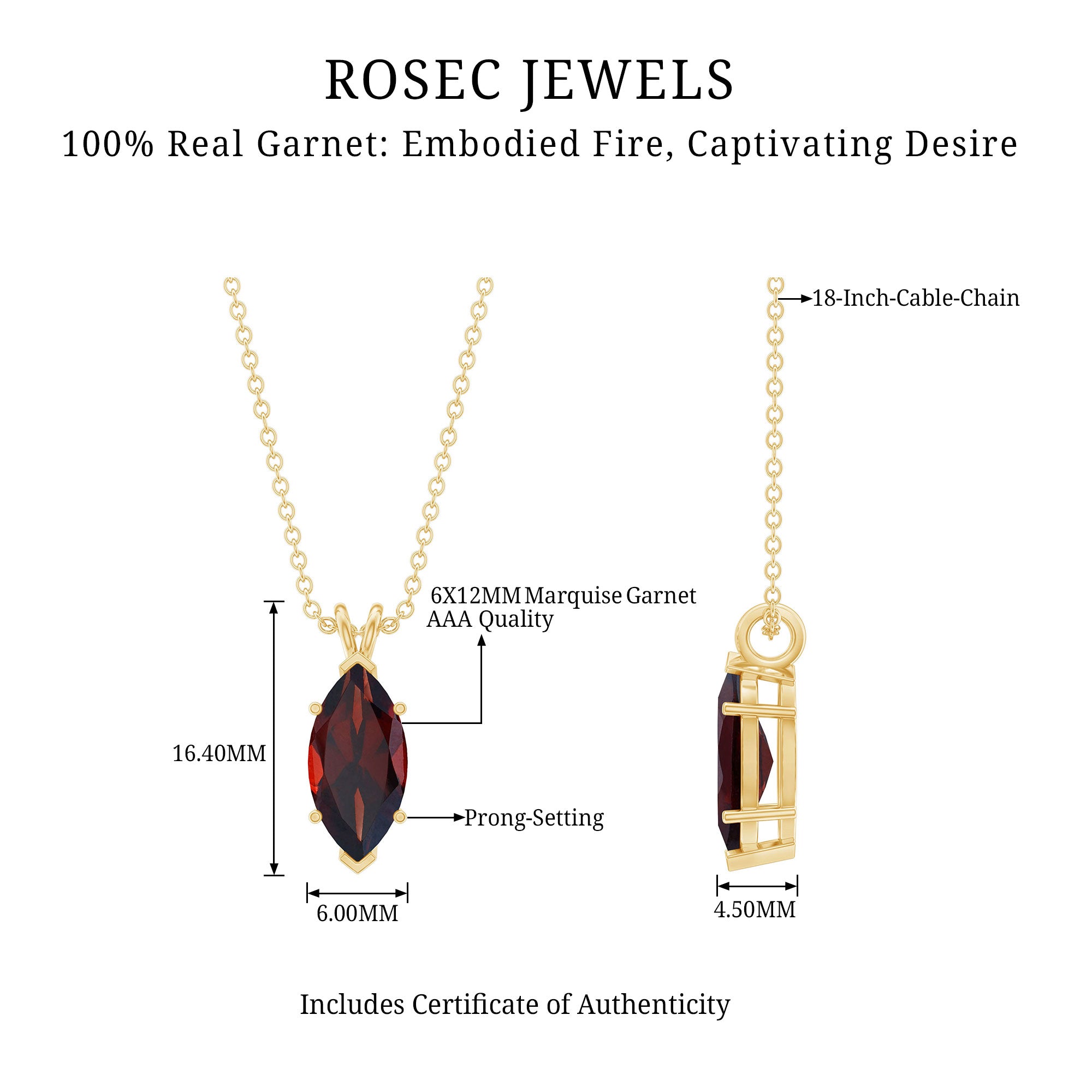 Chic and striking, this Garnet Pendant Necklace boasts a beautiful and sophisticated design that highlights a modern cut of stone. The symbolism of this Garnet Locket centers around love, passion, and protection. It is closely linked to feelings of romantic love, friendship, and loyalty. This Marquise Cut Pendant showcases genuine garnet, thought to spark desire, enhance emotions, and foster warmth and understanding in relationships. This January Birthstone Necklace is made from yellow gold plated silver and features a 6X12 MM marquise cut garnet set in prong setting with a rabbit ear bail. Hanging from a strong chain, this Garnet Solitaire Necklace is sure to captivate onlookers. Radiating sophistication and timeless charm, this Real Garnet Necklace creates a stunning contrast with the deep color of AAA Quality Garnet and gleaming polished metal. It offers a luxurious appearance, providing a subtle yet significant enhancement to your daily wardrobe. This 2 Carat Necklace also serves as a beautiful January birthstone gift or a celebration of a shared milestone. It channels your inner royalty and shines effortlessly.