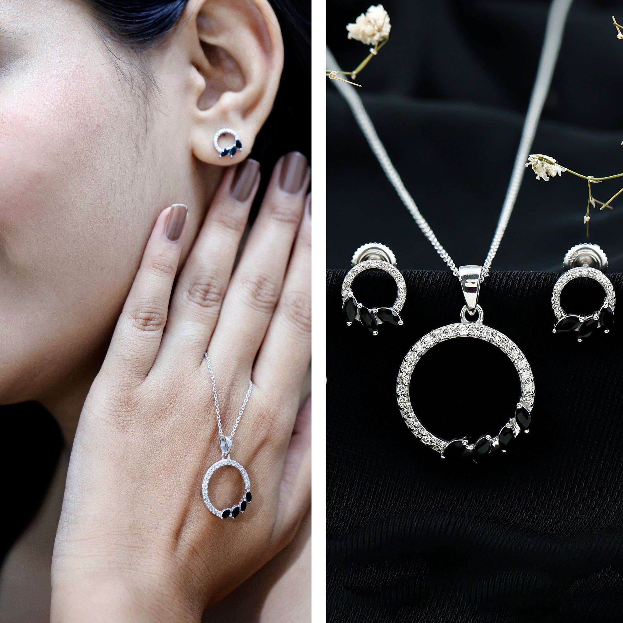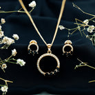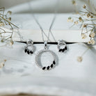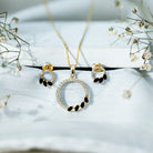 An embodiment of eternal togetherness and undying love- our exquisite eternity jewelry set comprises a sparkling pendant necklace and a complementing pair of earrings. With an open circle dotted with dainty round Diamond and marquise cut black onyx, the eternity jewelry set exudes an aura of sophistication that makes you keep reaching out to it even after a few wears. The Diamond and black onyx dazzle brilliantly in contrast to each other. Don it on an evening out or as something that sprinkles magic to your special days.