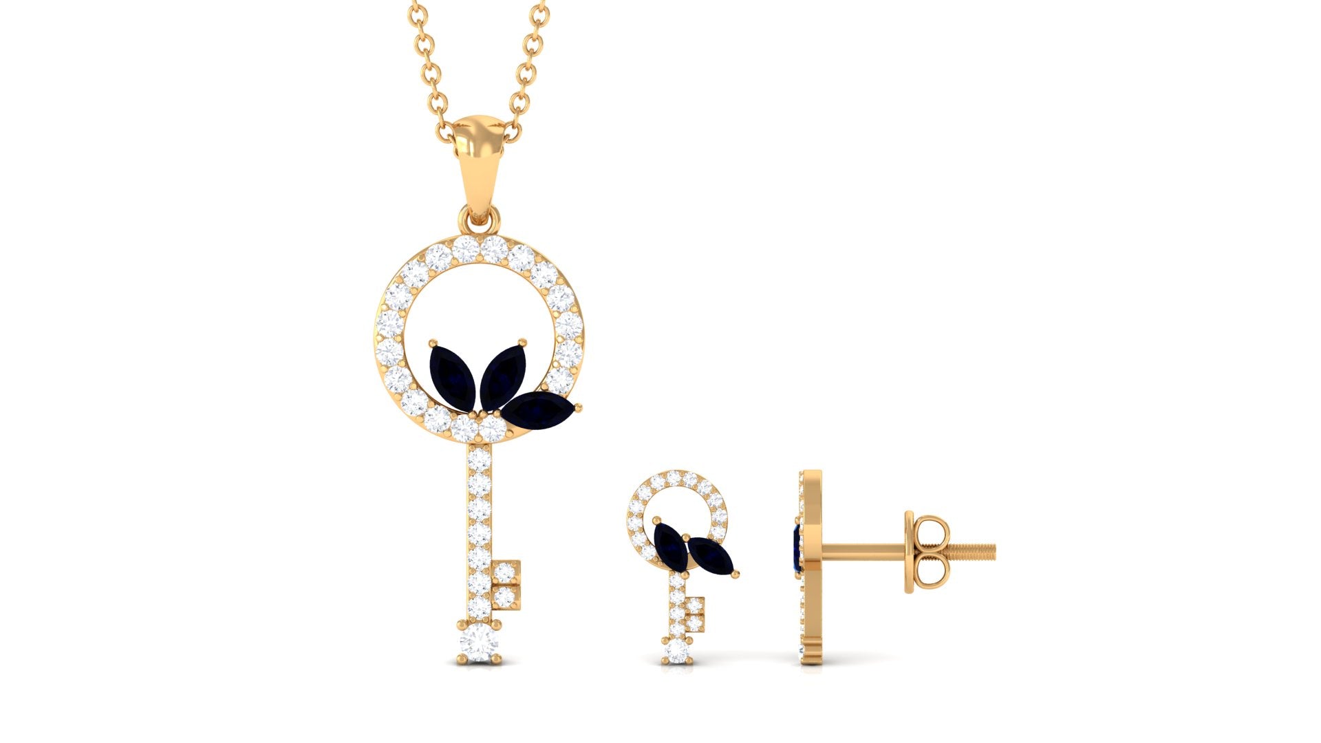 This key jewelry set highlights a shimmering key motif, round Diamond, and marquise shape blue sapphire. The simple design represents the abundant possibilities that life has in store for everyone. It comprises a pendant necklace and screw-back stud earrings. Wear them as a coordinated jewelry piece to capture all the eyes. For an added sophisticated look, the jewelry set is a prong setting.