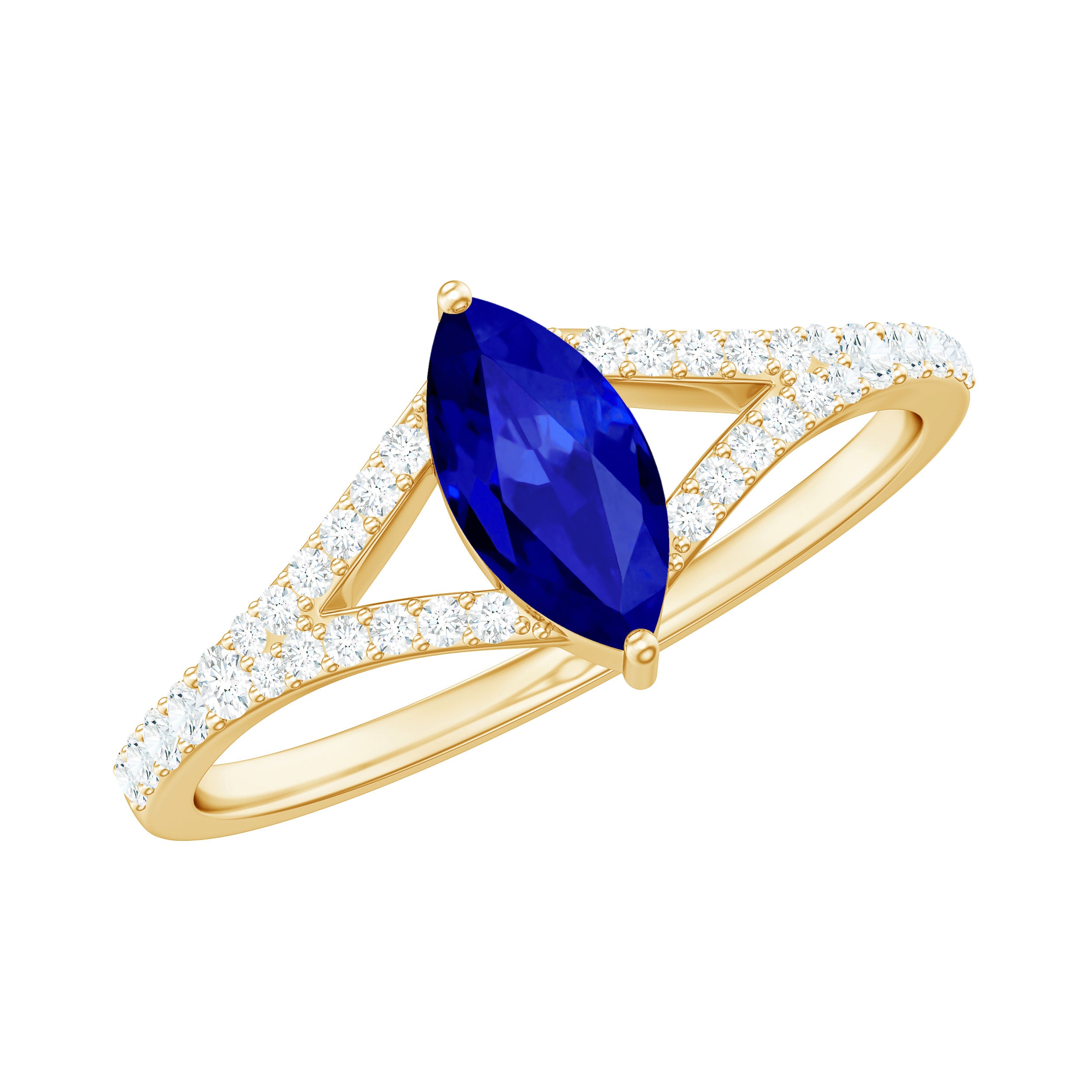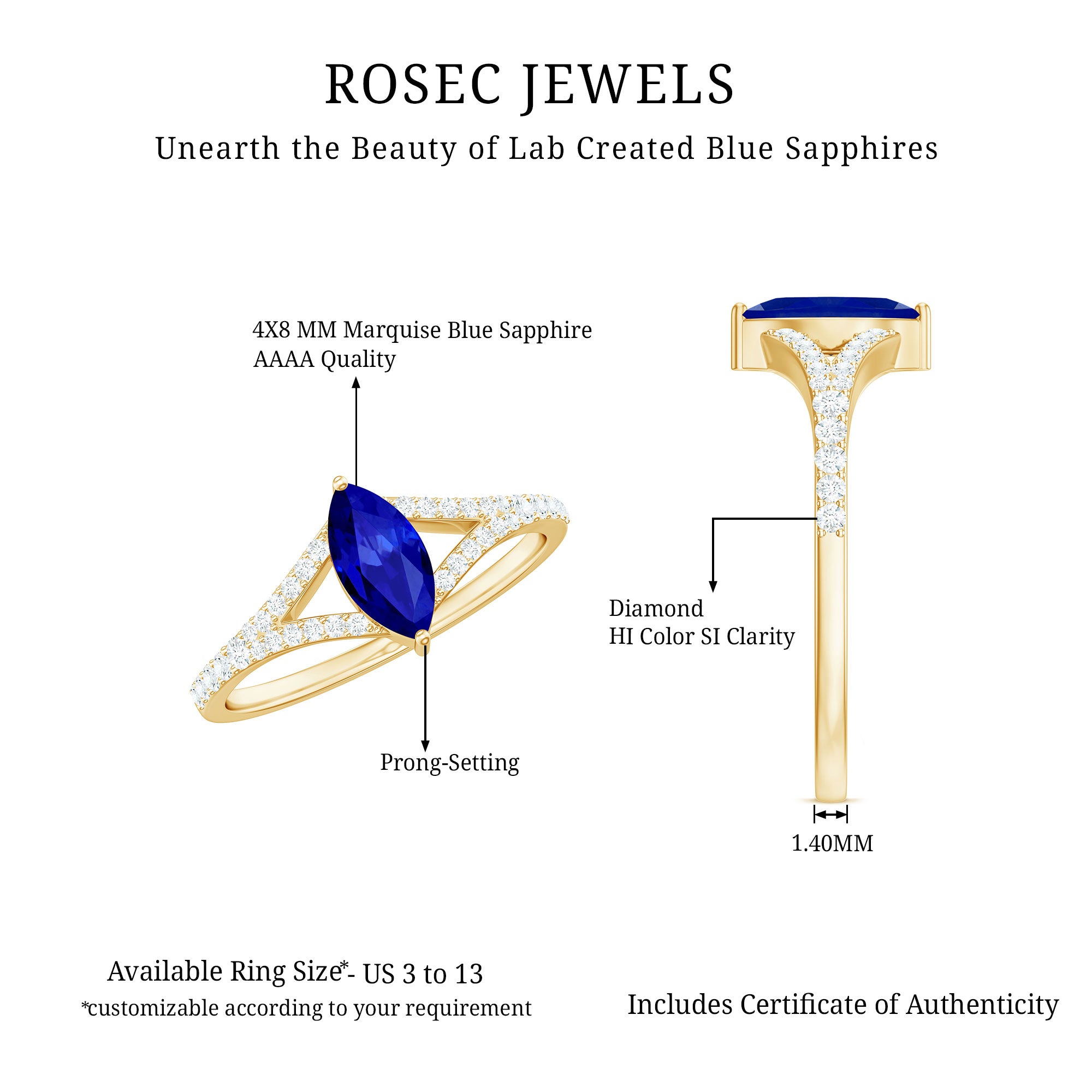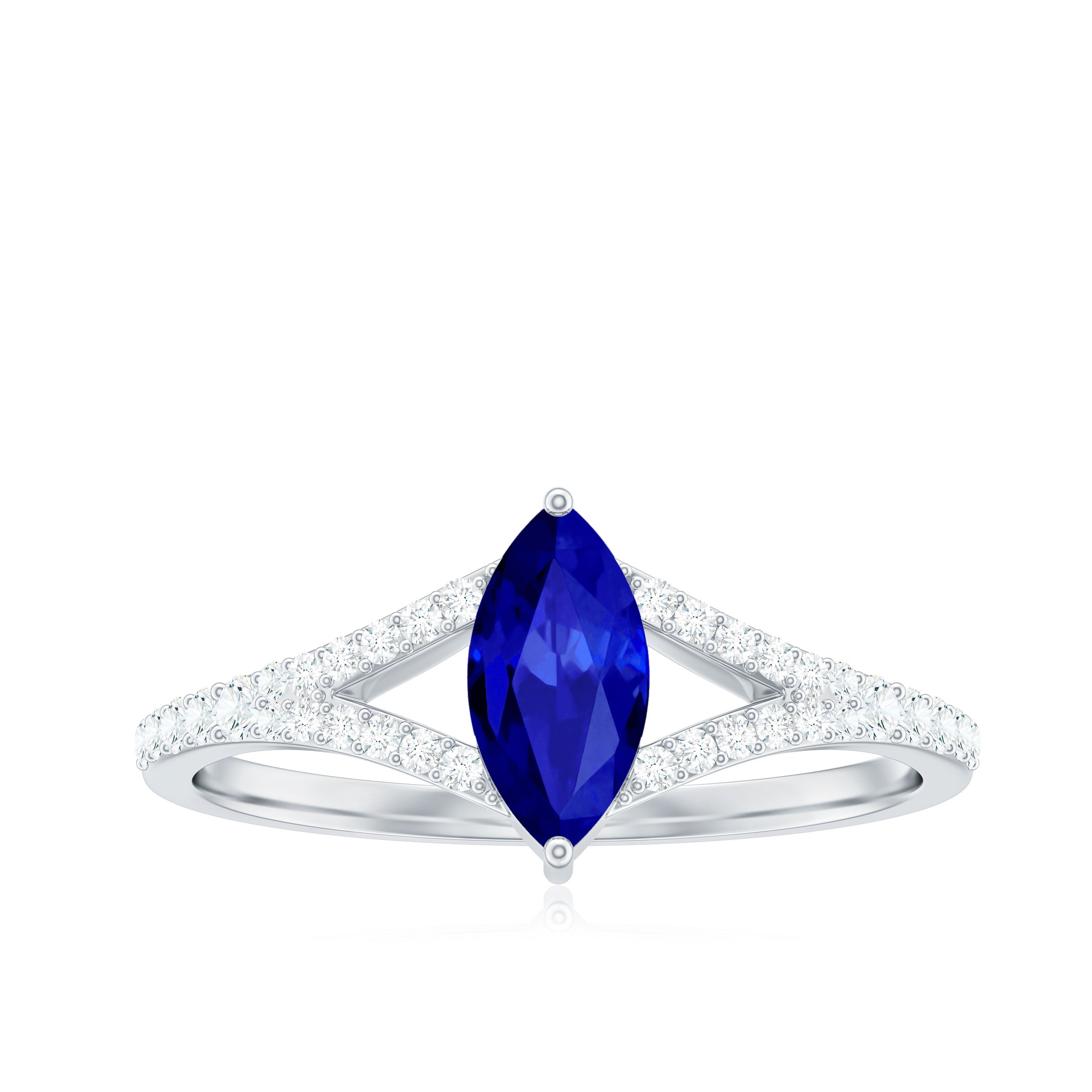Marquise Cut Created Blue Sapphire and Diamond Ring with Split Shank