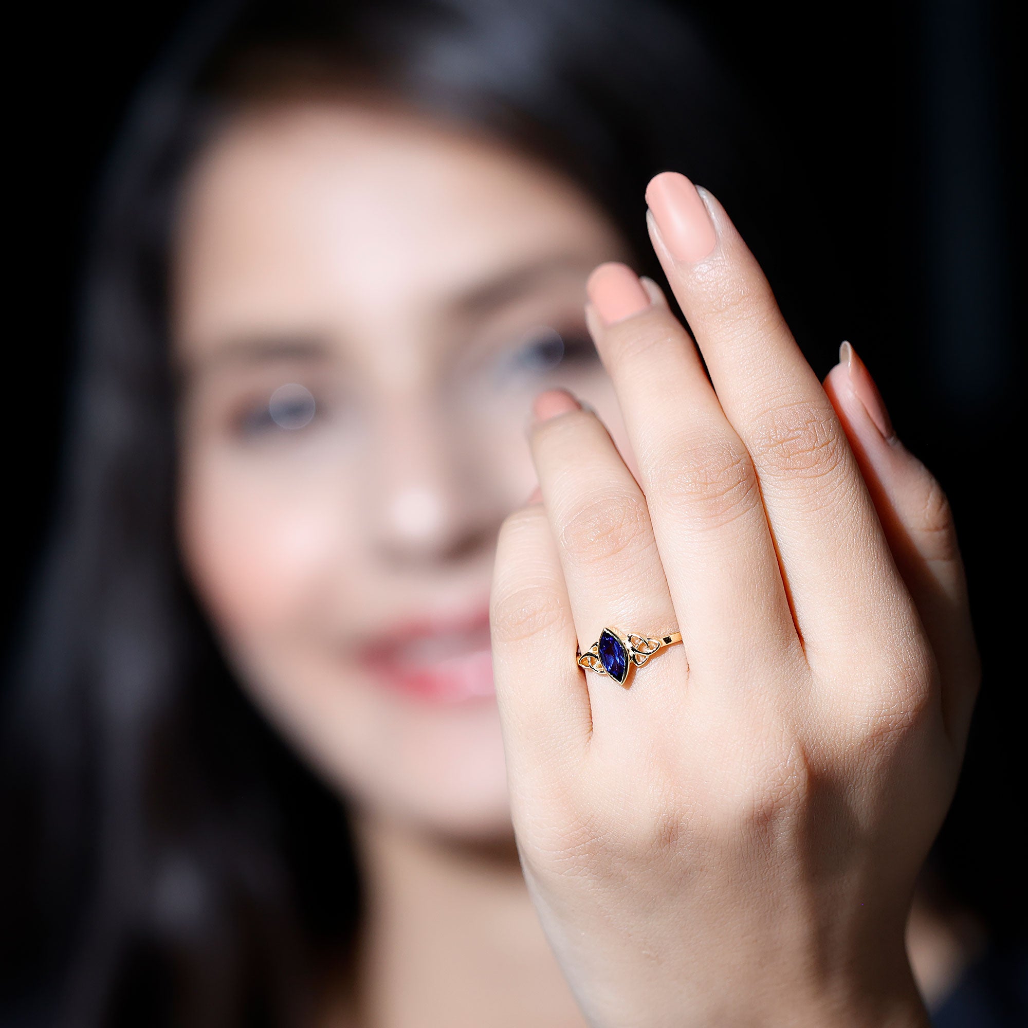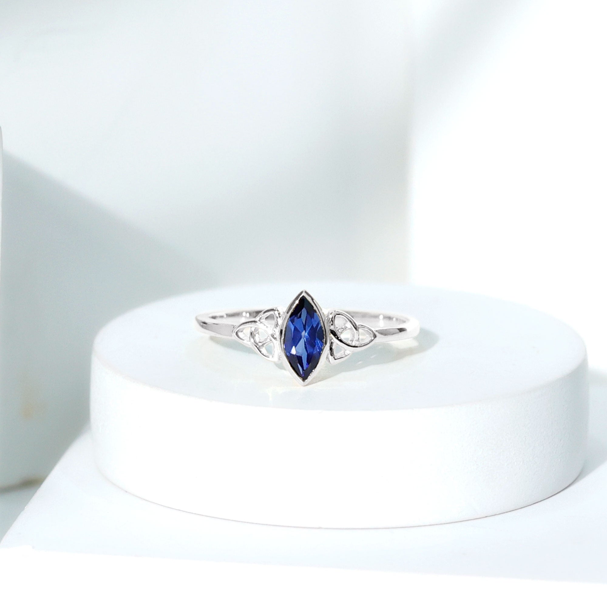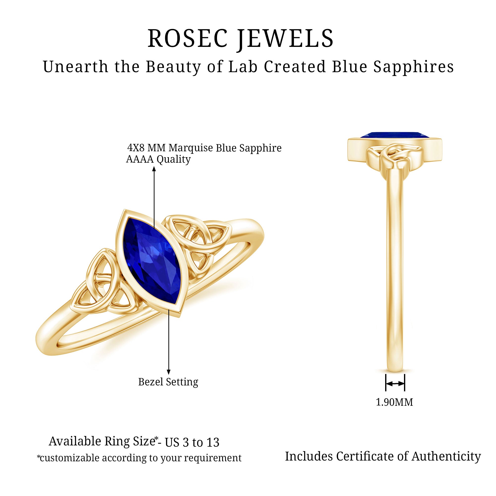 Marquise Cut Created Blue Sapphire Solitaire Celtic Knot Ring in Bezel Setting