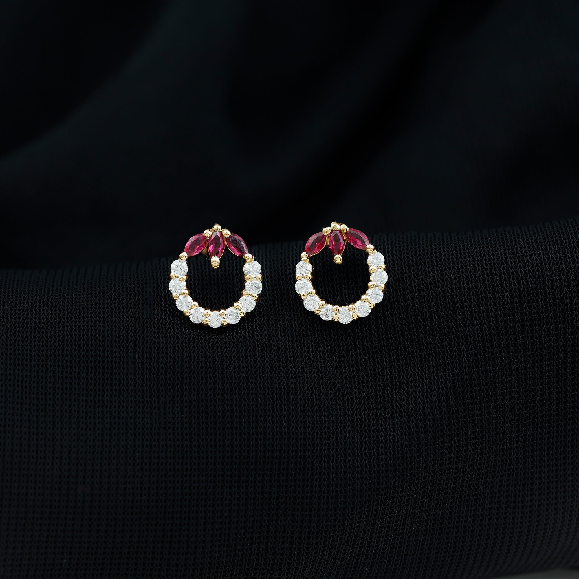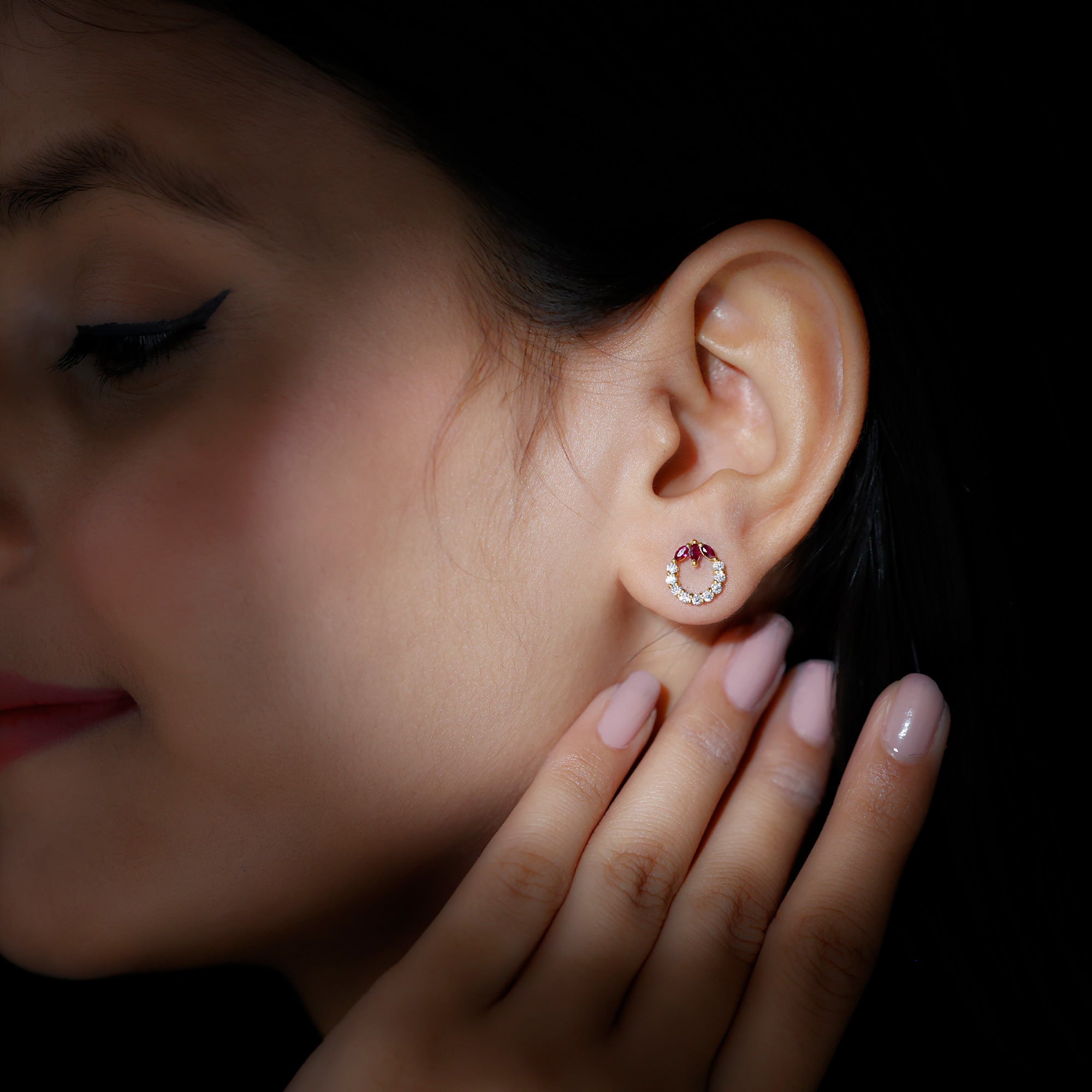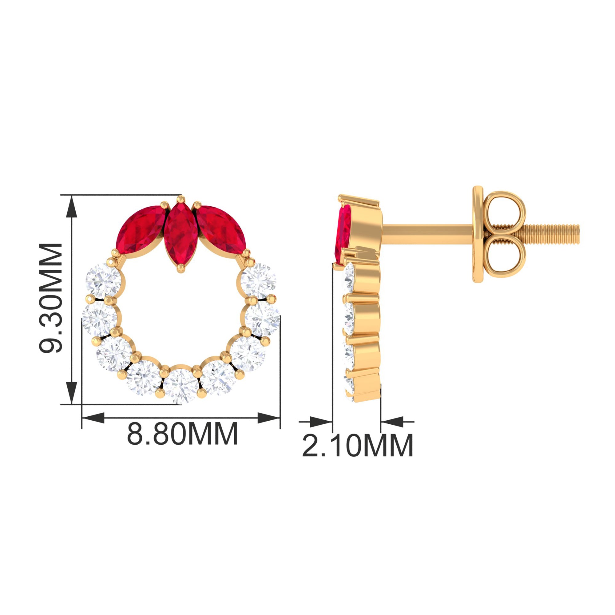 Elevate your style with these timeless eternity stud earrings. Featuring a continuous loop of round moissanite set in an eternity design, they are adorned with three marquise-cut created rubies for an added touch of glitz and glamour. The minimal prongs securely hold the created ruby and moissanite in place, creating a subtle yet captivating statement piece.