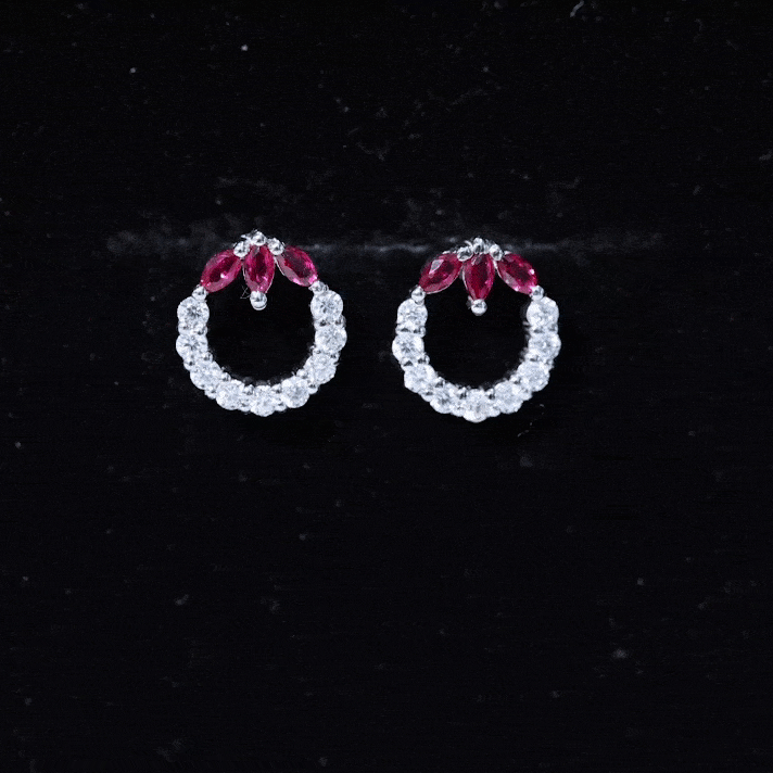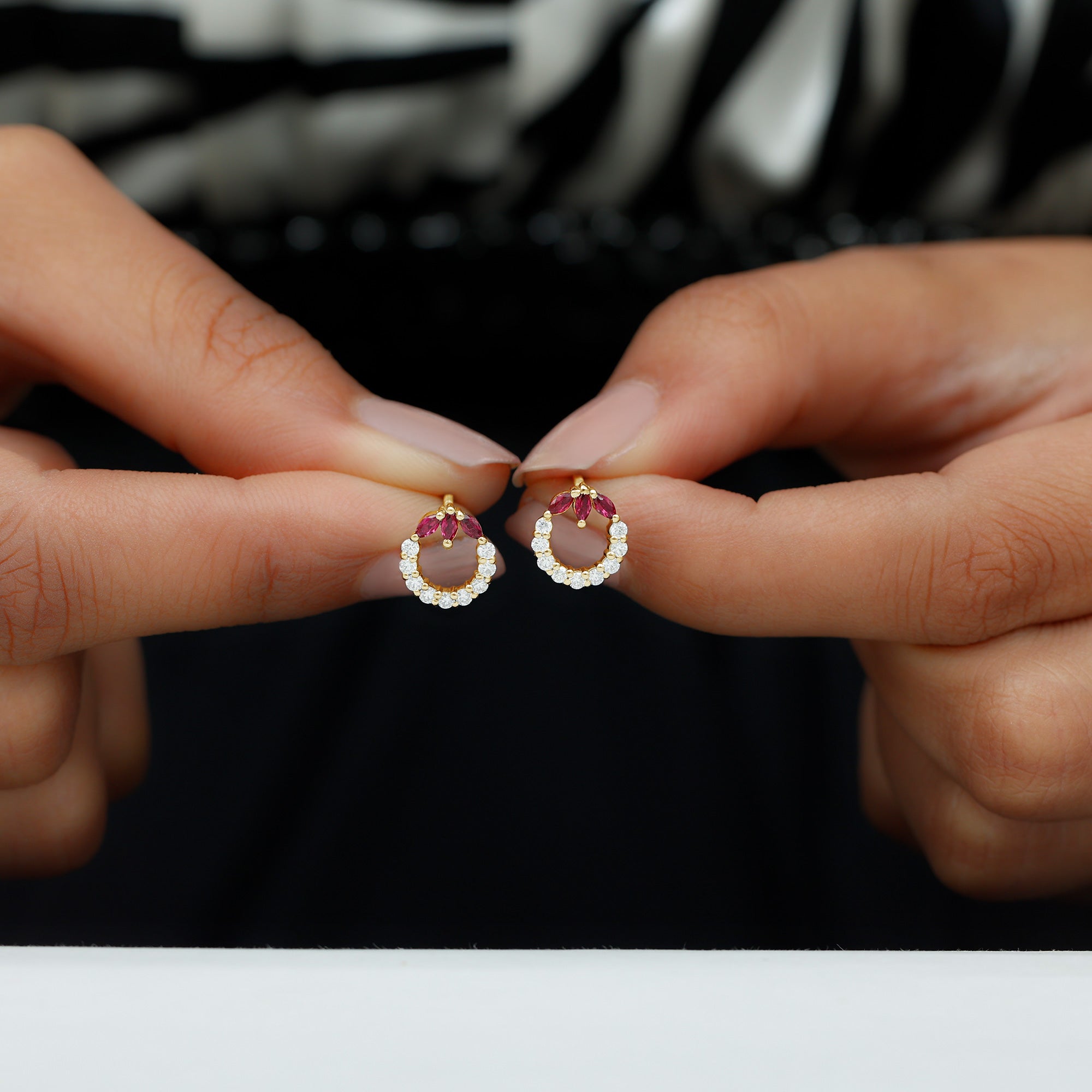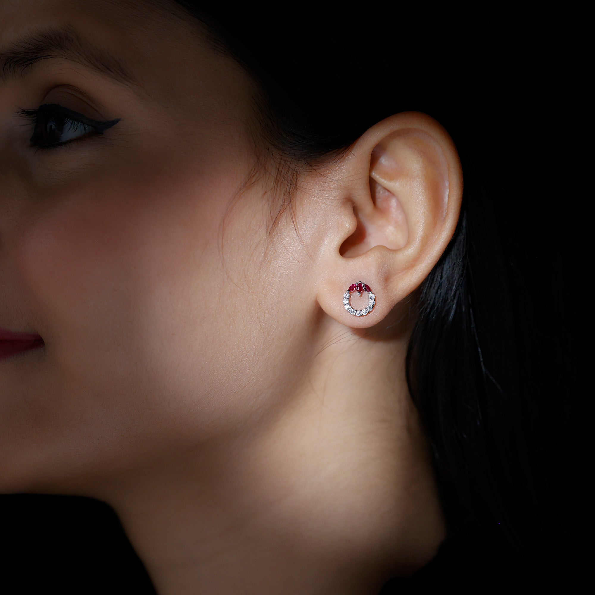 Elevate your style with these timeless eternity stud earrings. Featuring a continuous loop of round moissanite set in an eternity design, they are adorned with three marquise-cut created rubies for an added touch of glitz and glamour. The minimal prongs securely hold the created ruby and moissanite in place, creating a subtle yet captivating statement piece.