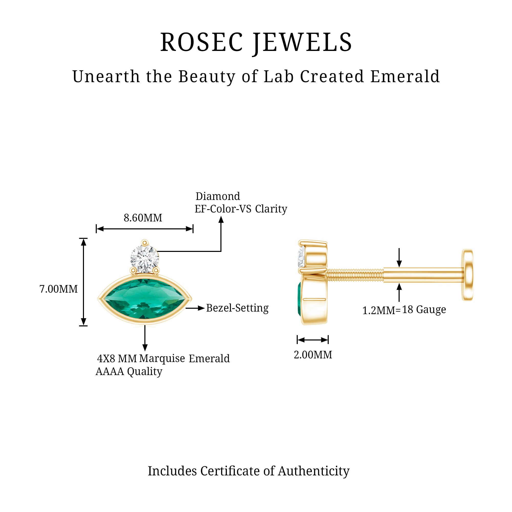 Our elegant Helix Earring features a beautiful Marquise Cut Lab Created Emerald securely set in bezel setting with a sparkling Moissanite, creating a timeless and sophisticated look. Crafted from high-quality metal, this Emerald Stud Earring offers a durable and luxurious feel that will elevate any outfit. Whether you are dressing up for a special occasion or adding some glamour to your everyday wear, this Dainty Earring is a must-have in your jewelry collection. Made for multiple piercings, it fits comfortably on the helix, cartilage, or upper lobe, letting you style it however you like, wear it solo for a dainty look or pair it with other earrings for a stacked style. The flat back closure keeps it secure and comfortable all day long, so you can enjoy its shine without any discomfort. This Emerald Cartilage Earring is crafted with fine attention to detail, making it a lovely addition to both simple and dressy outfits.