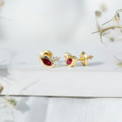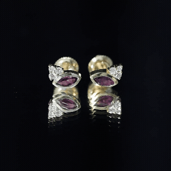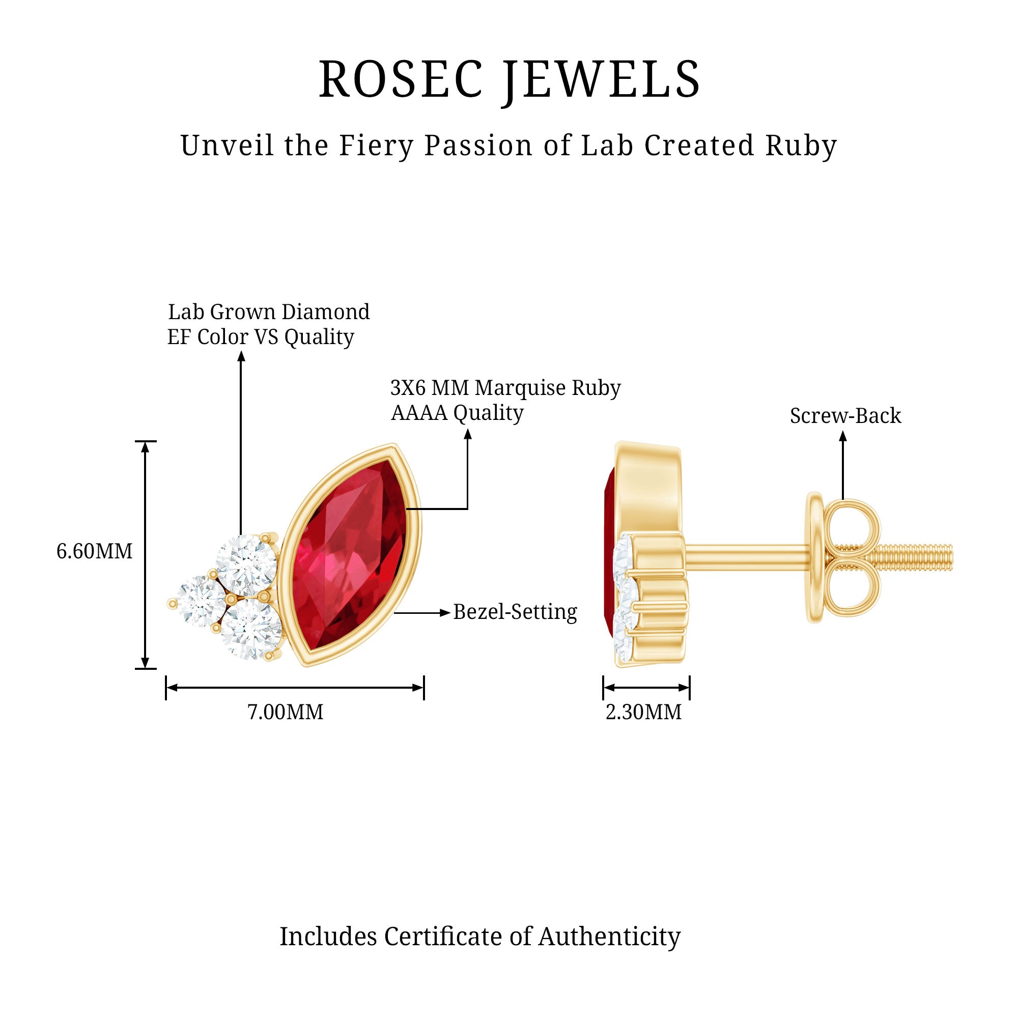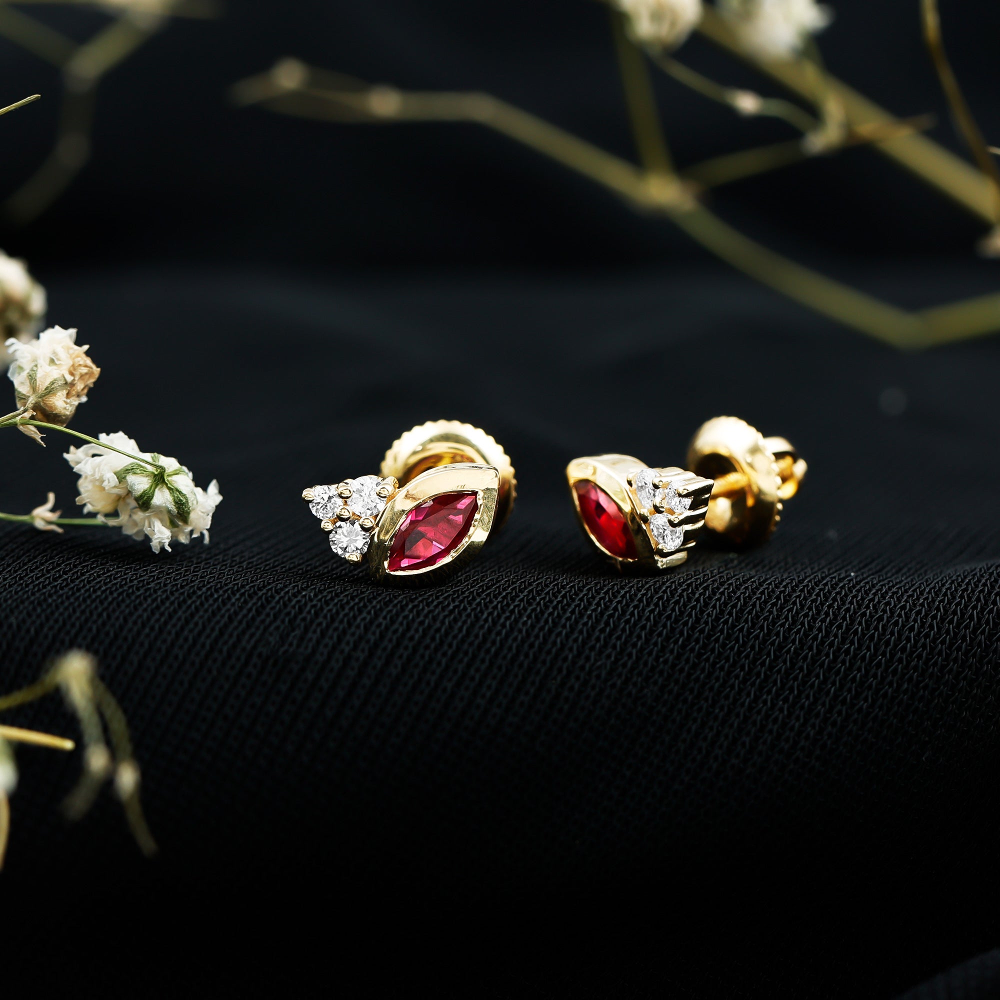 Add a bold pop of color and timeless beauty to your jewelry collection with these stunning Ruby Stud Earrings. Crafted in yellow gold plated silver, each earring features a vibrant 3X6 MM marquise cut lab grown ruby, set in bezel setting for a modern look. These AAAA quality ruby stones offer a rich and eye-catching shine that stands out with elegance. To add extra sparkle, a trio of round lab grown diamonds is set on one side of each earring. With their bright EF color and VS clarity, the diamonds create a beautiful contrast against the bold ruby, giving the Marquise Stud Earrings a balanced and refined look. Whether you are dressing up for a celebration or adding something special to your everyday outfit, these Ruby and Diamond Earrings are a perfect choice. Their simple yet striking design makes them easy to wear, while their screw back closure ensures they stay secure and comfortable. Made with lab-grown gemstones, these Silver Ruby Earrings are not only beautiful but also an ethical and eco-friendly choice. They are a great way to enjoy luxury with a clear conscience. Ideal for gifting or treating yourself, they blend classic charm with modern style, a timeless accessory you will reach for again and again.