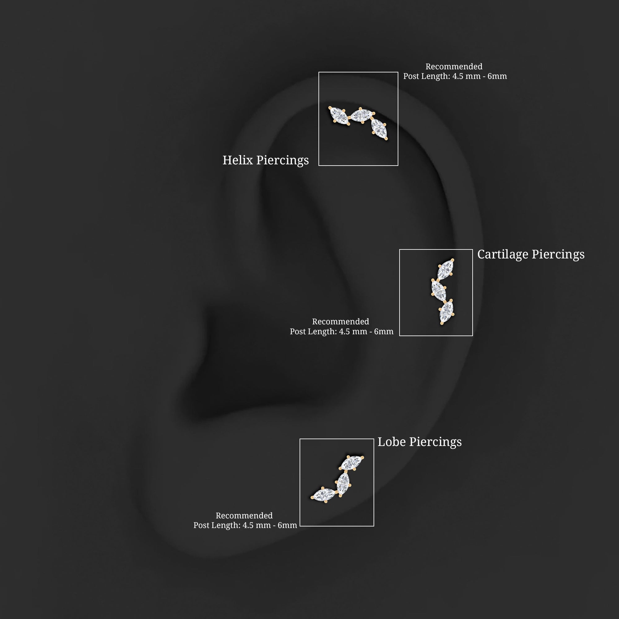Enhance your daily style with this stylish Cartilage Earring, made from luxurious Gold and featuring Marquise Cut Moissanites set in Prong Setting for a charming flair. Perfect for Conch, Cartilage, Upper Lobe, or Helix Piercings, this 3 Stone Earring offers versatility with your choice of Flat Back or Ball Screw Back Closure for secure wear. Whether gifting it as an Anniversary present to your loved one or styling it for yourself, this Helix Earring is a lovely and stunning addition to any jewelry collection.